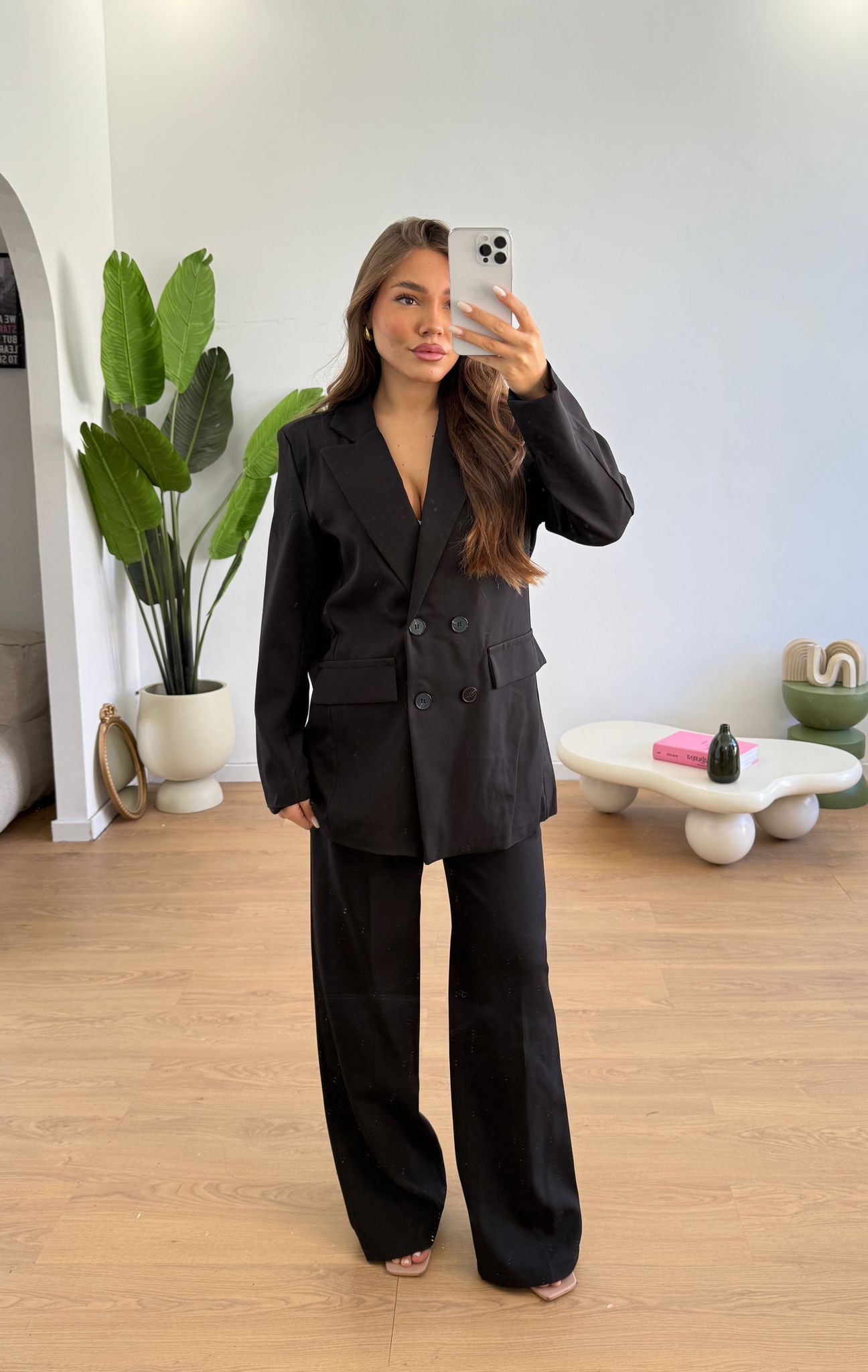 Coordinato da donna composto da giacca a doppio petto con spalline imbottite e foderata internamente mentre il pantalone ha l estitico in vita sul retro e ha una vestibilità morbida sulle gambe e vestirà bene fino ad una M/L
