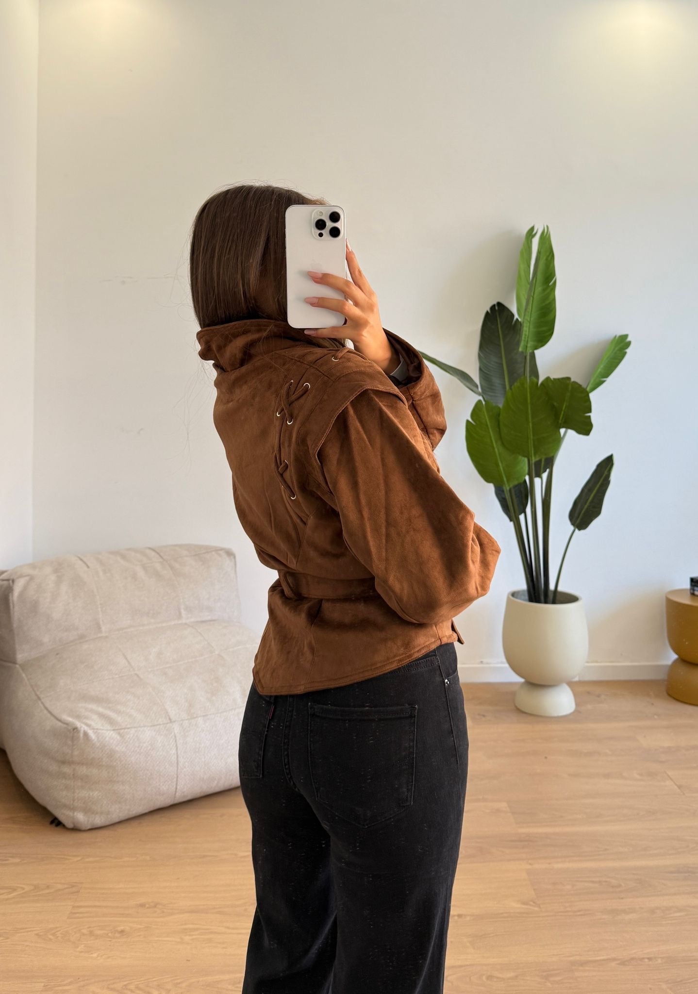 Giubbino da donna in camoscio con cintura compresa e veste regolarmente la propria taglia e la modella indossa taglia S/M