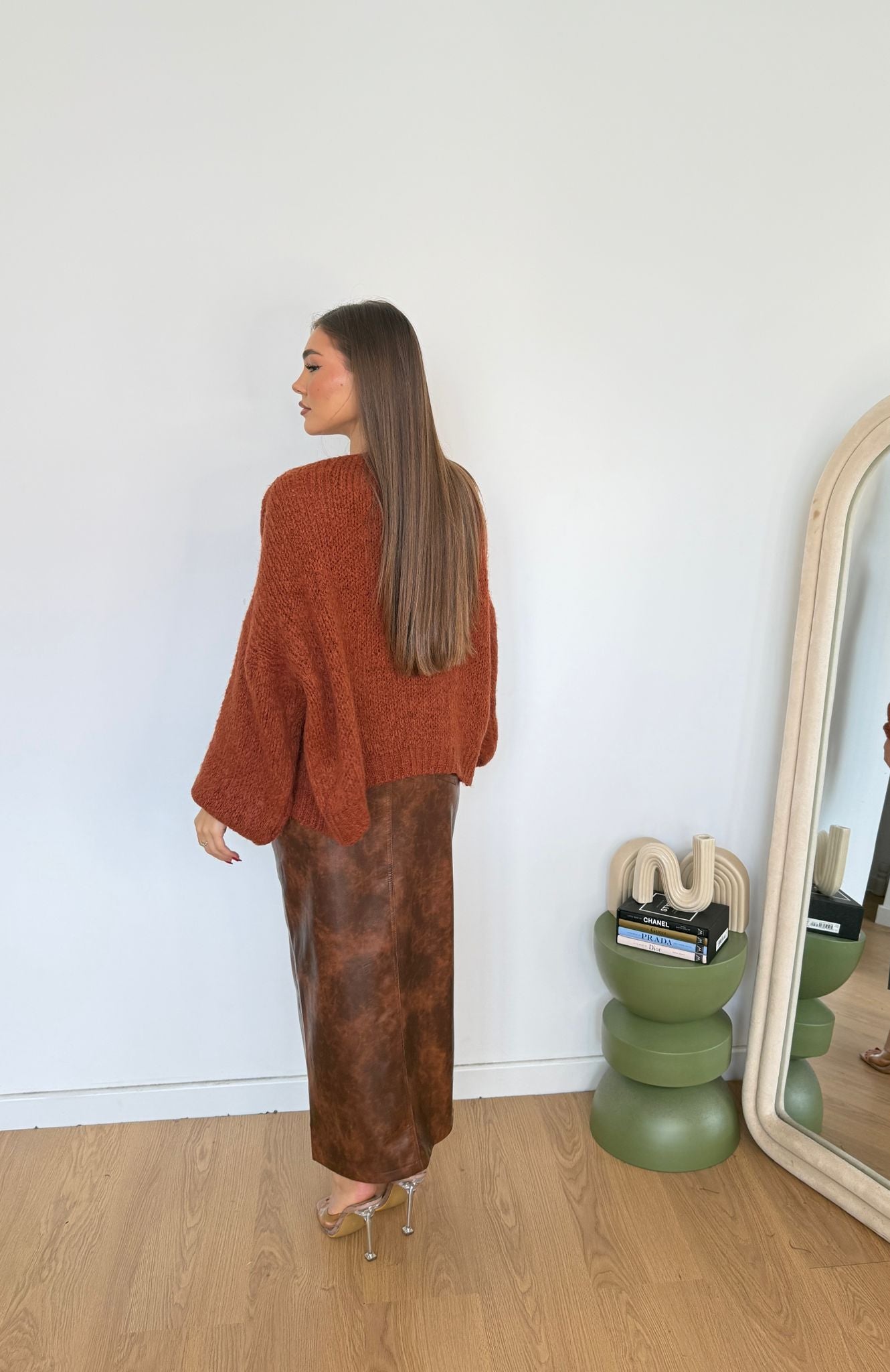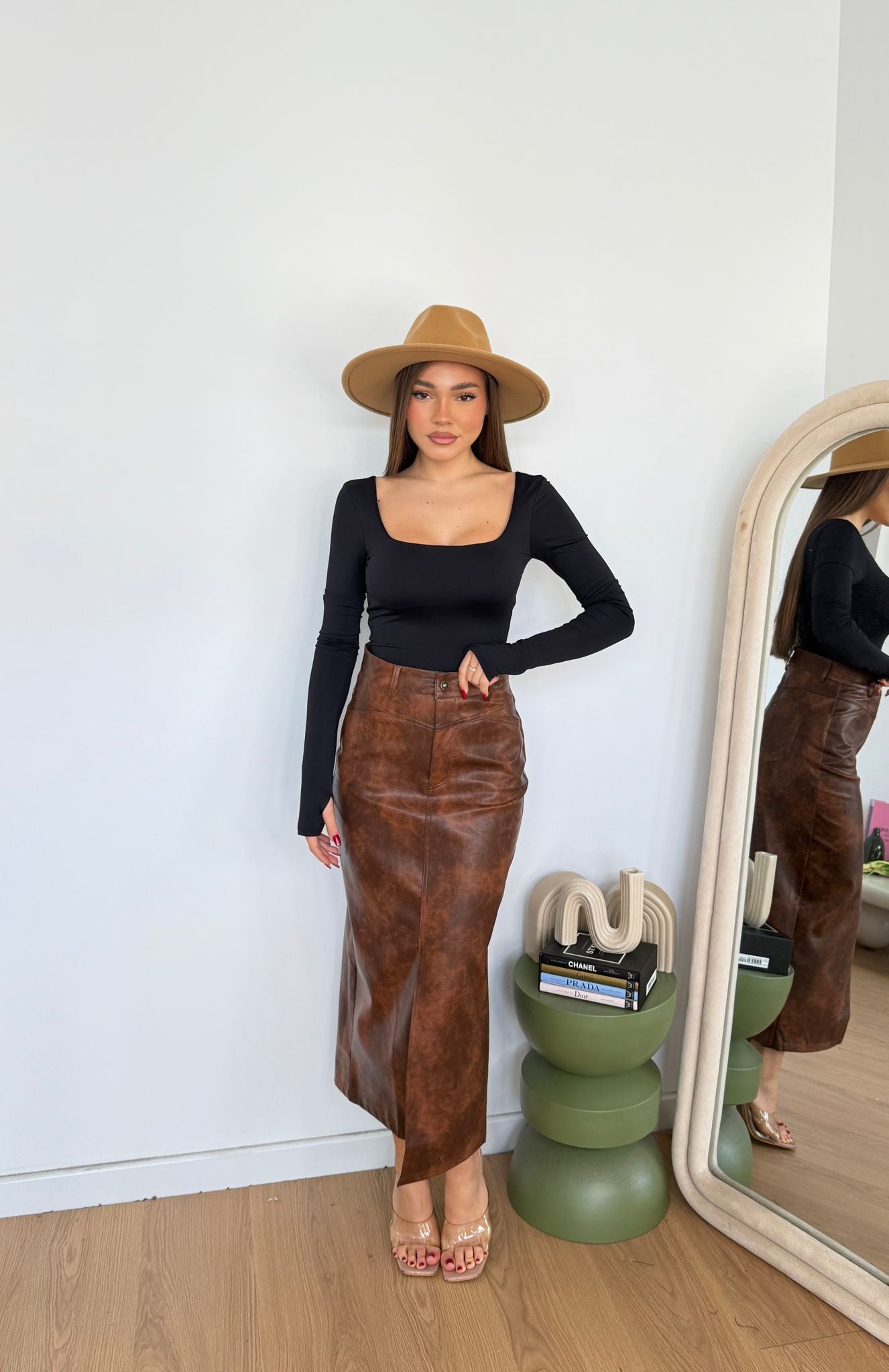 Gonna da donna in ecopelle, top quality e veste regolarmente la propria taglia, la modella indossa taglia S