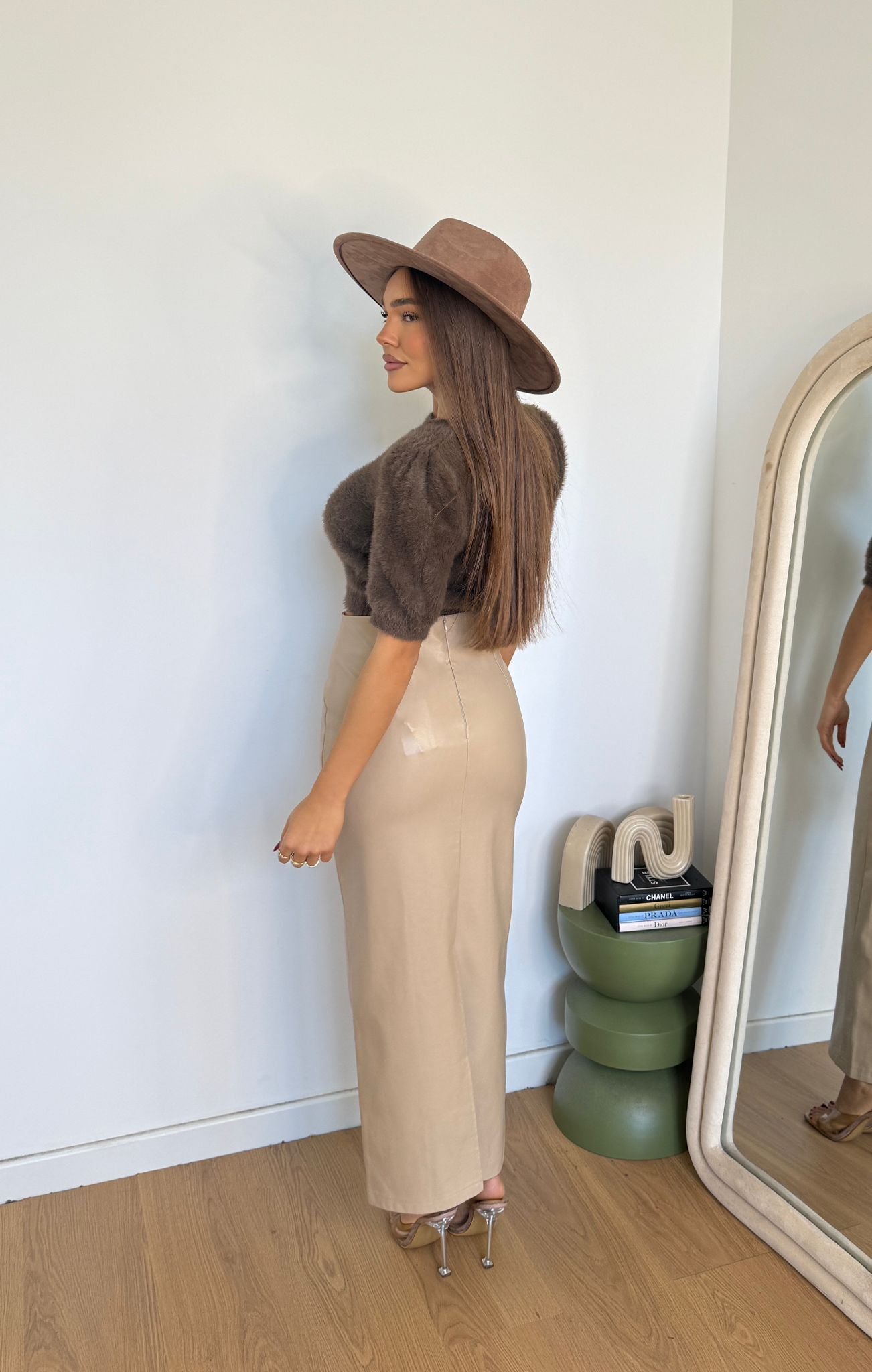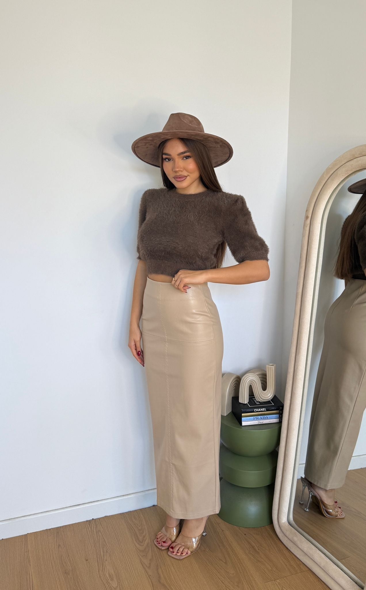 Gonna Da donna in ecopelle con chiusura zip e spacchetto sul retro, veste regolarmente la propria taglia e la modella indossa taglia S