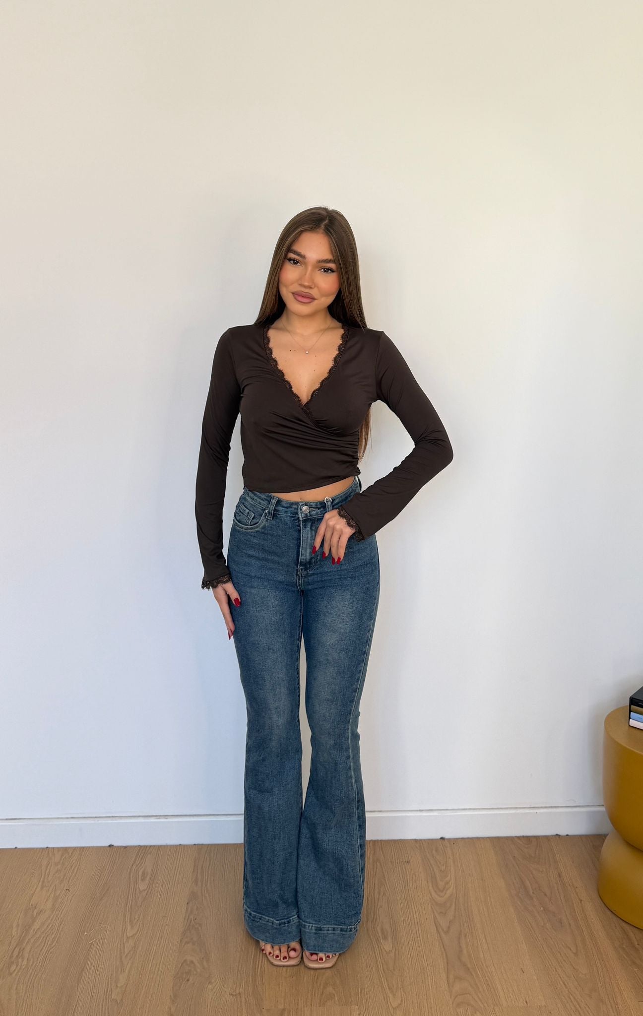 Jeans da donna a zampa tessuto elasticizzato e veste regolarmente la propria taglia e la modella indossa taglia XS