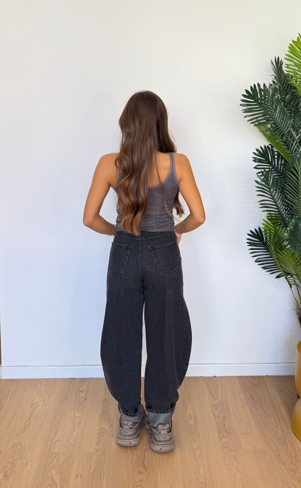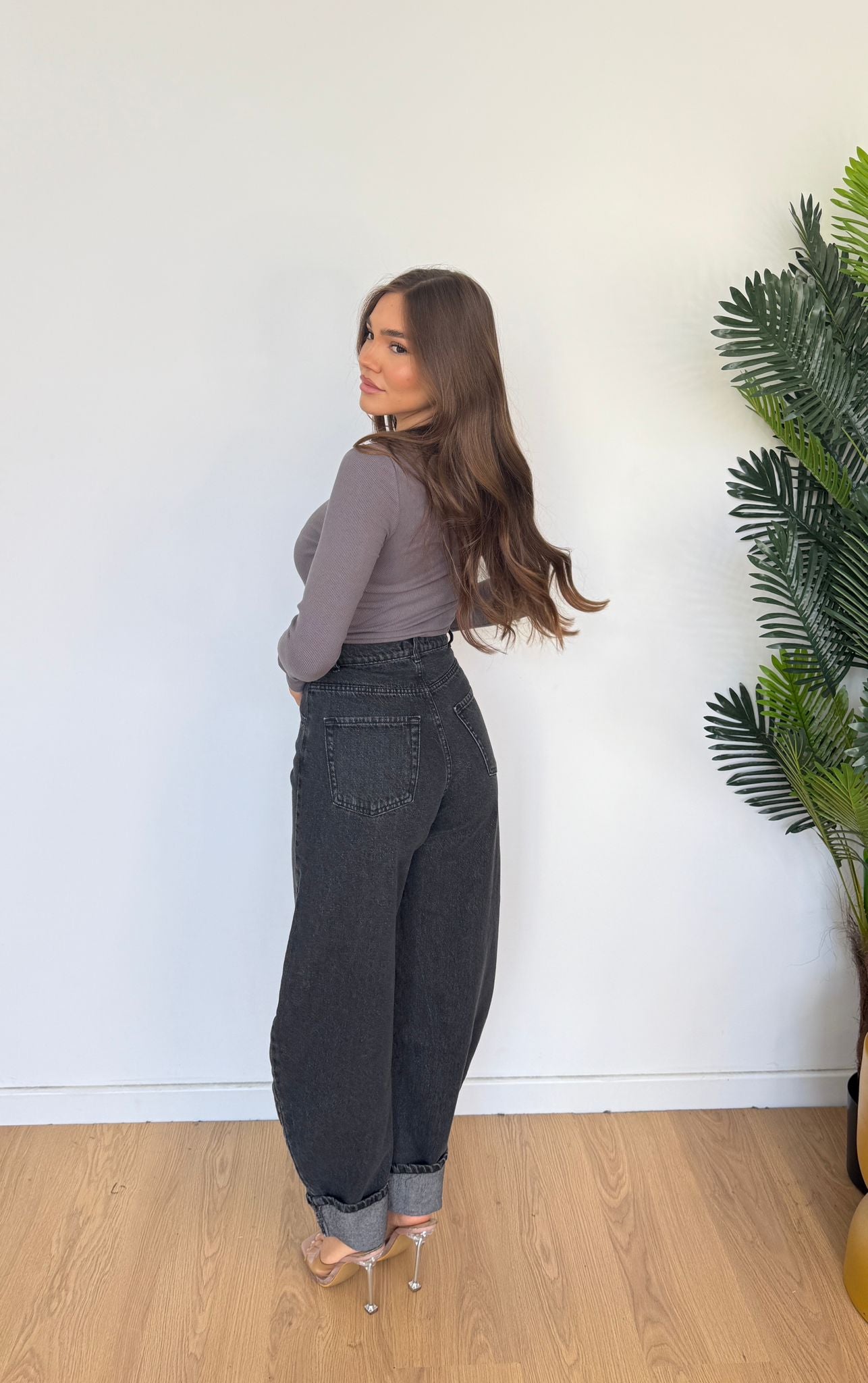 Jeans da donna in denim nero modello ballon e veste regolarmente la propria taglia e la modella indossa taglia XS