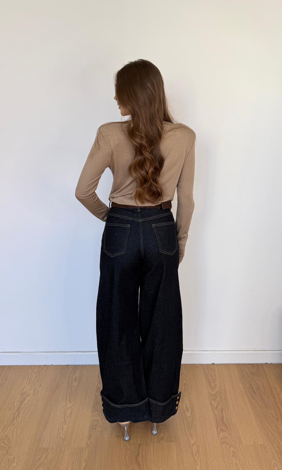 Jeans da donna in denim scuro tela fissa non elasticizzato con cintura compresa e piegoni sul finale cucito, veste regolarmente la propria taglia e la modella indossa taglia XS