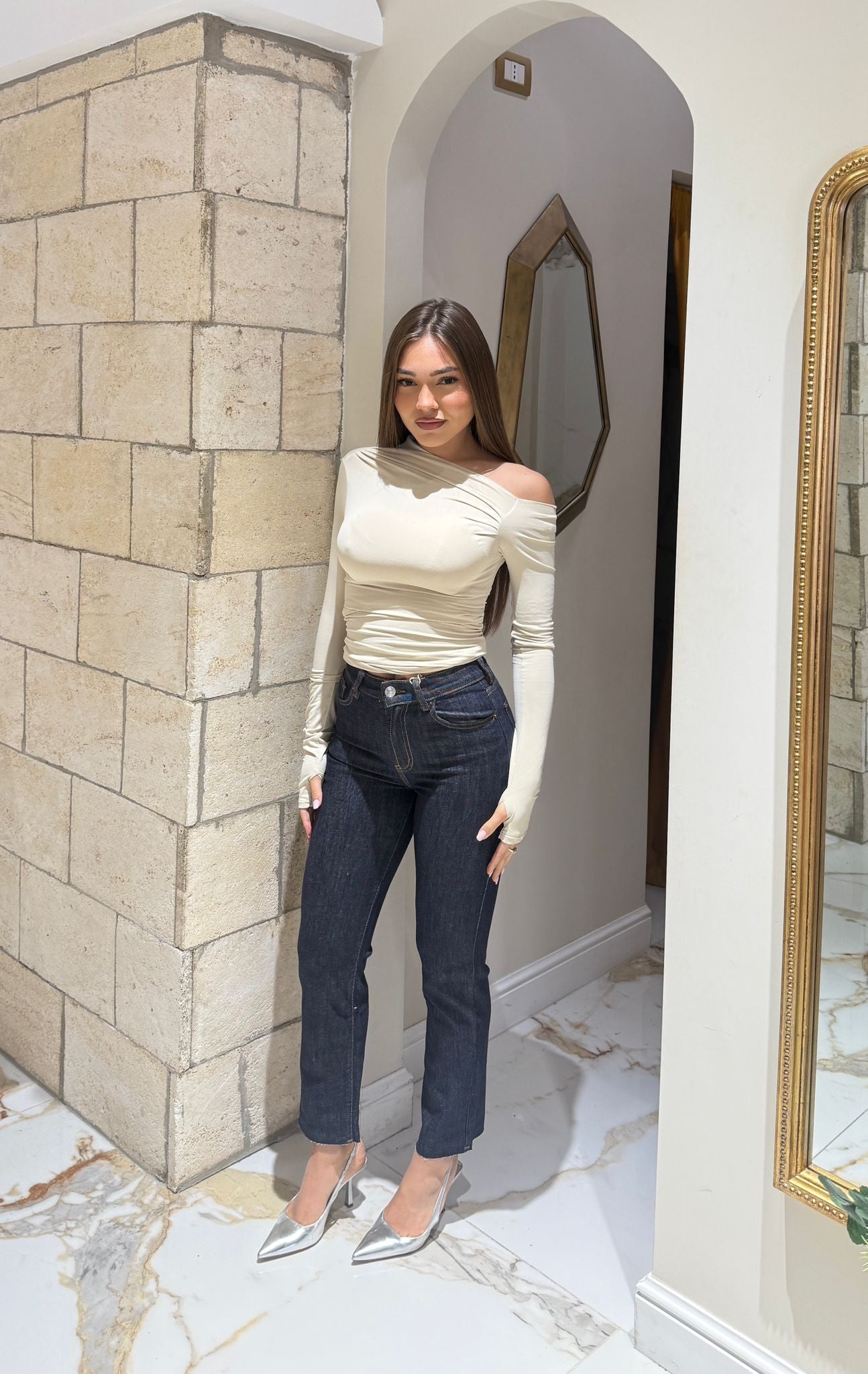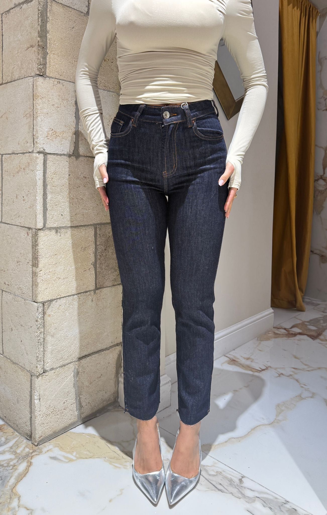 Jeans da donna in denim scuro tessuto elasticizzato con taglio laser sul finale e veste regolarmente la propria taglia e la modella indossa taglia XS