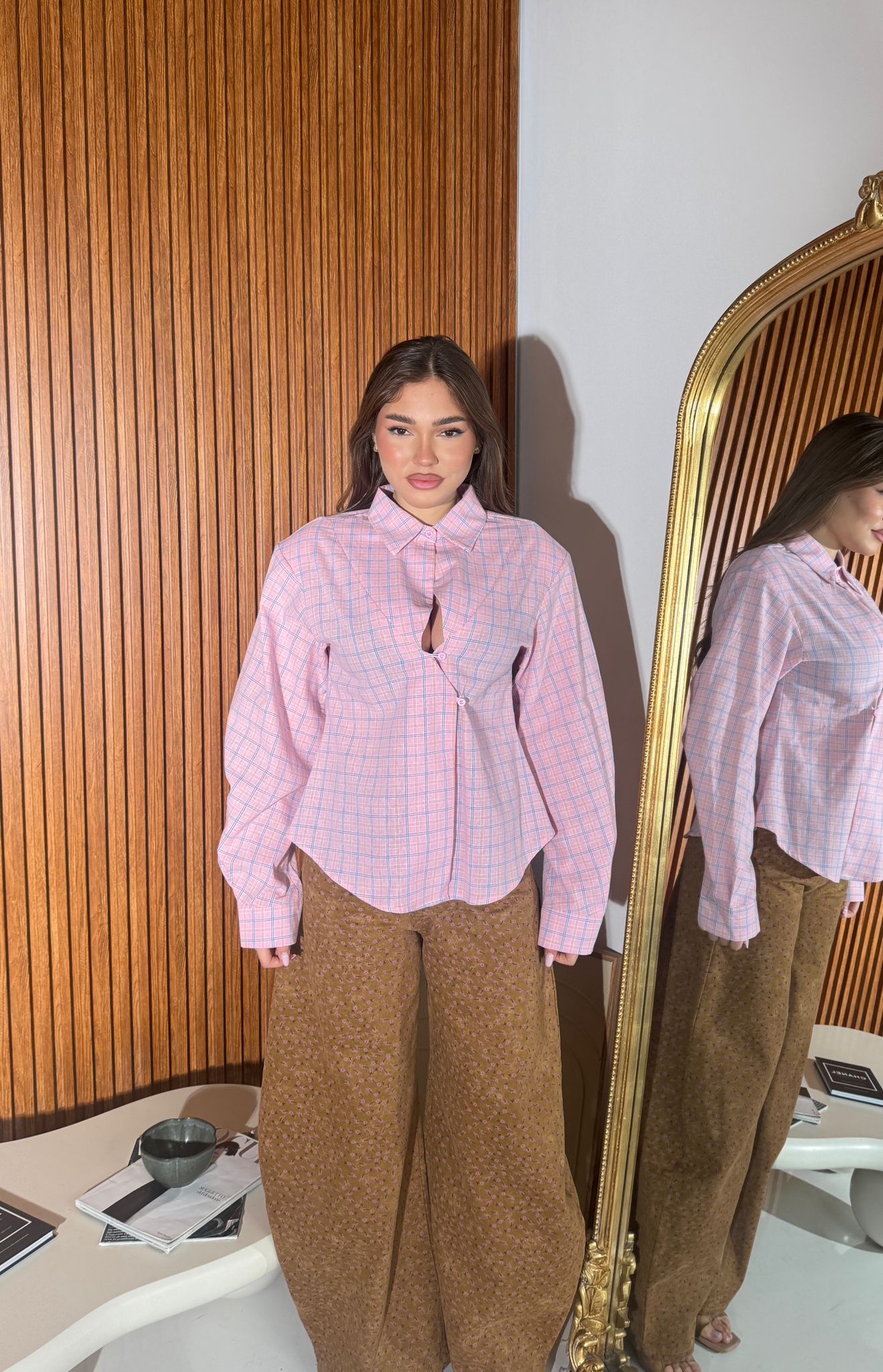 Camicia da donna in cotone con spalline strutturate e fantasia a quadri, lunghezza basic e veste regolarmente la propria taglia e la modella indossa taglia S/M ed è alta 1,65 e pesa 52/53 kg.