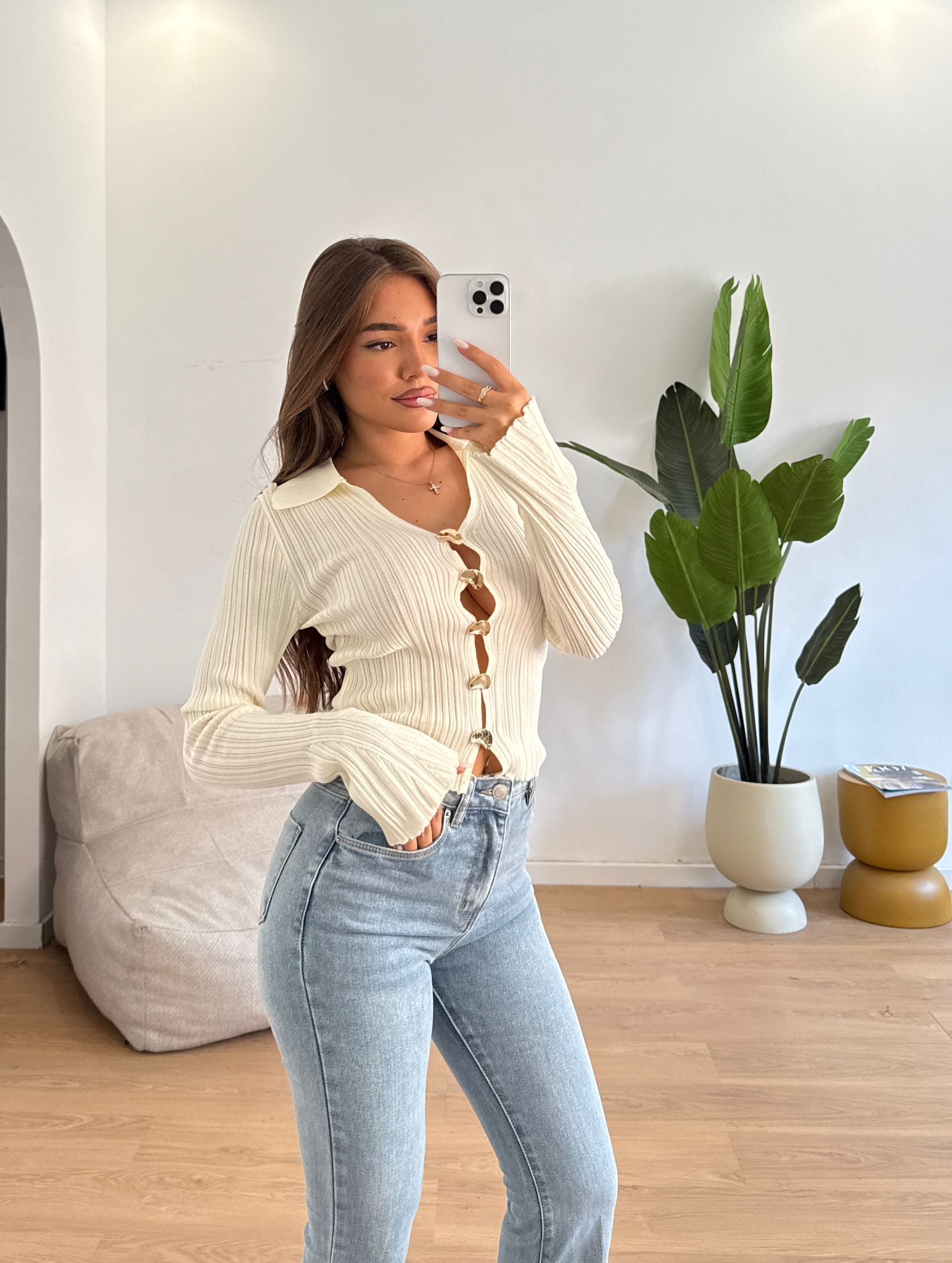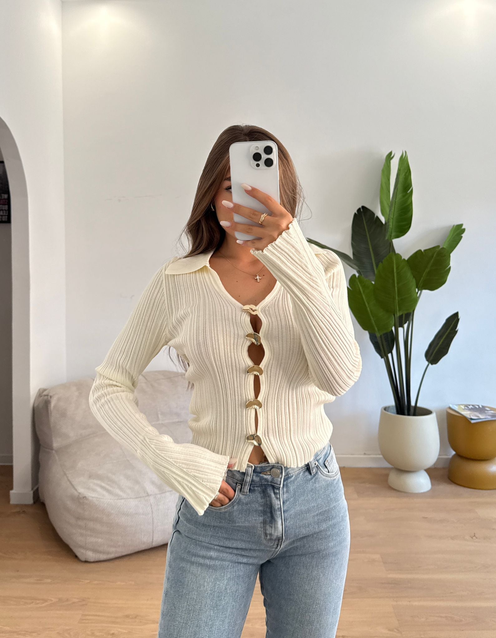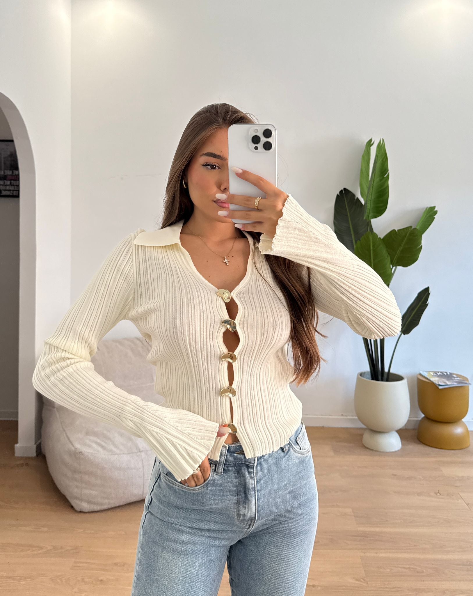 Cardigan da donna in filo tessuto elasticizzato e veste regolarmente la propria taglia e la modella indossa taglia S/M