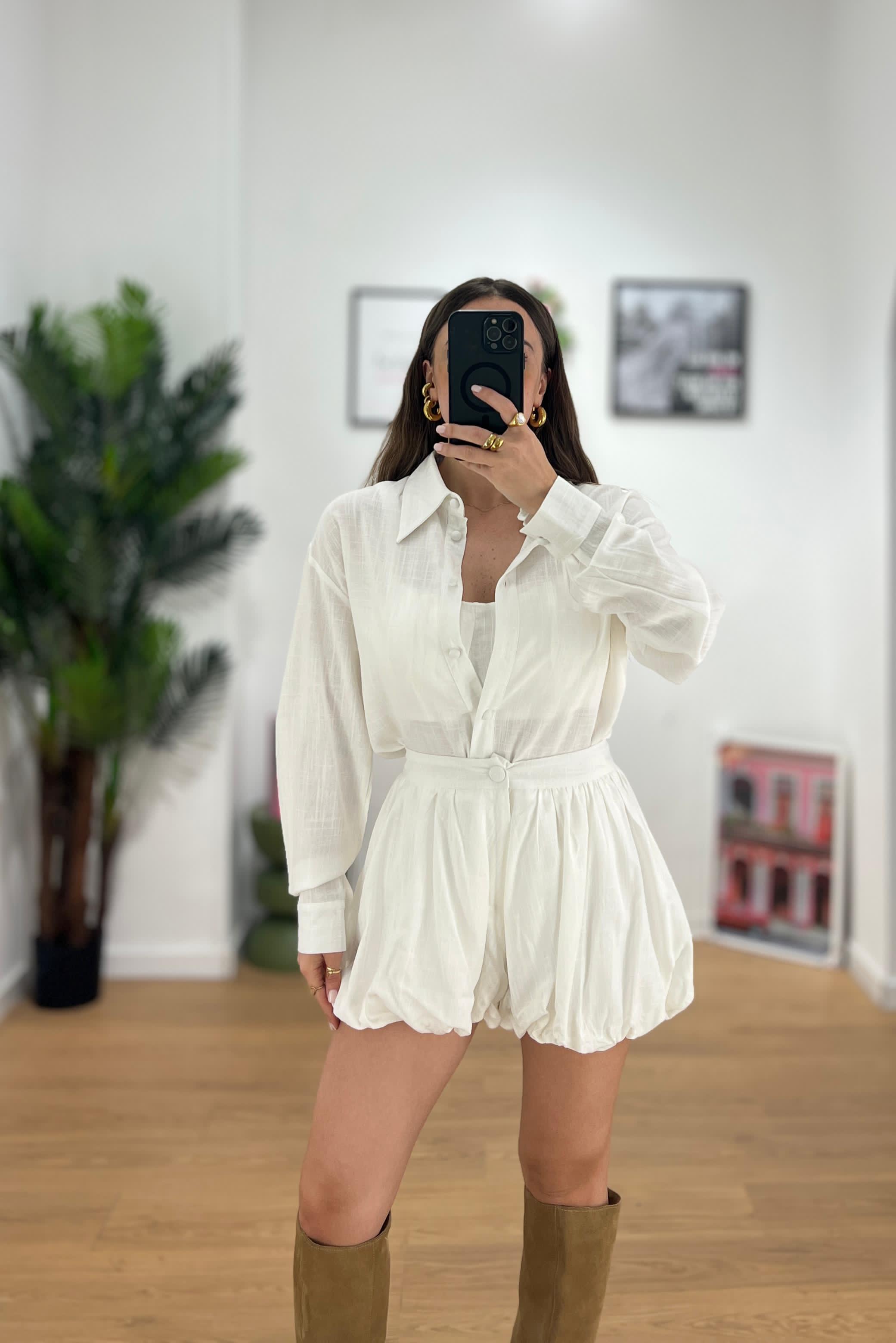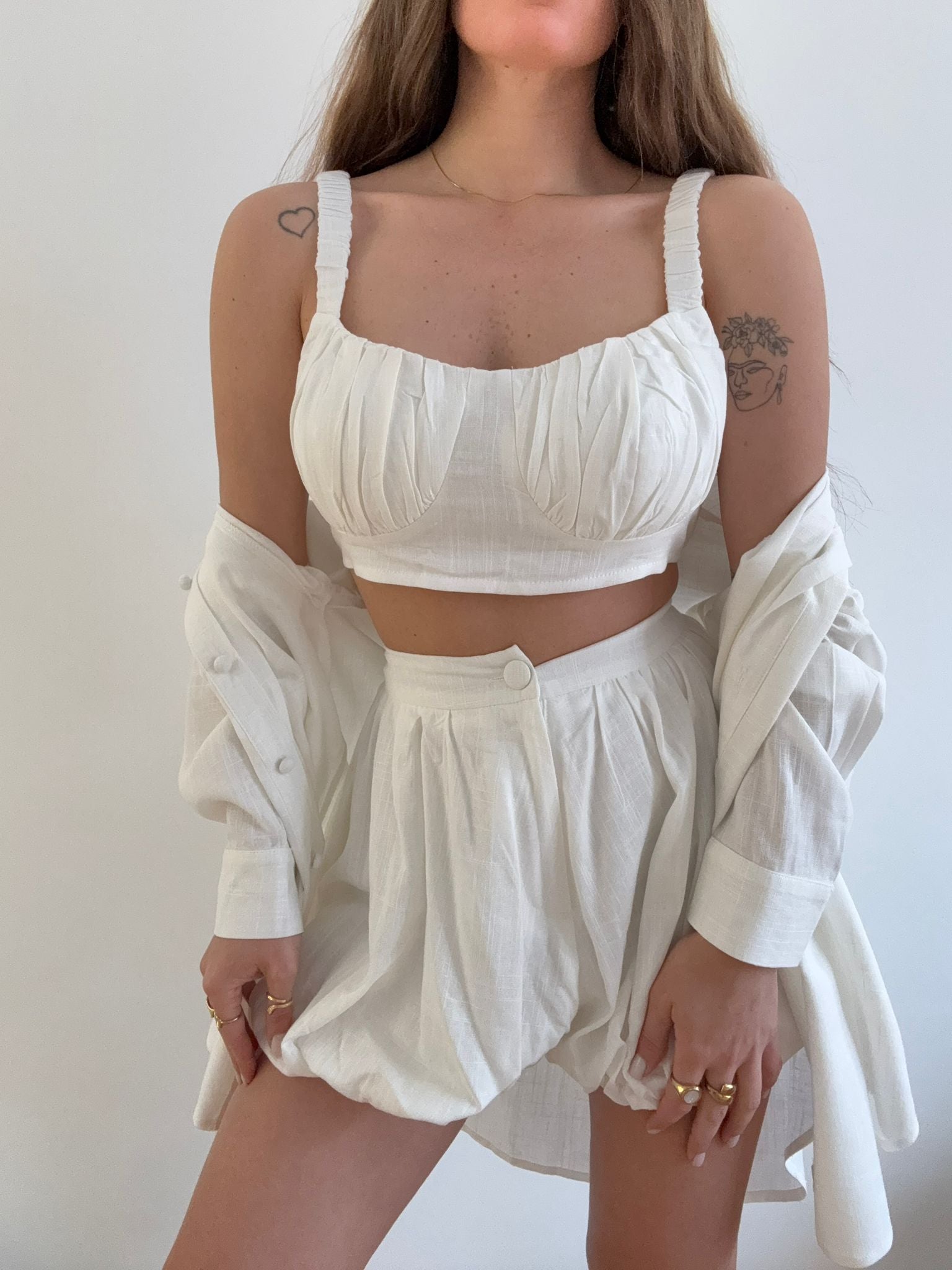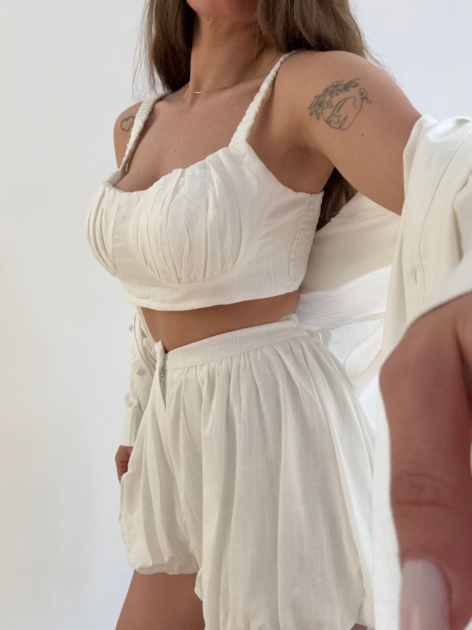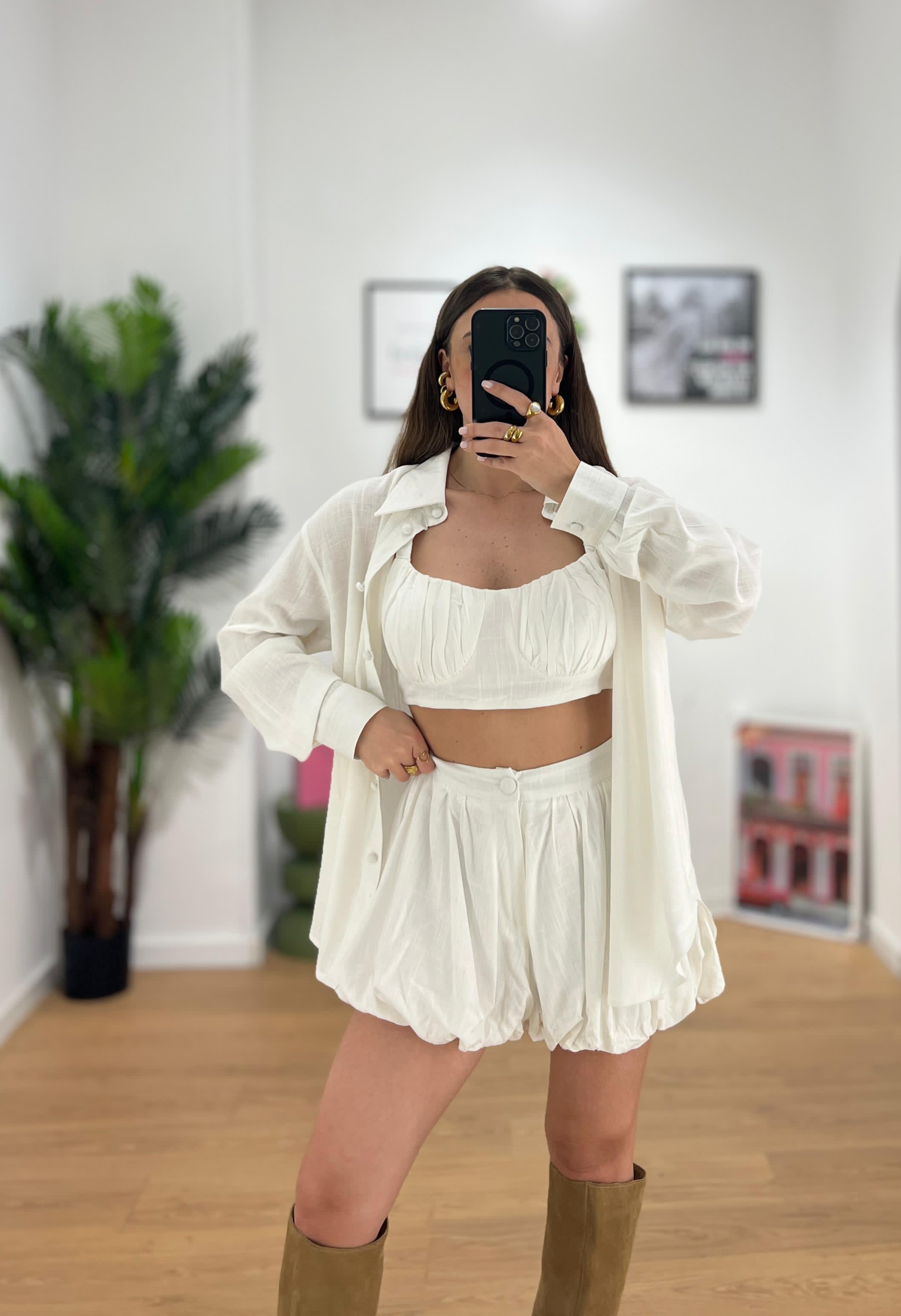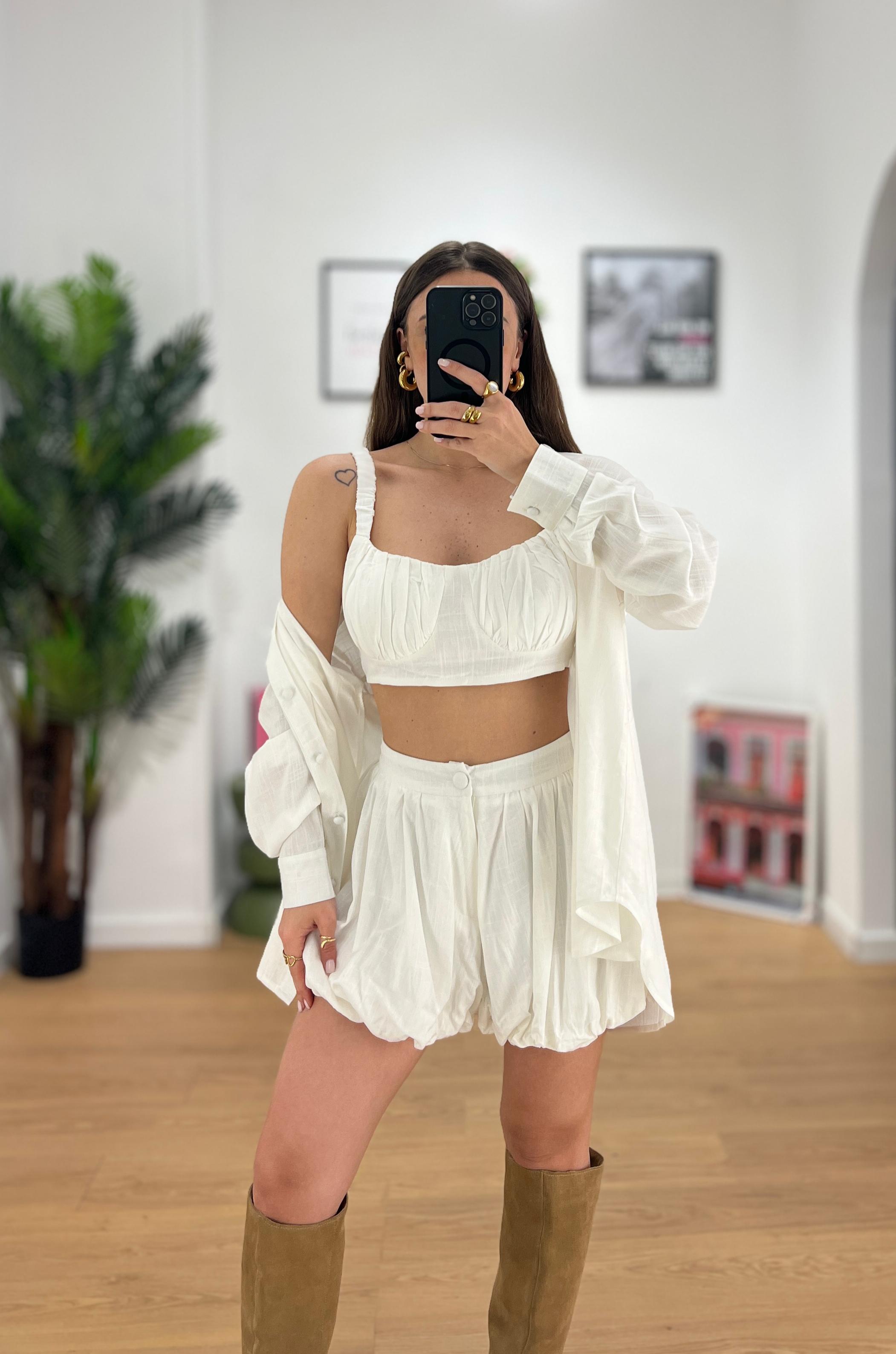 Coordinato da donna top quality in misto Lino composto da camicia con bottoncini rivestiti, top e shorts a palloncino con elastico sul retro ma ceTe regolarmente la propria taglia e Giusy indossa taglia S/M