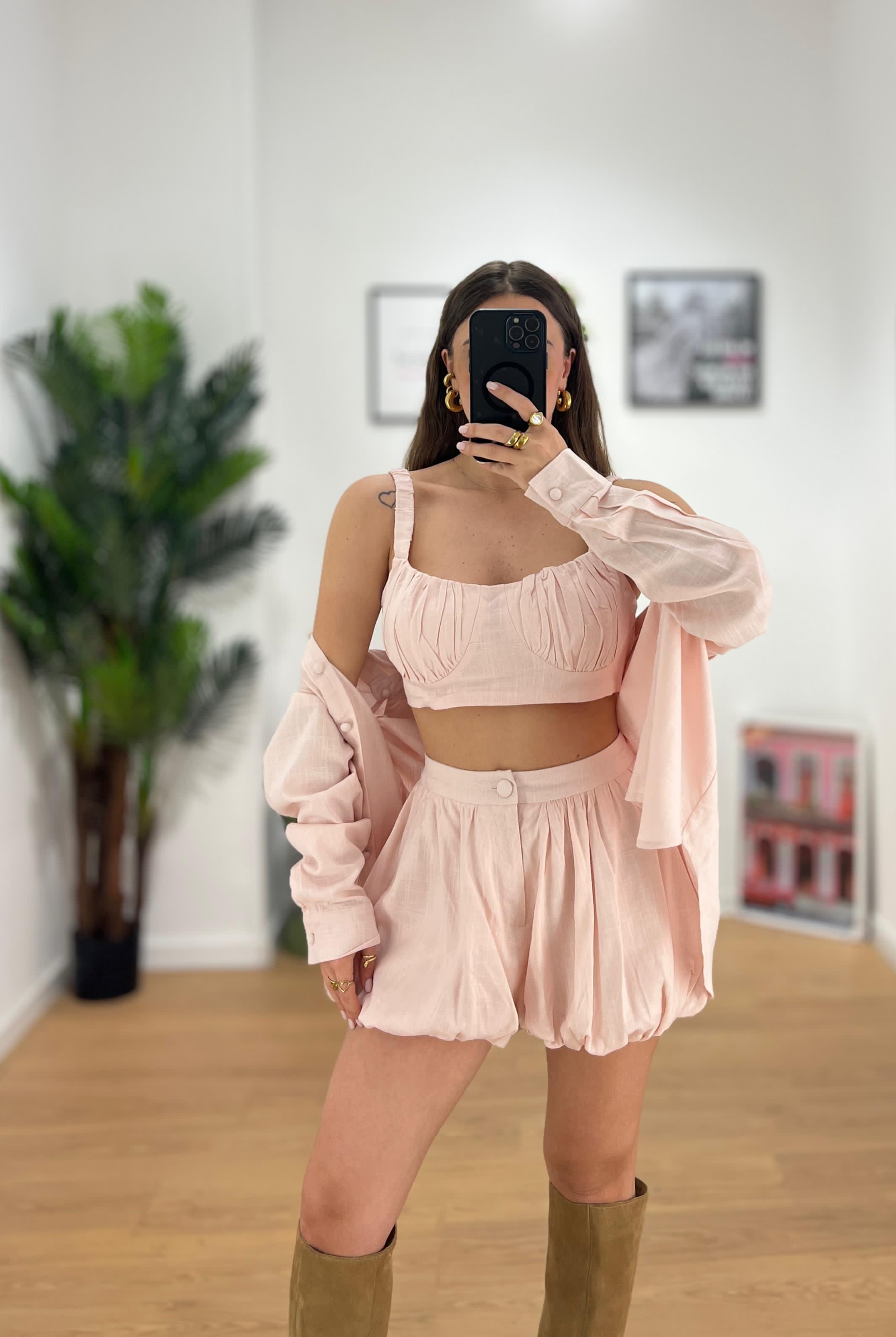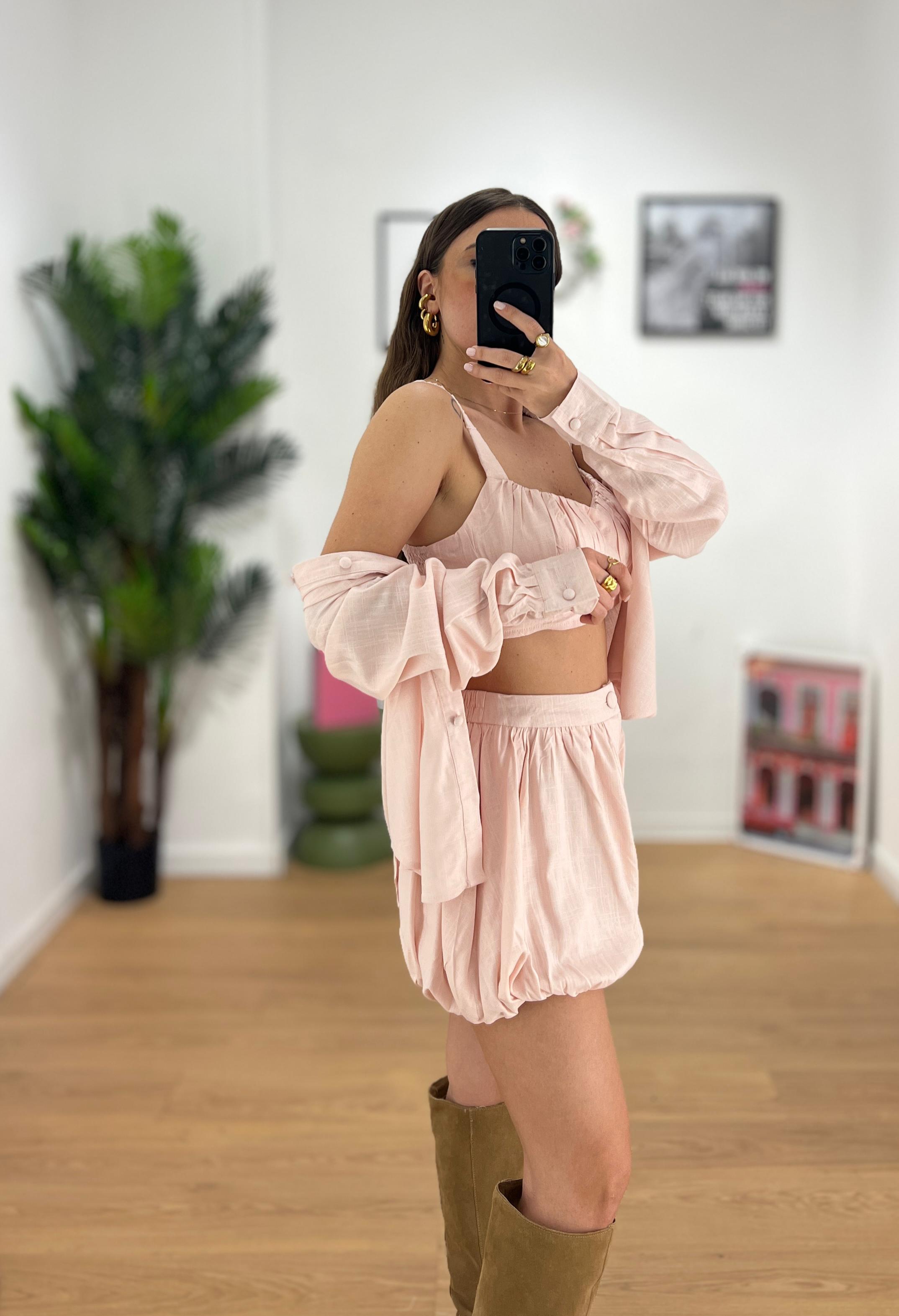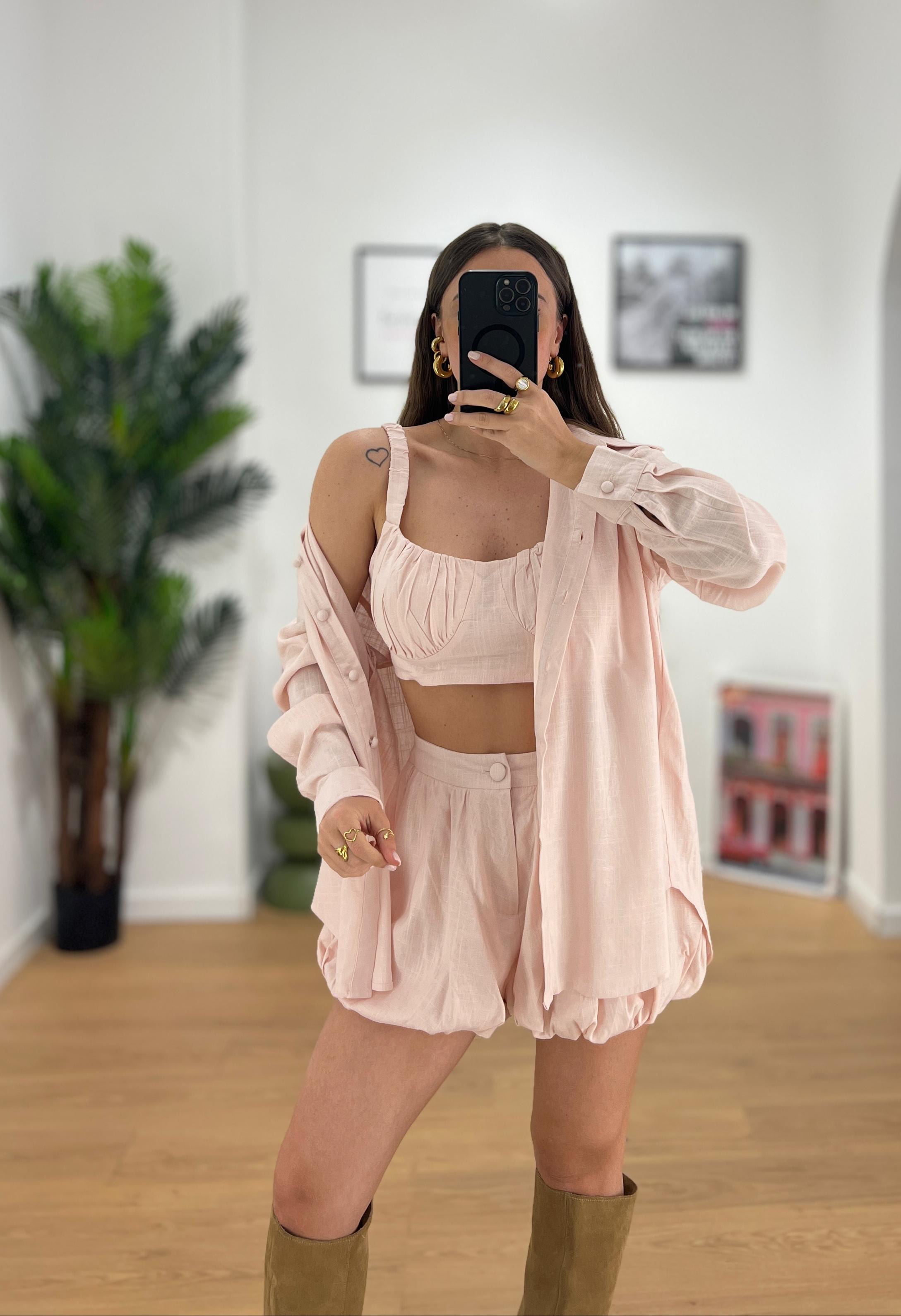 Coordinato da donna top quality in misto Lino composto da camicia con bottoncini rivestiti, top e shorts a palloncino con elastico sul retro ma ceTe regolarmente la propria taglia e Giusy indossa taglia S/M