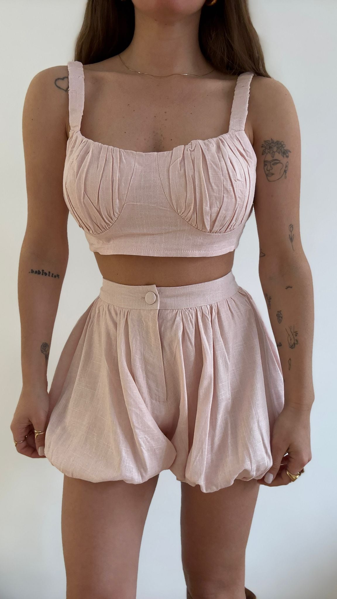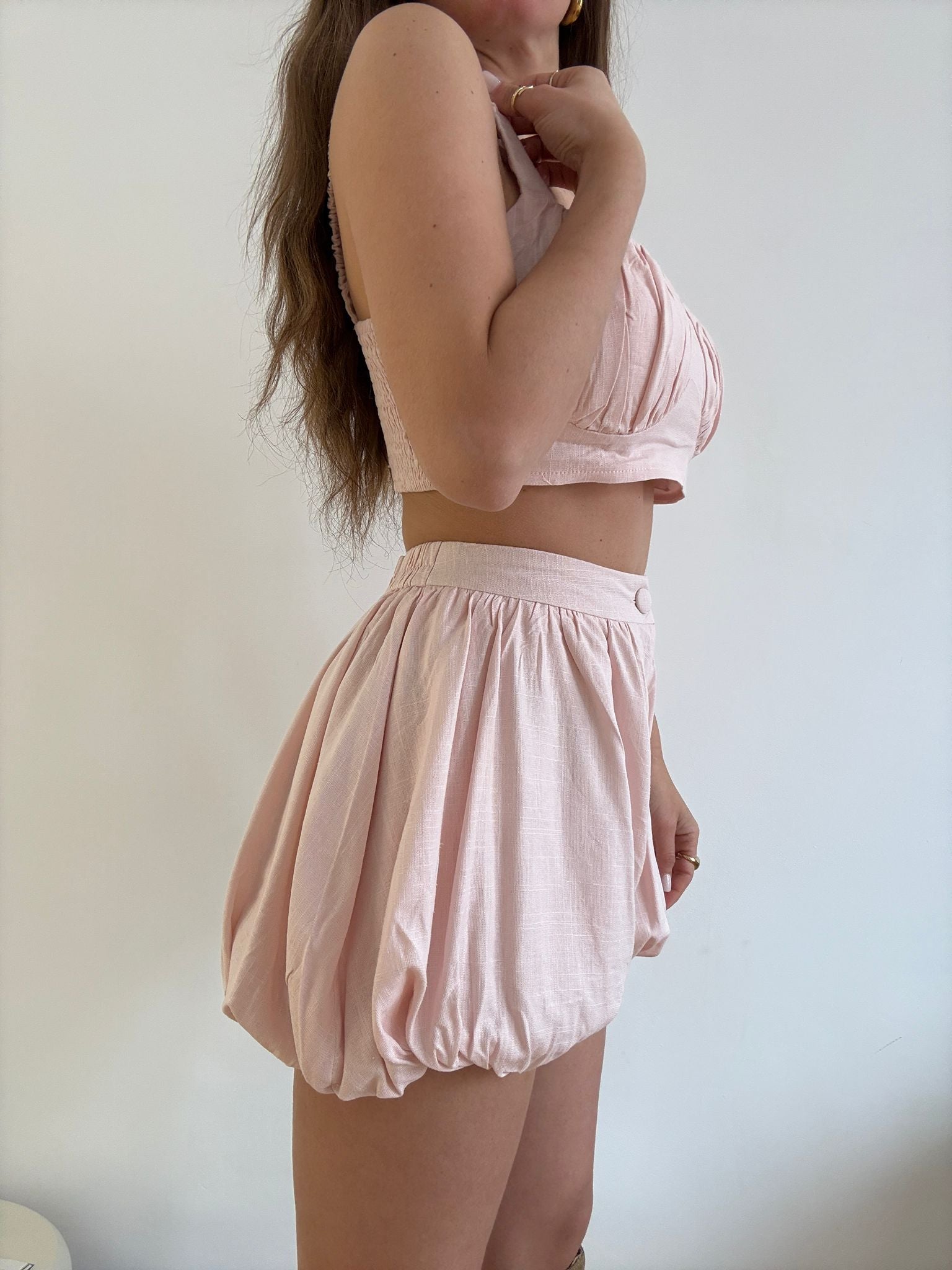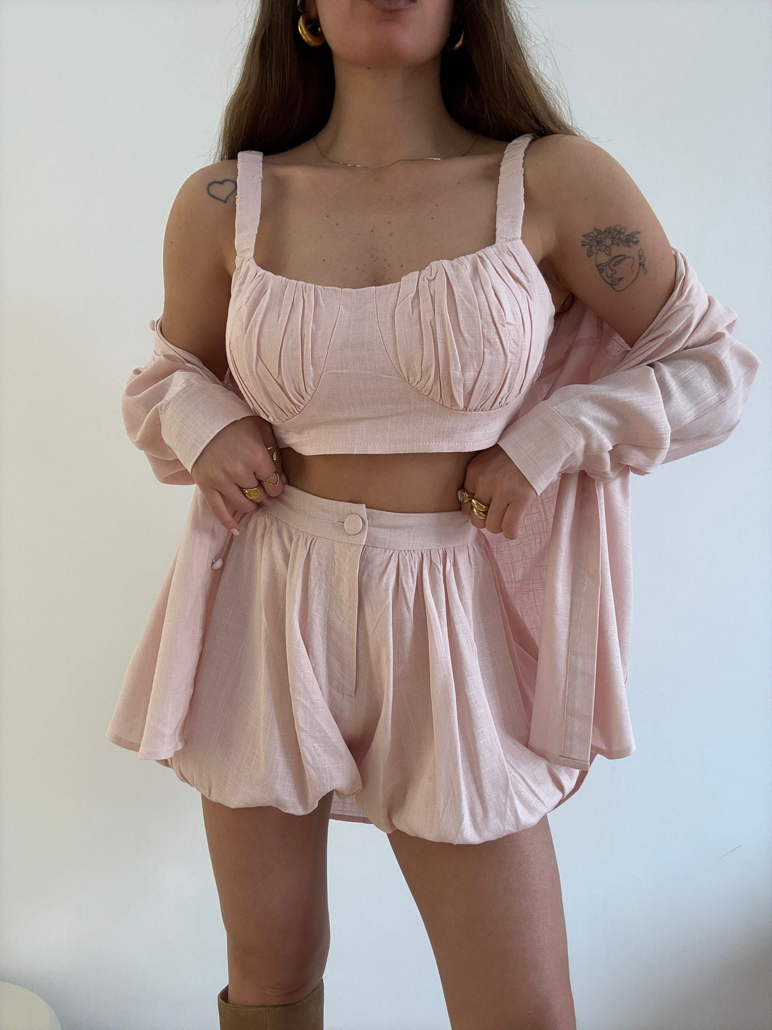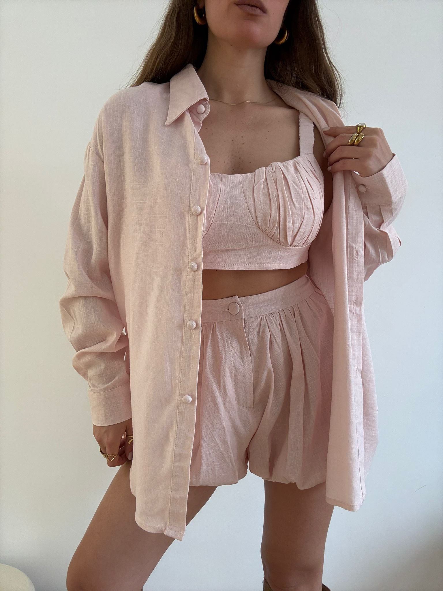 Coordinato da donna top quality in misto Lino composto da camicia con bottoncini rivestiti, top e shorts a palloncino con elastico sul retro ma ceTe regolarmente la propria taglia e Giusy indossa taglia S/M