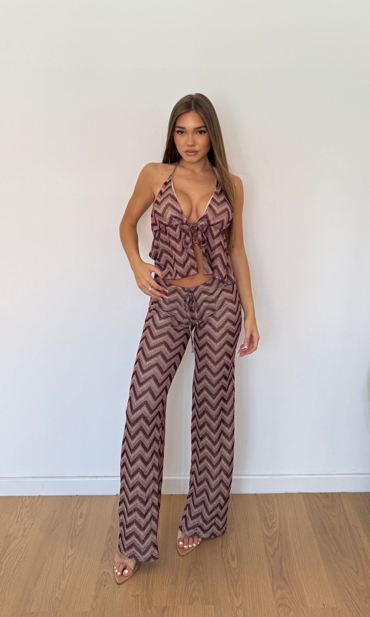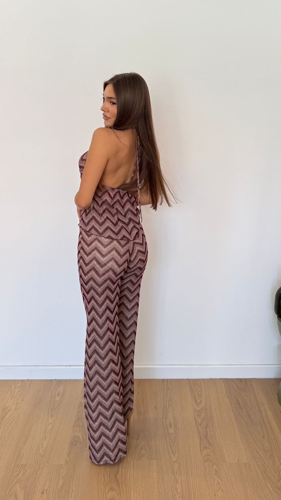 Coordinato da donna composto da top con coppe imbottite e schiena completamente scoperta e pantalone con elastico in vita interno, tessuto elasticizzato e vestirà bene fino ad una M piena