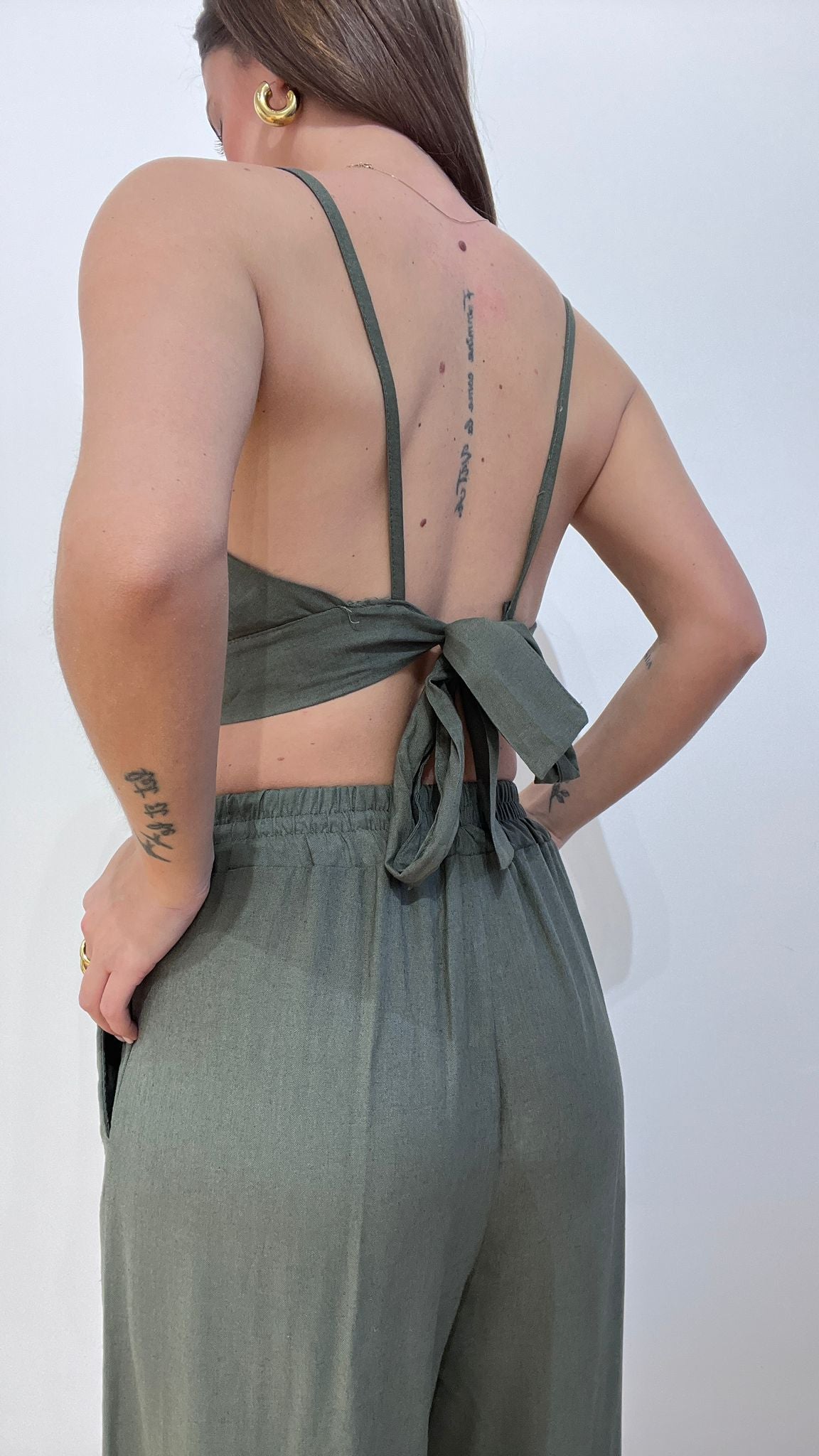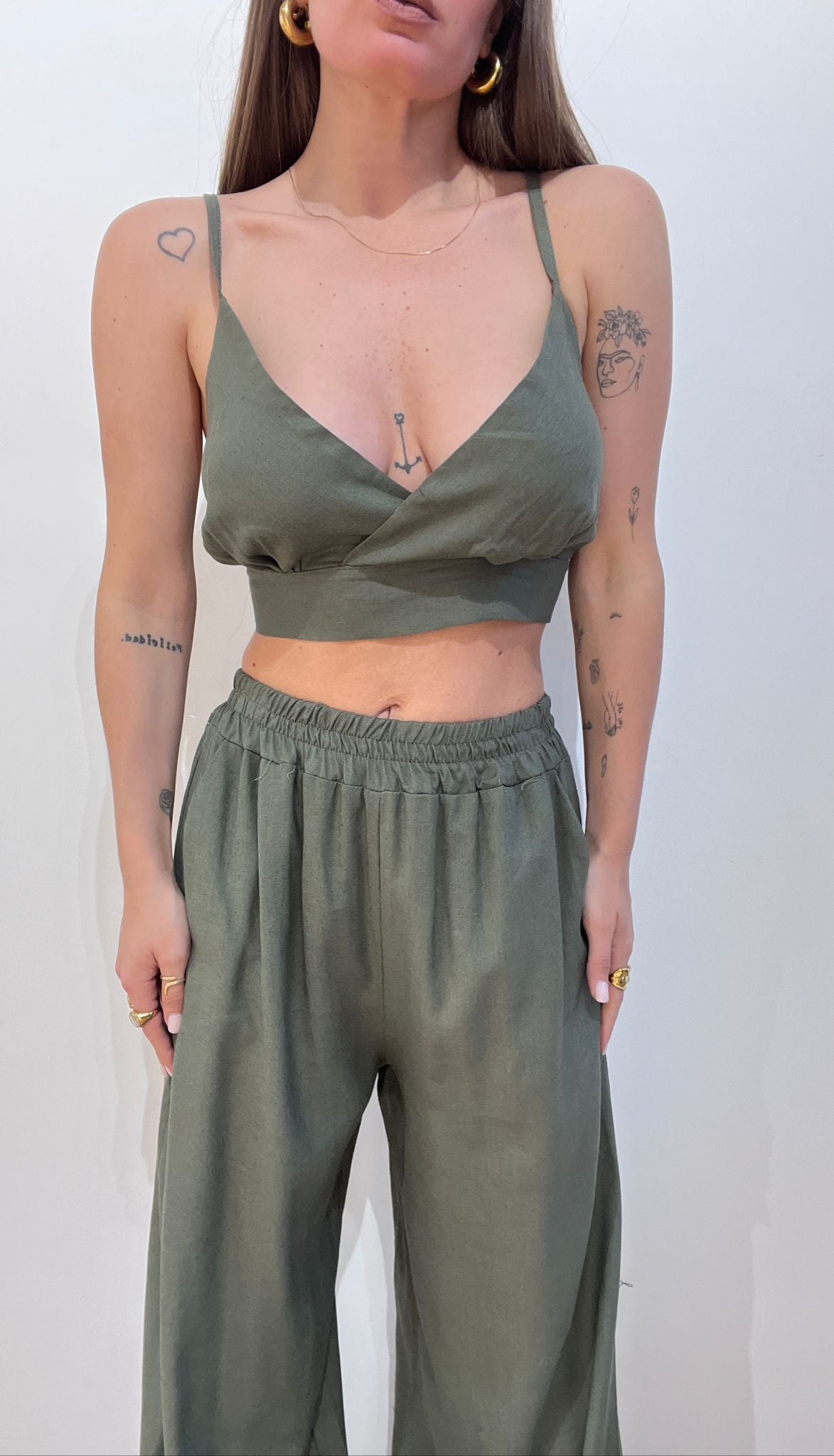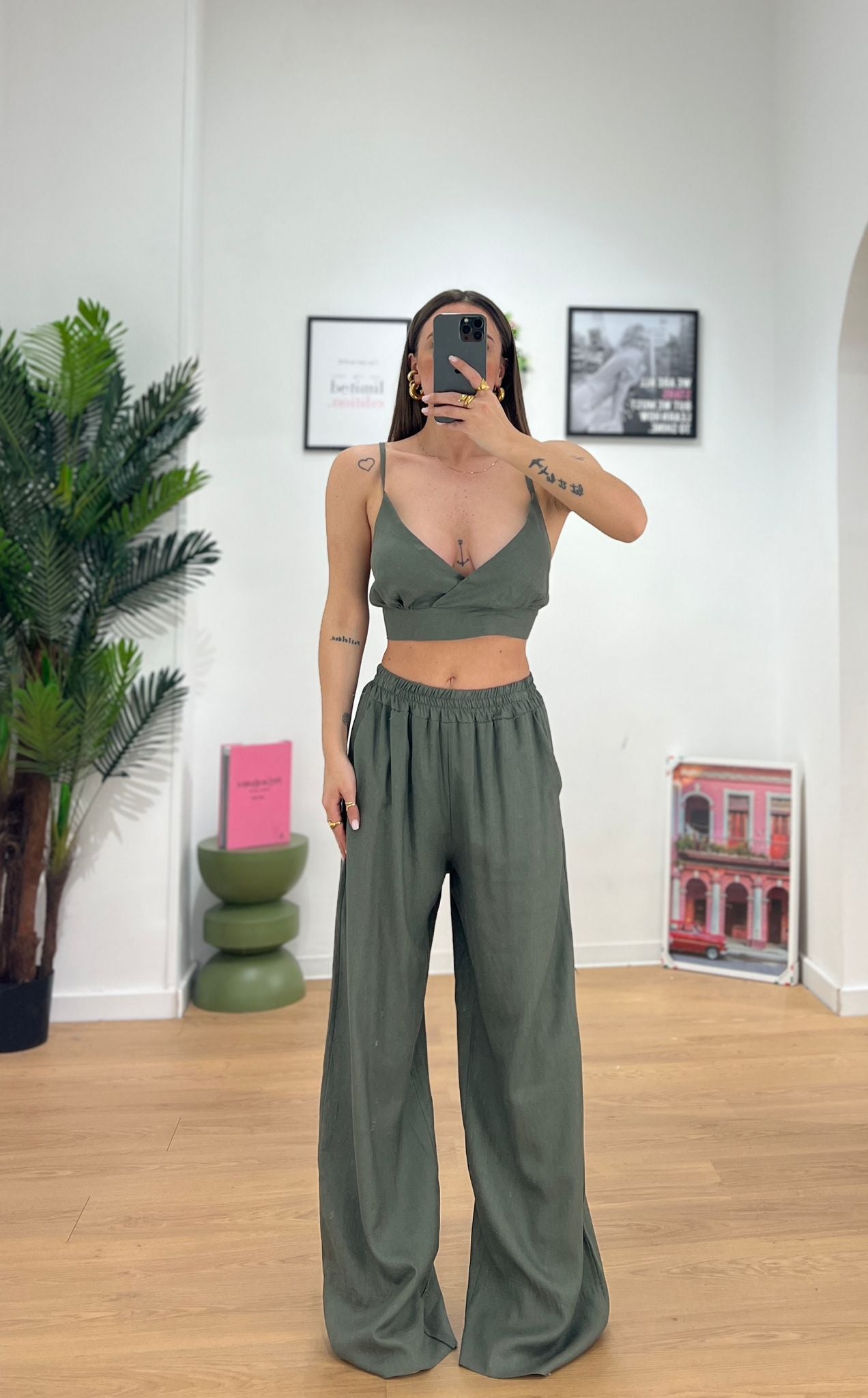 Coordinato da donna in misto lino composto da top e pantalone con elastico in vita e vestira' bene fino ad una L/XL