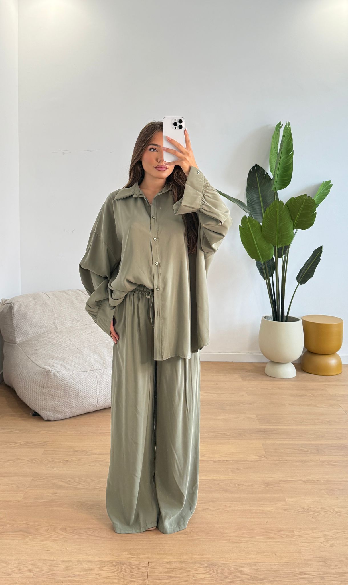 Coordinato da donna composto da camicia con bottoni e da pantalone con elastico in vita. Taglia unica, veste fino ad una 44.