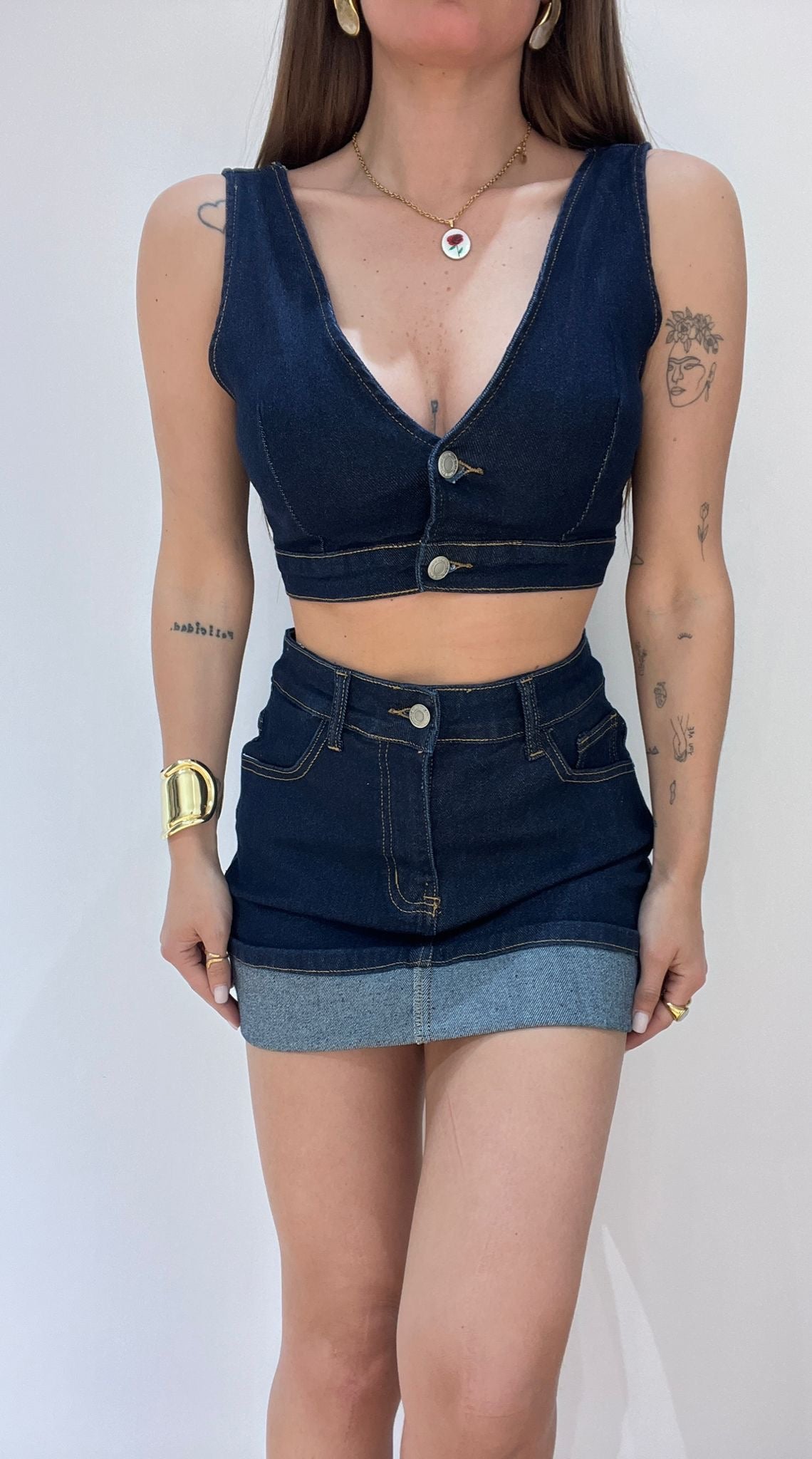 Coordinato in denim elastico, composto da bralette con bottoni sul davanti e da gonna con vita media/alta con piegone sul fondo. Giusy indossa la taglia XS.
