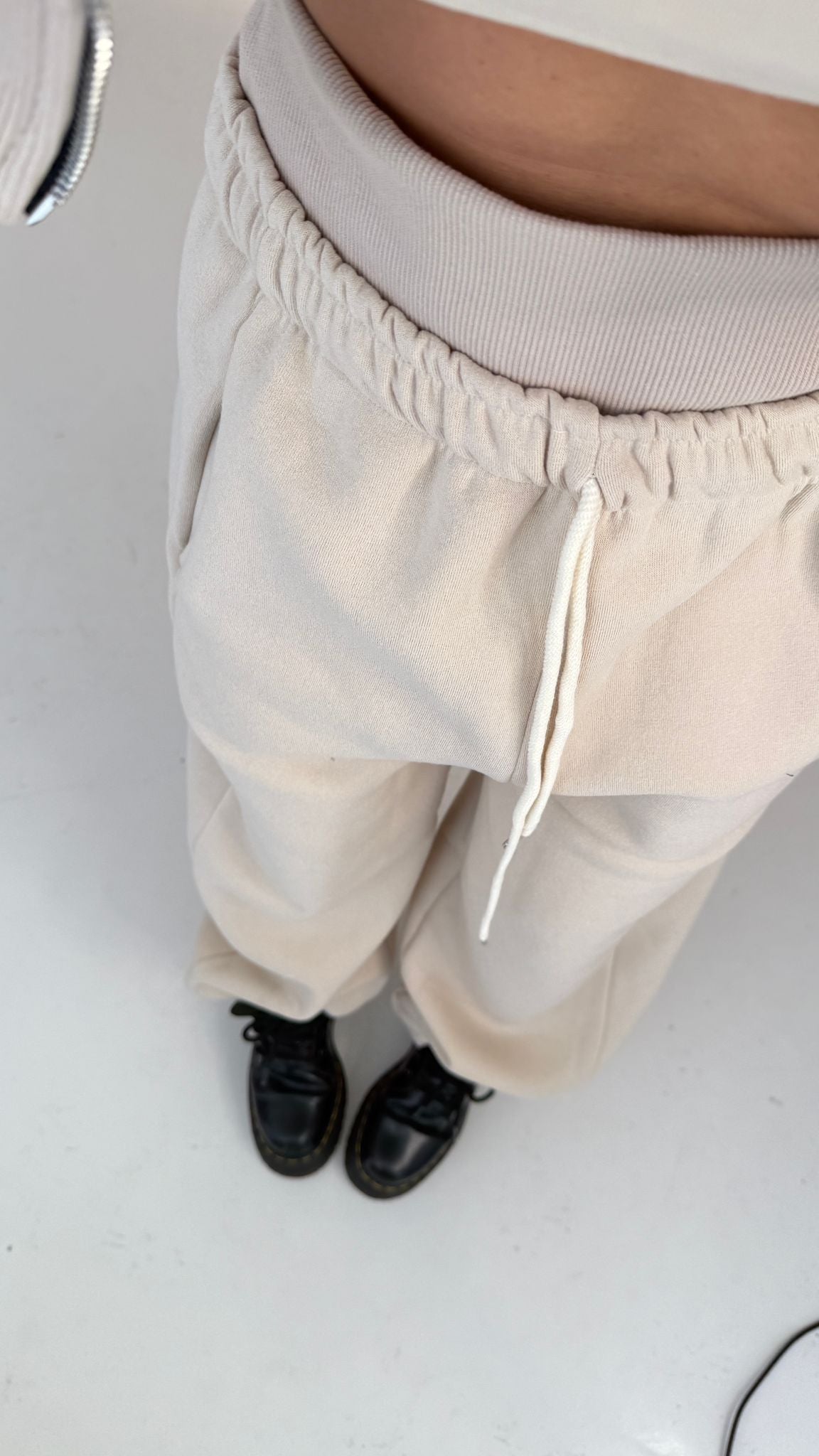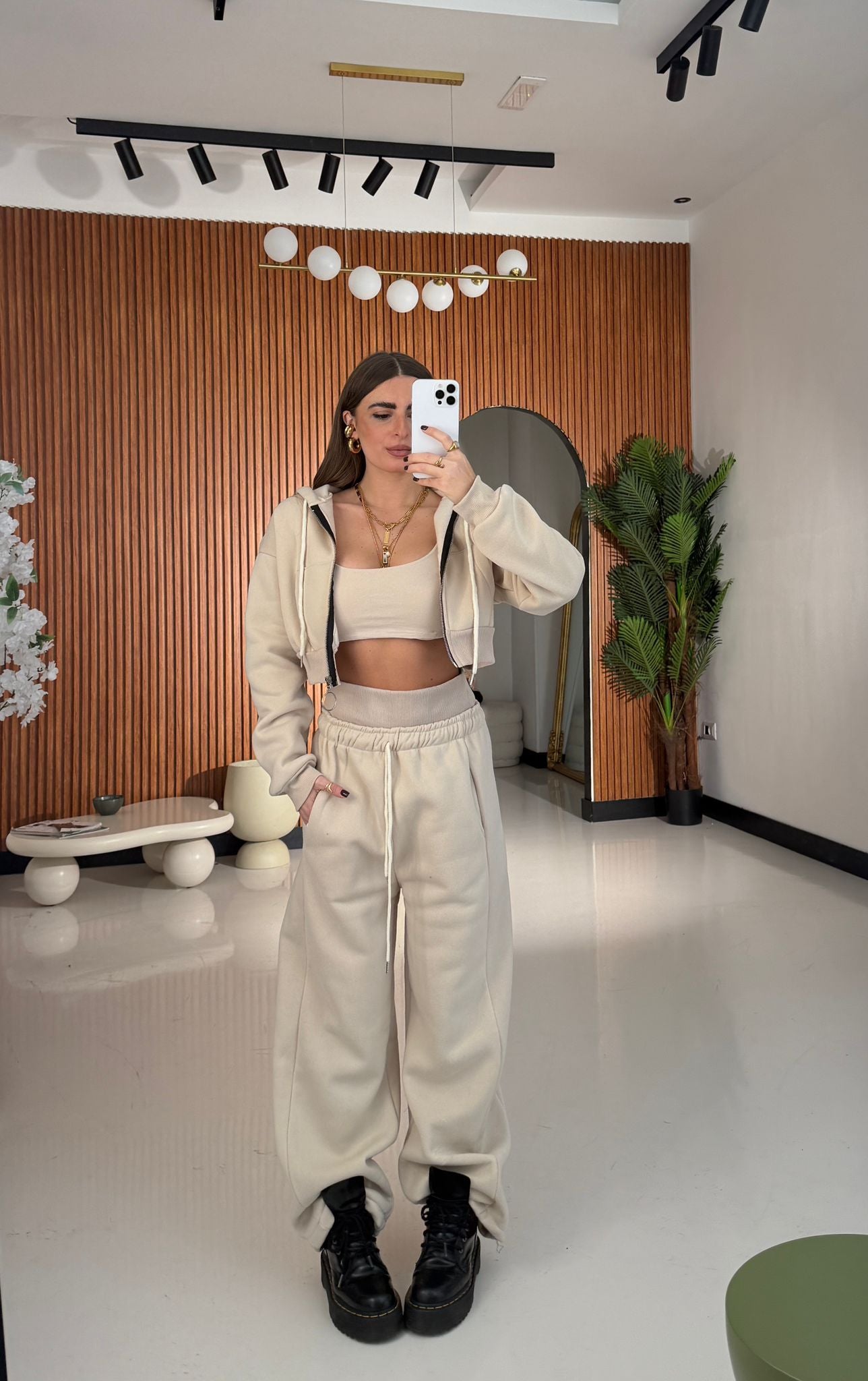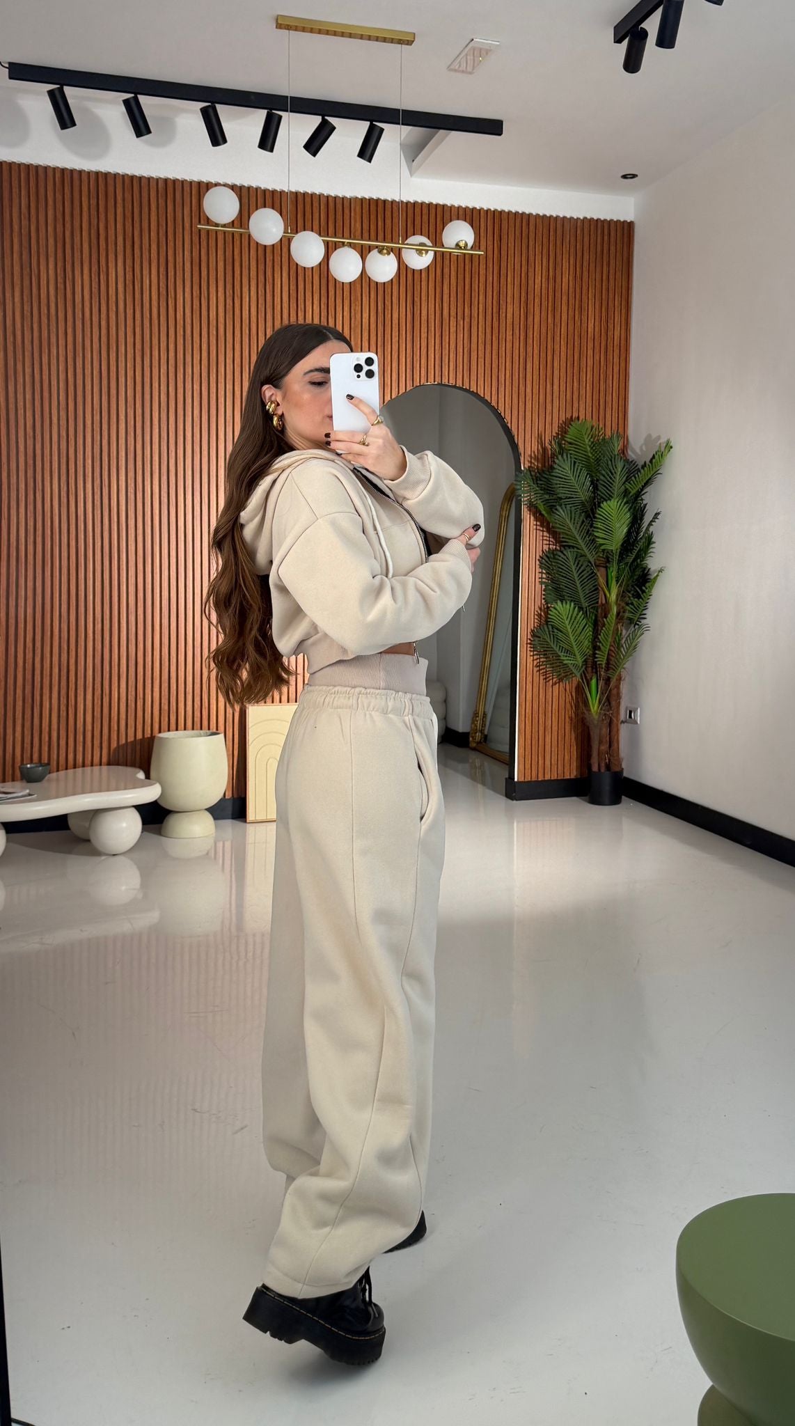 Coordinato da donna composto da felpa crop con cappuccio, chiusura zip sul davanti felpato internamente in pile e maglia crop inclusa, mentre il pantalone con elastico in vita modello ballon, felpato anch’esso interamente in pile con fascia alta ad effetto box. Vestirà bene fino ad una M/L piena, la modella è alta 1,65 e pesa 52/53 kg.