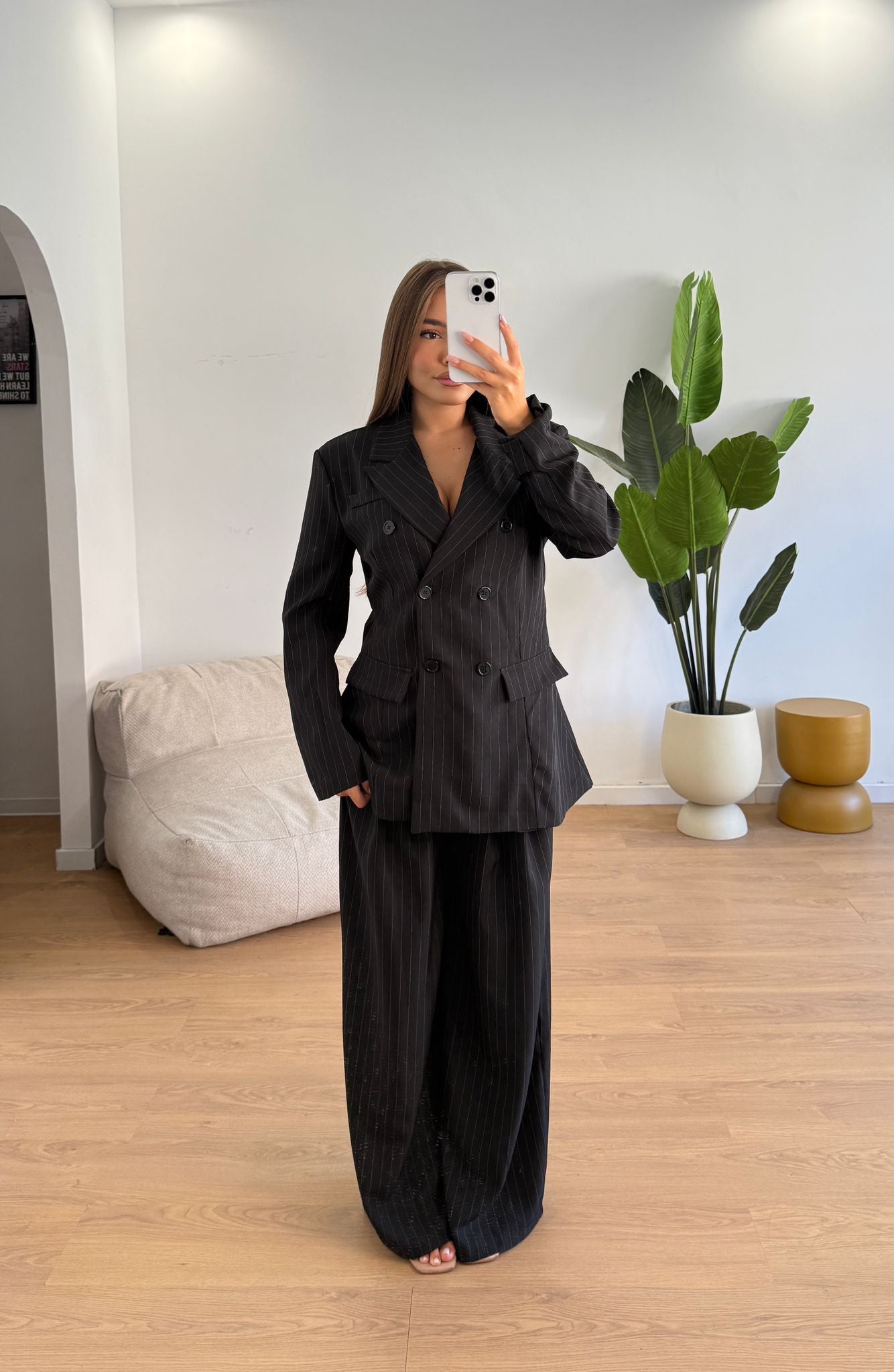 Coordinato da donna gessato composto da giacca crop con spalline imbottite, foderata internamente e pantalone con maniche lastrico in vita sul retro ed elastico sul finale, vestira bene fino ad una 44