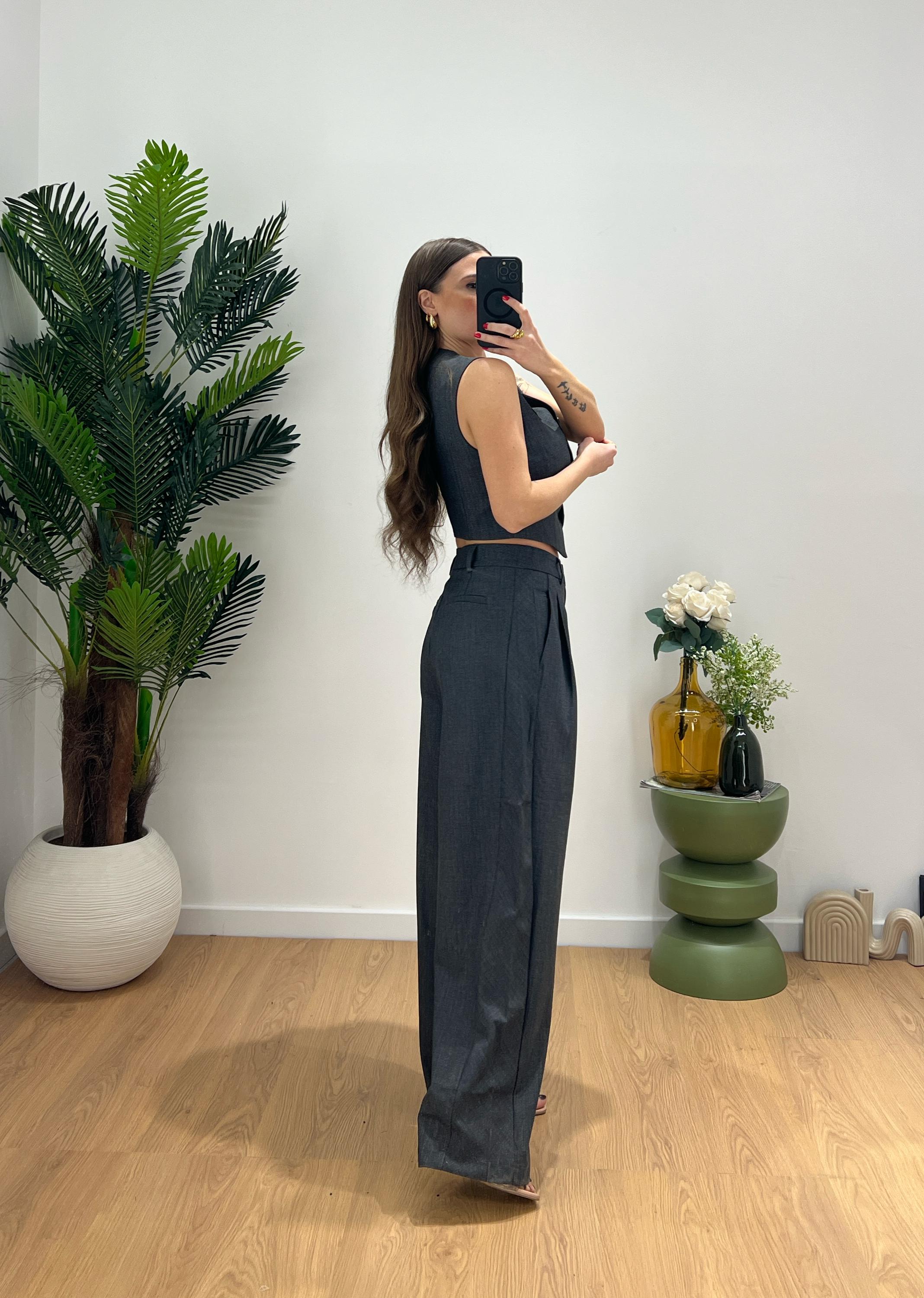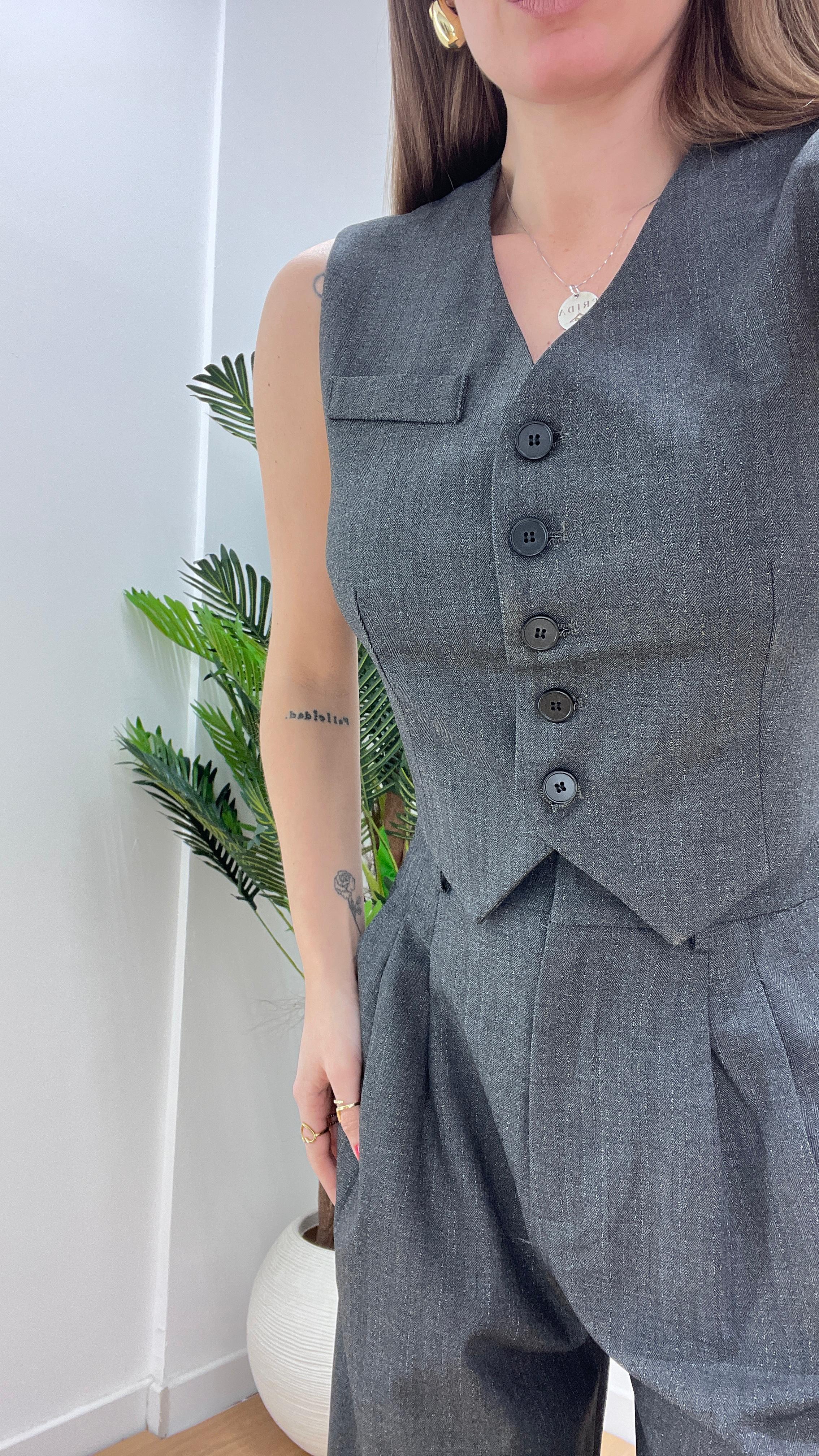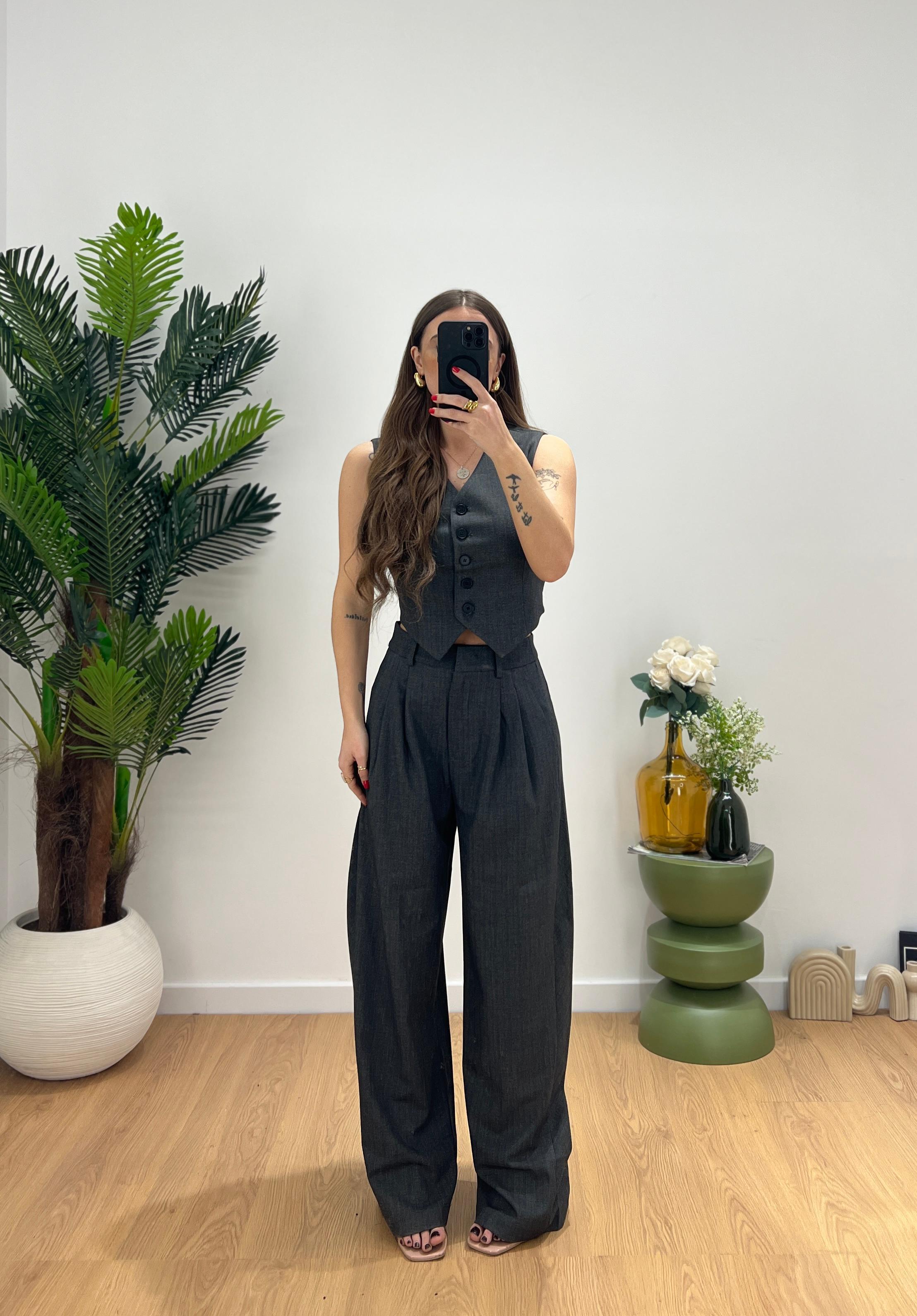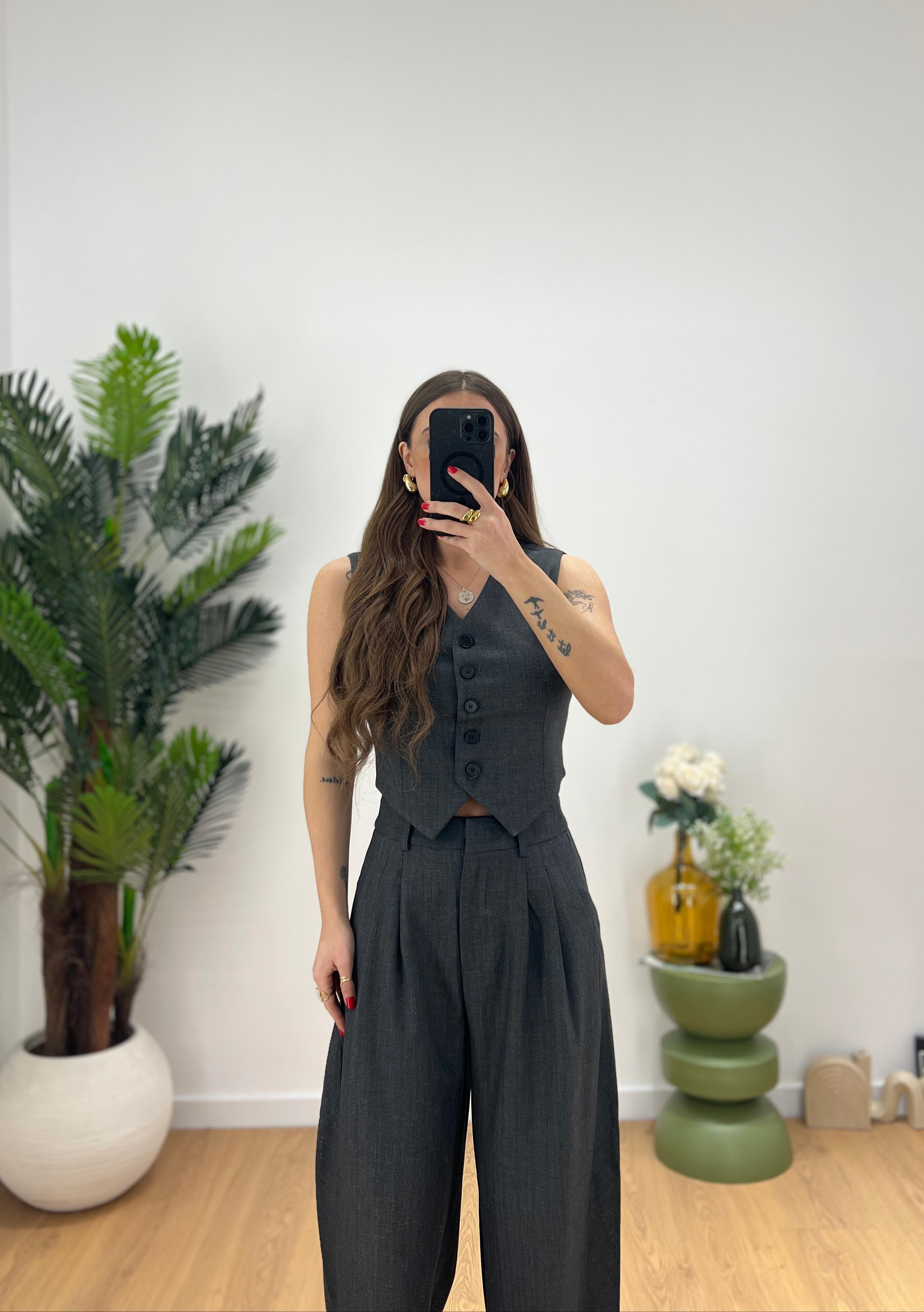 Coordinato da donna composto da gilet con chiusura bottoncini sul davanti e scolll a V e pantalone vita alta con gamba morbida, veste regolarmente la propria taglia e Giusy indossa taglia XS