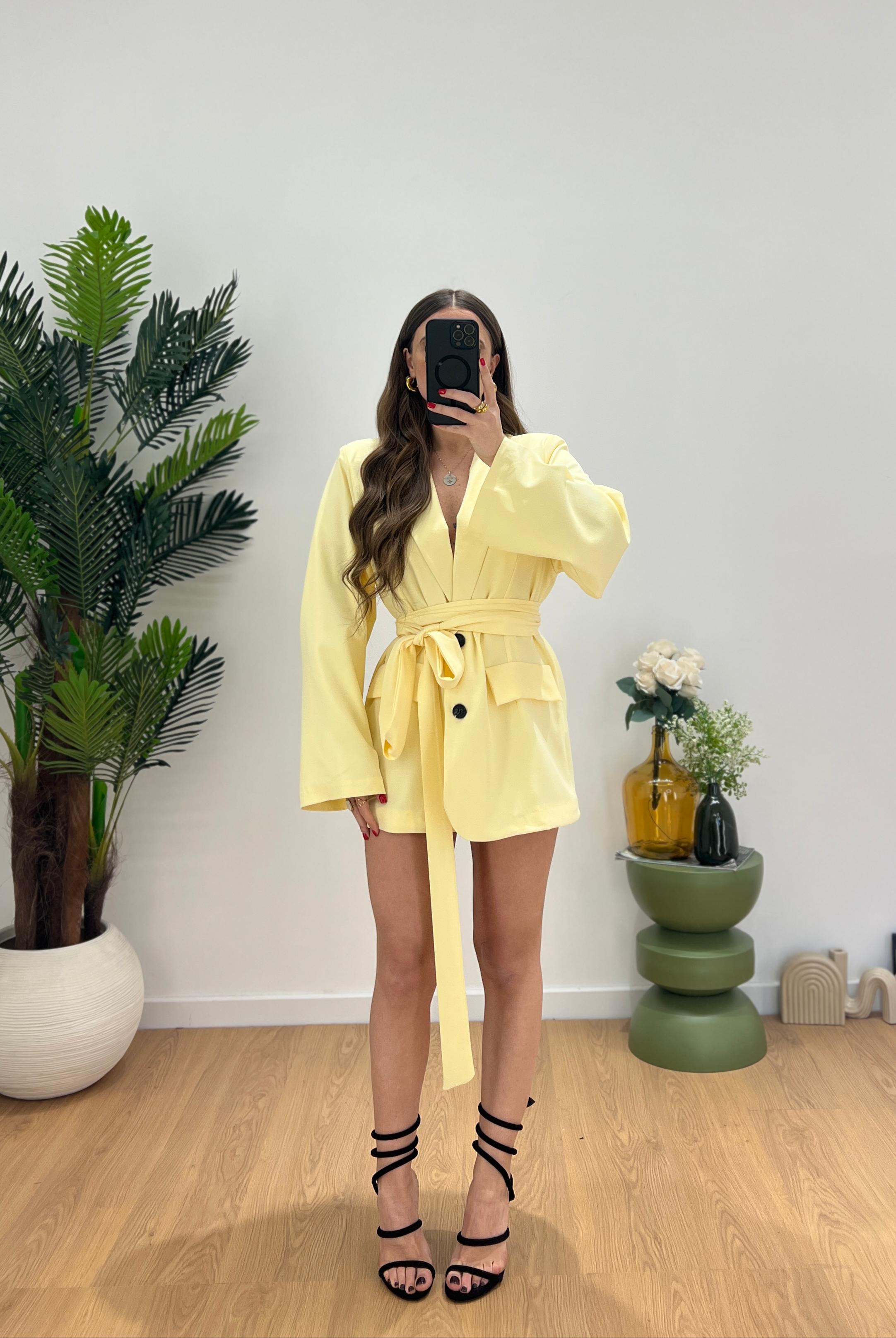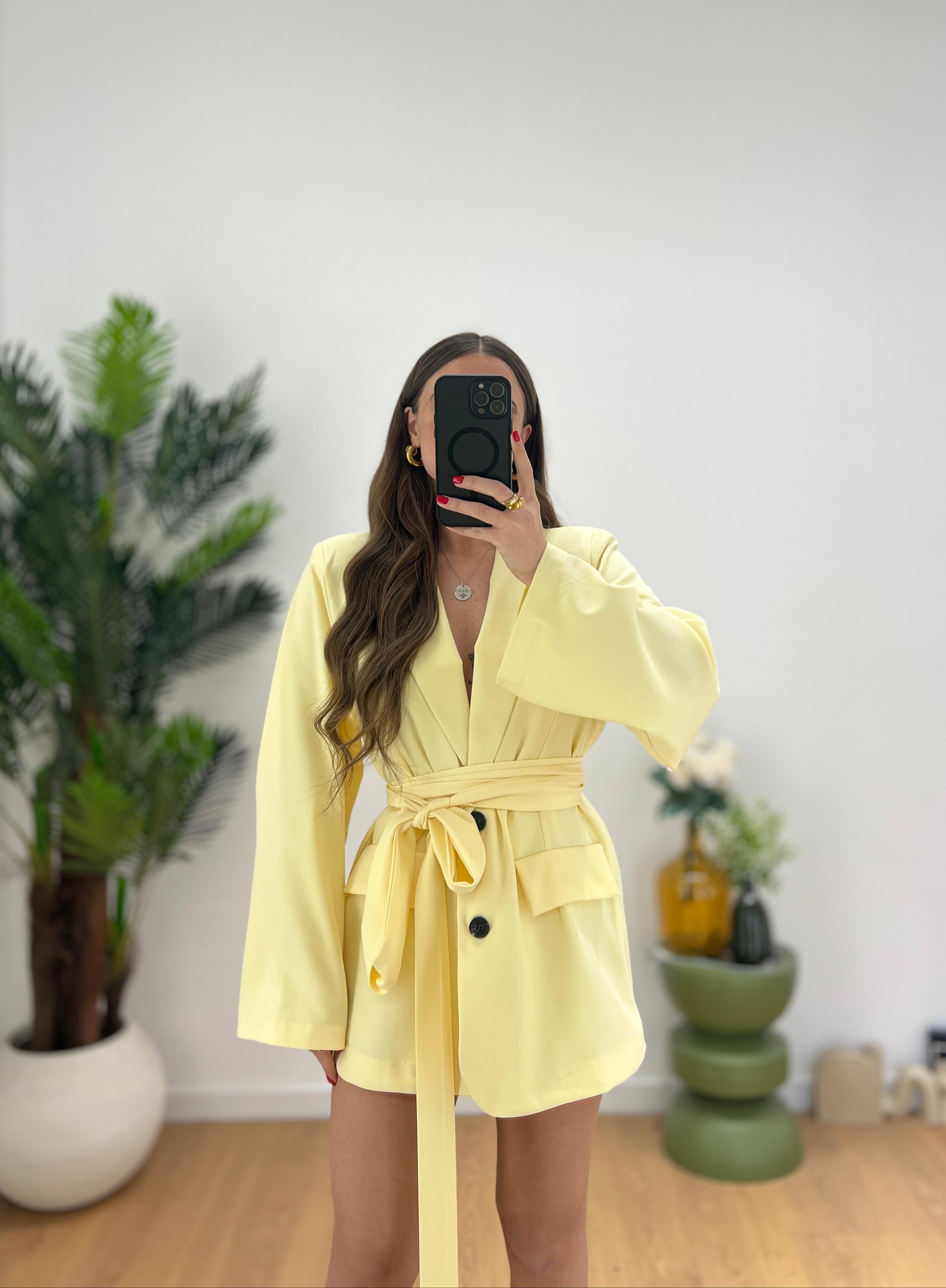 Blazer da donna oversize con chiusura bottoni, spalline imbottite e cintura inclusa. Vestibilità fino ad una 44/46
