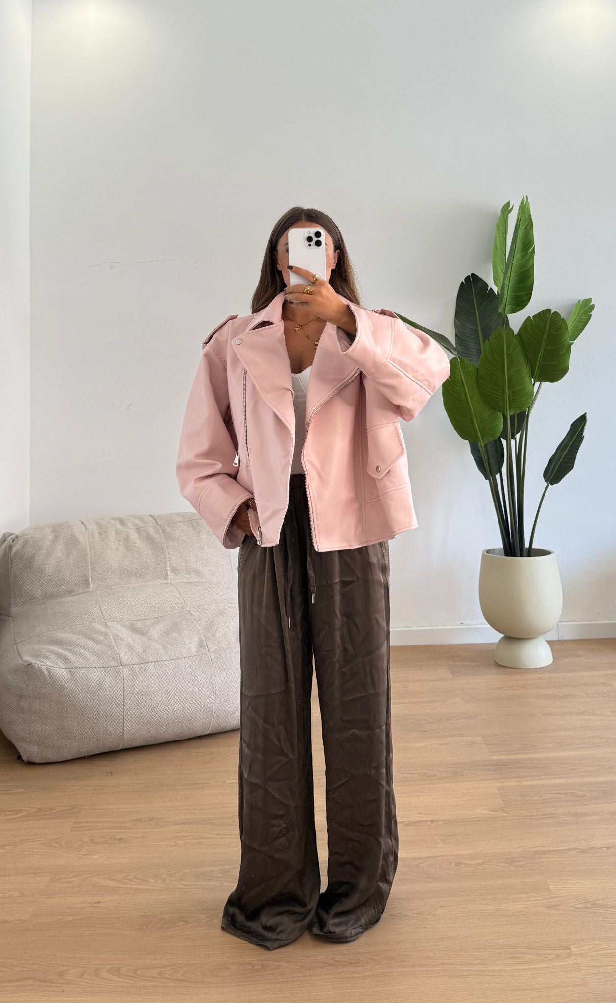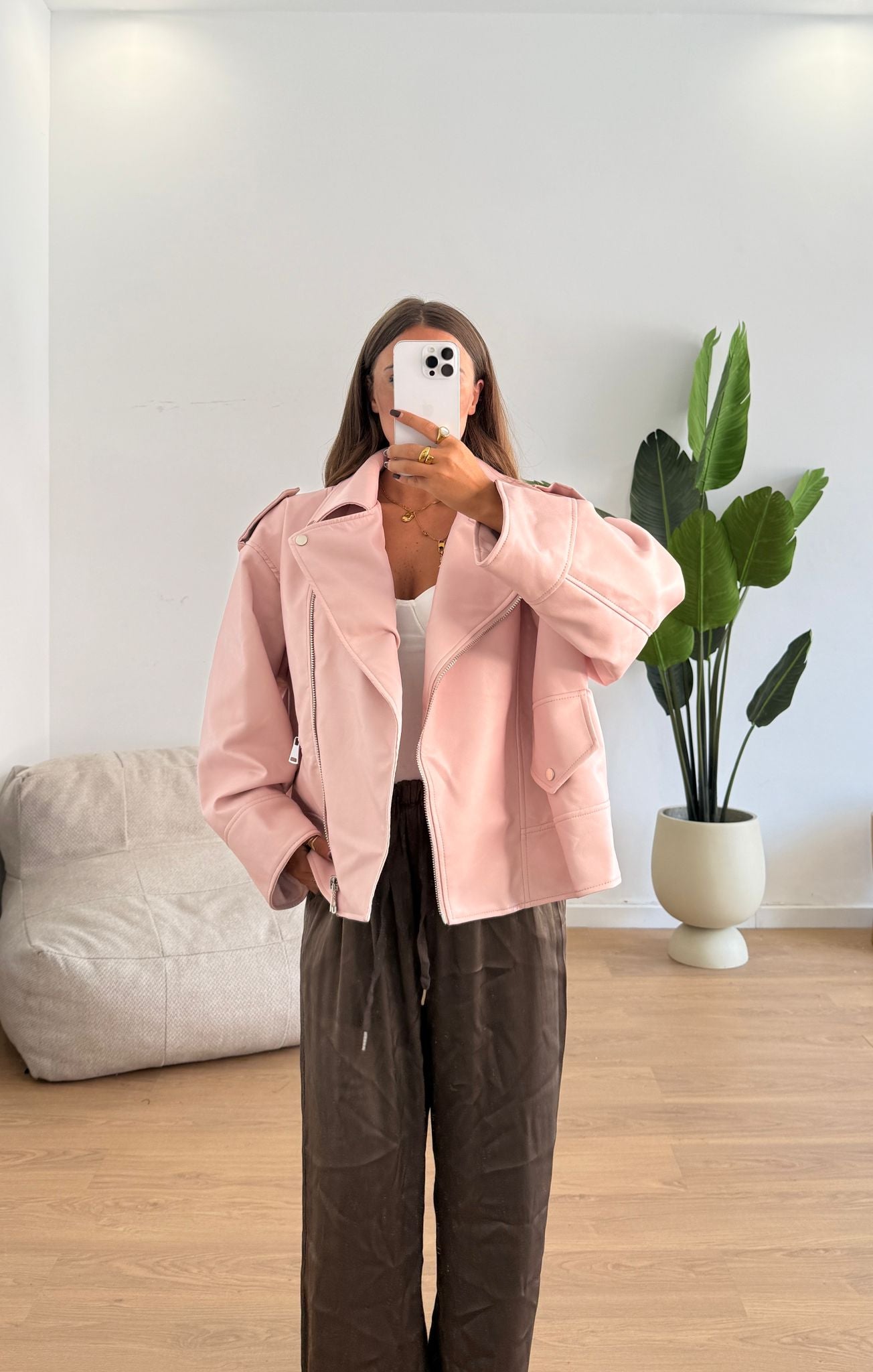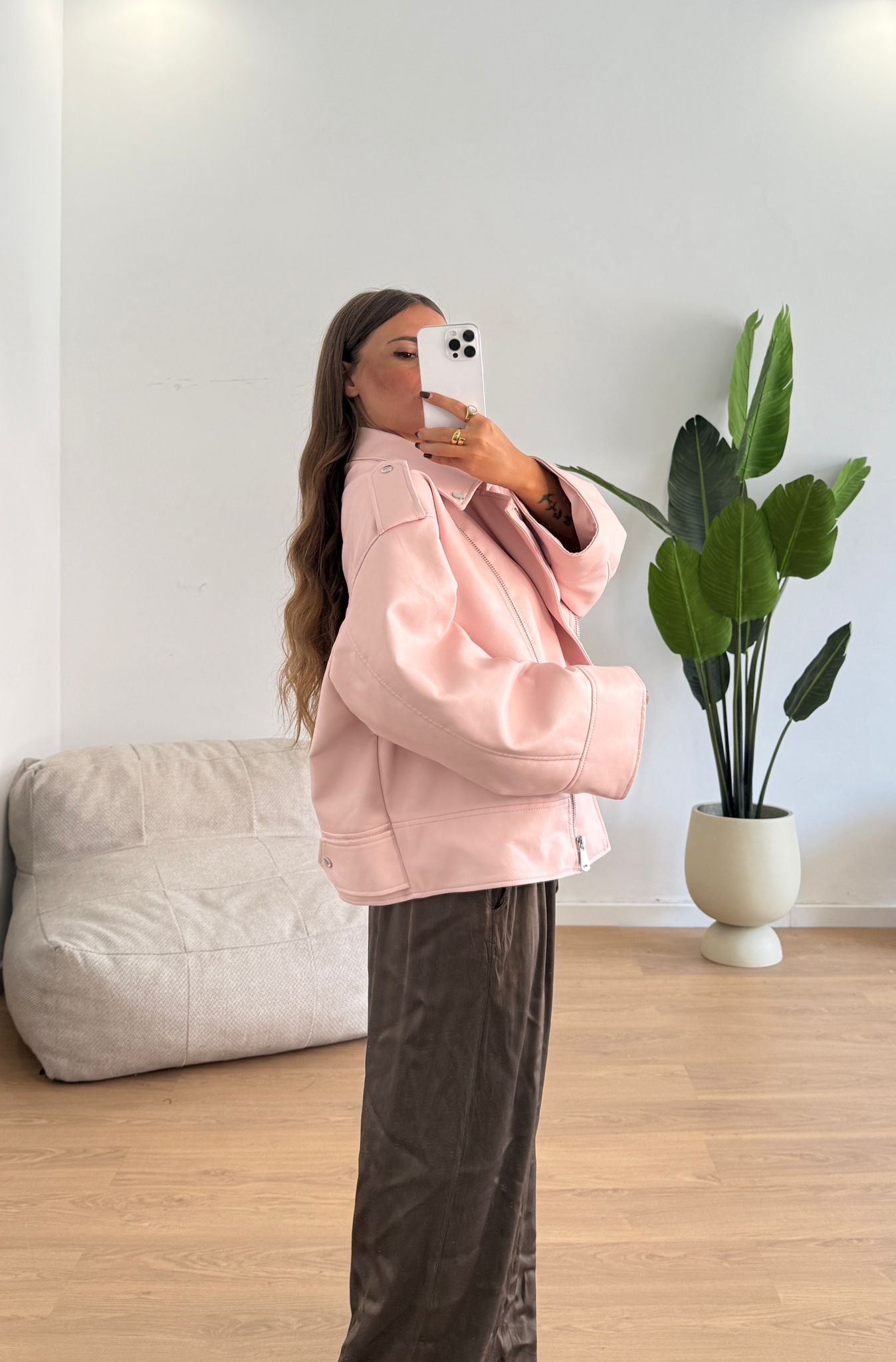 Chiodo oversize, ecopelle semi-lucido, con chiusura in avanti. Vestibilità fino ad una L/XL