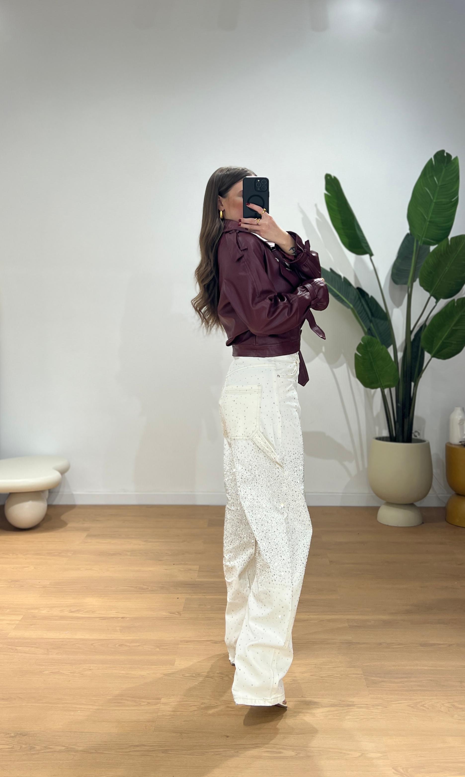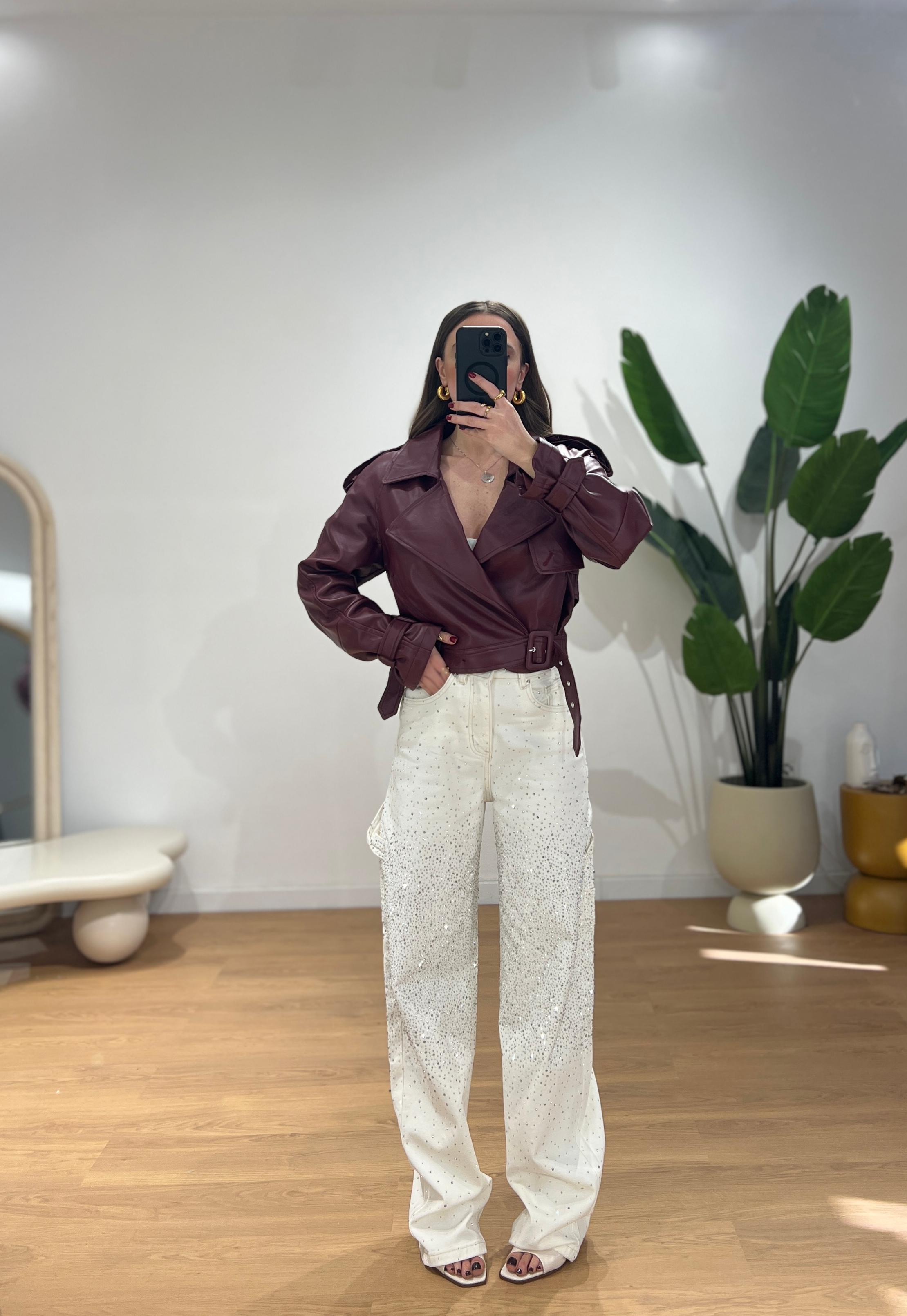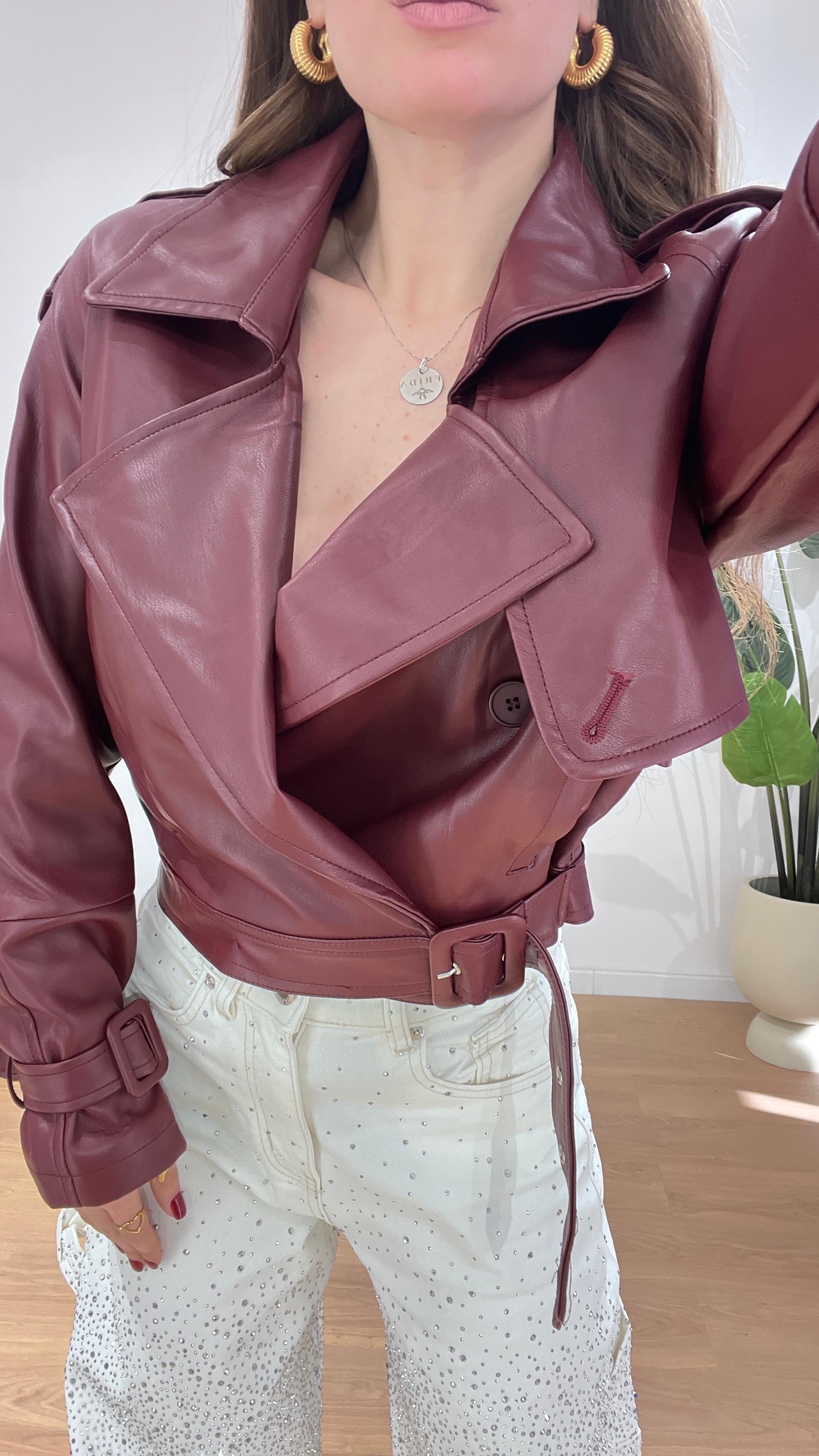 Giubbino di pelle, mix perfetto tra un chiodo classico ed una giacca Biker, con colletto ampio, cintura in vita, spalle leggermente strutturate e maniche con cinturini sui polsi. Giusy indossa la taglia XS/S.