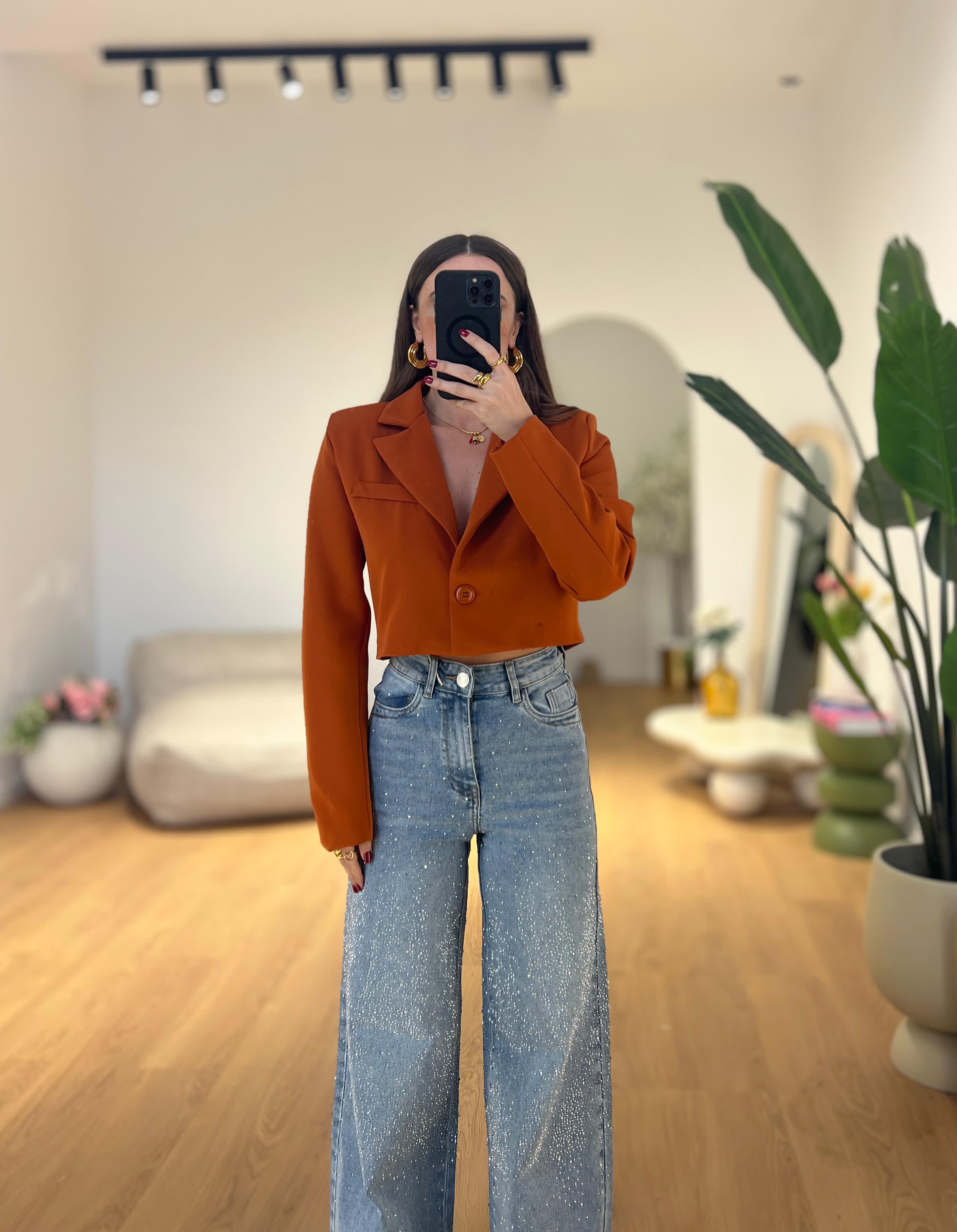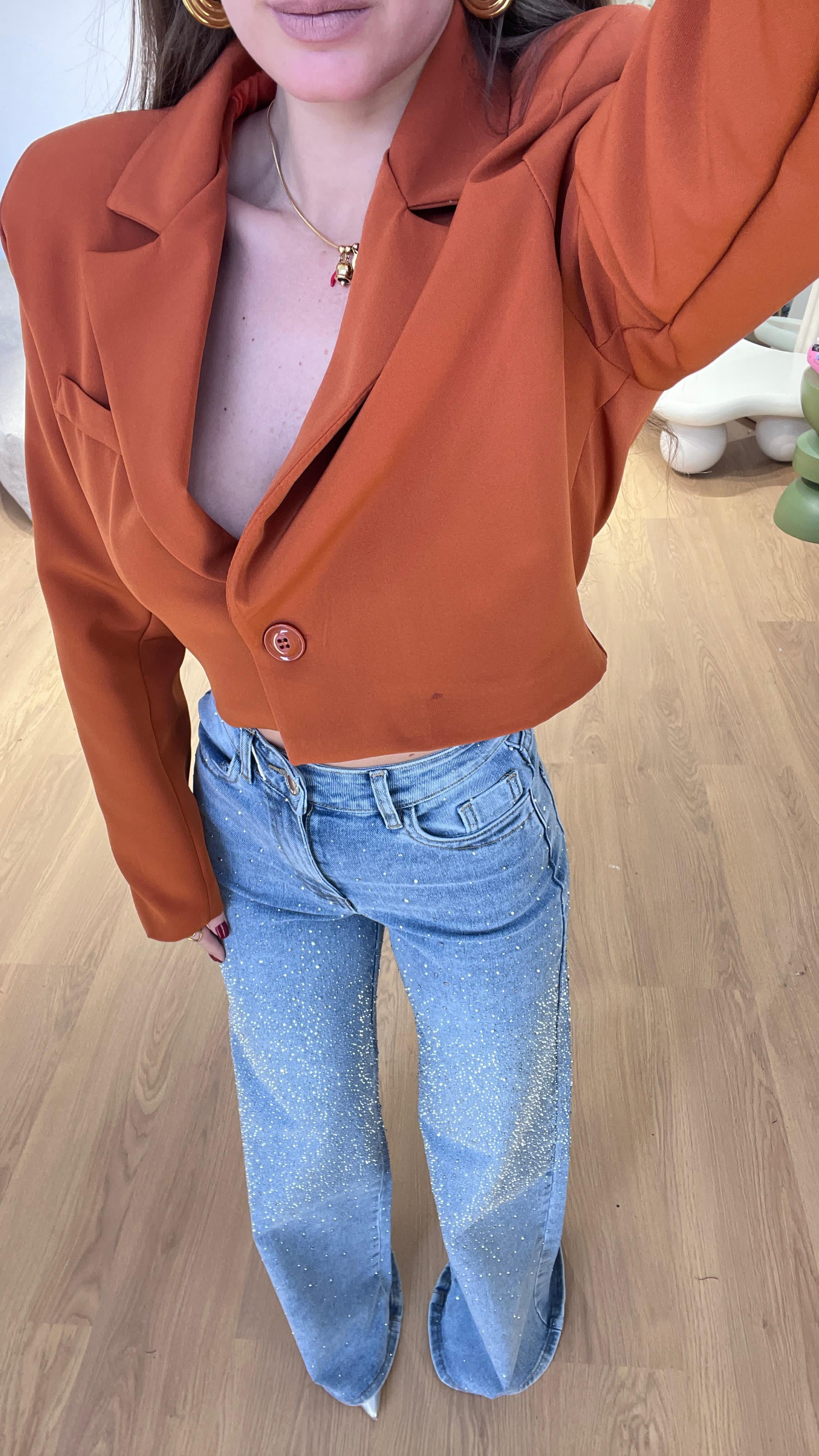 Giacca da donna crop con spalline imbottite, foderata internamente e chiusura con bottoncino sul davanti e vestirà bene fino ad una M/L