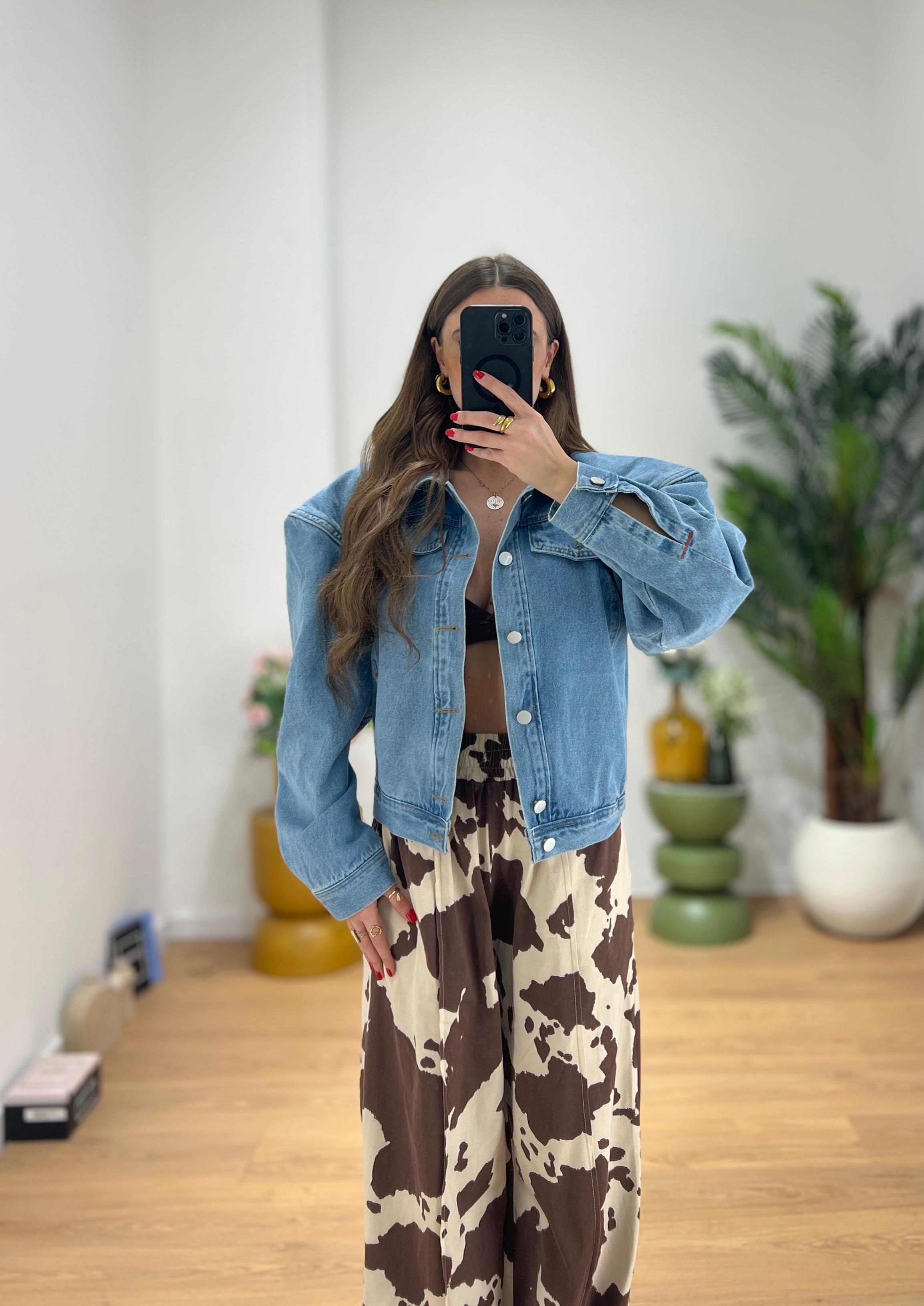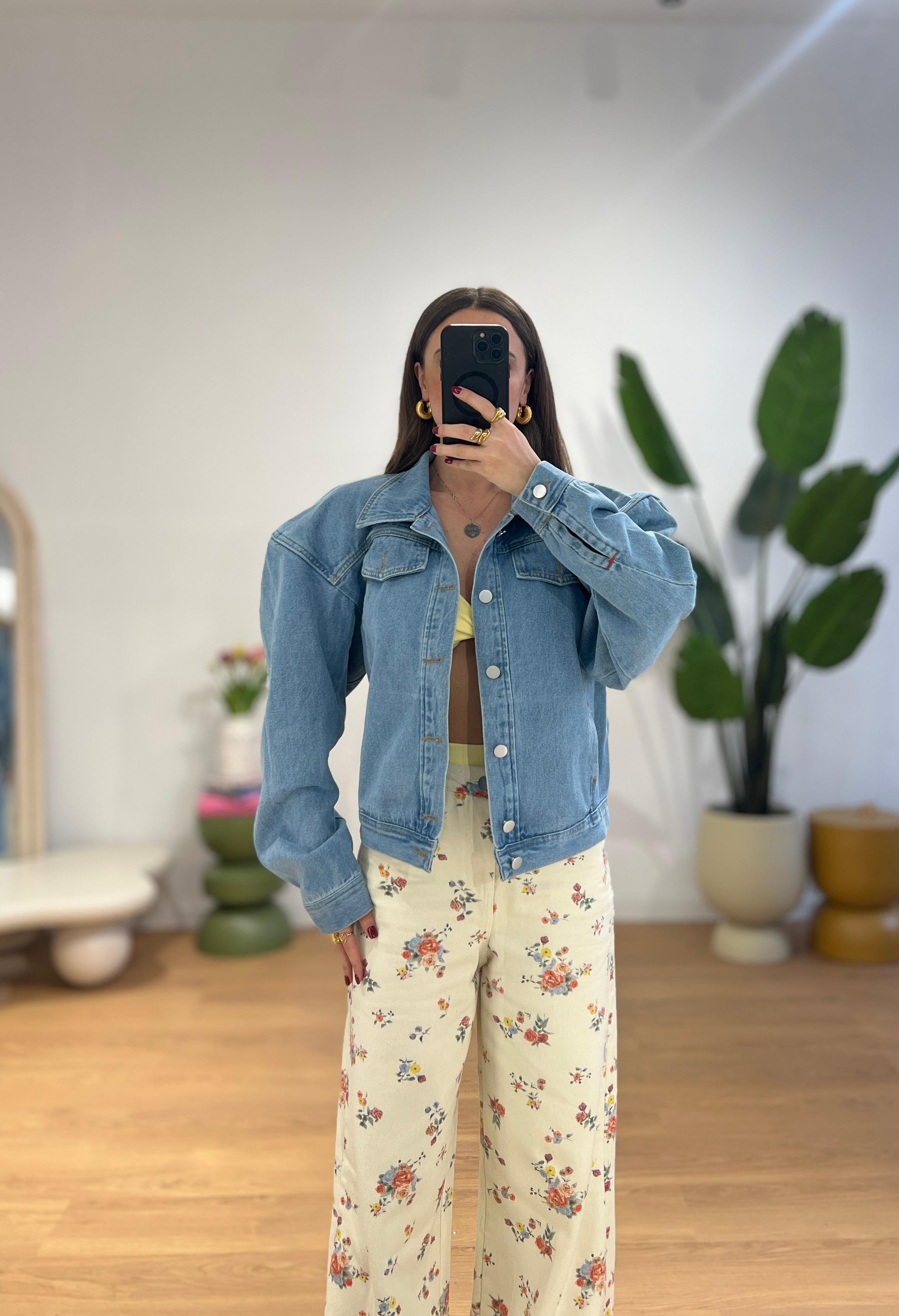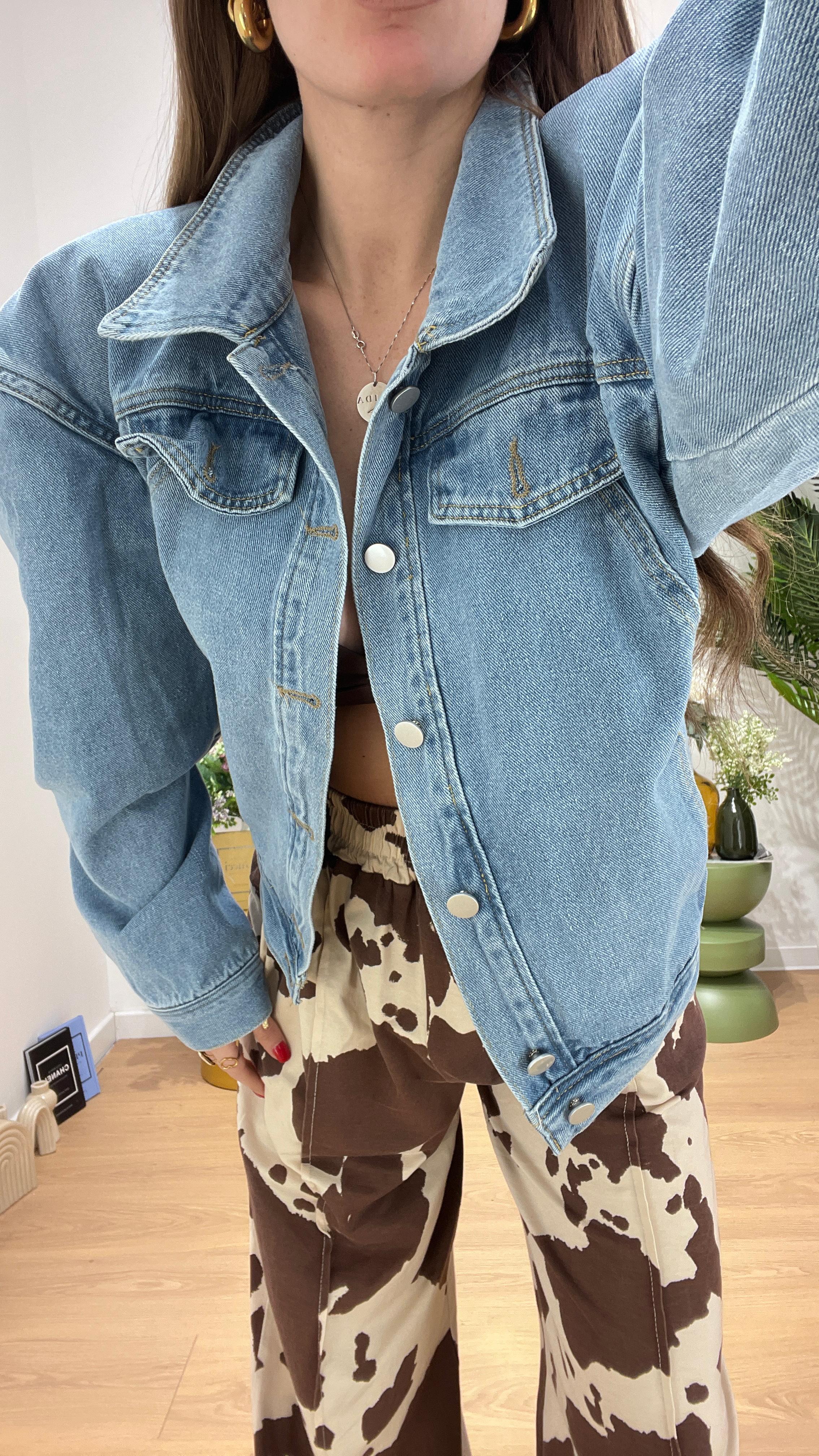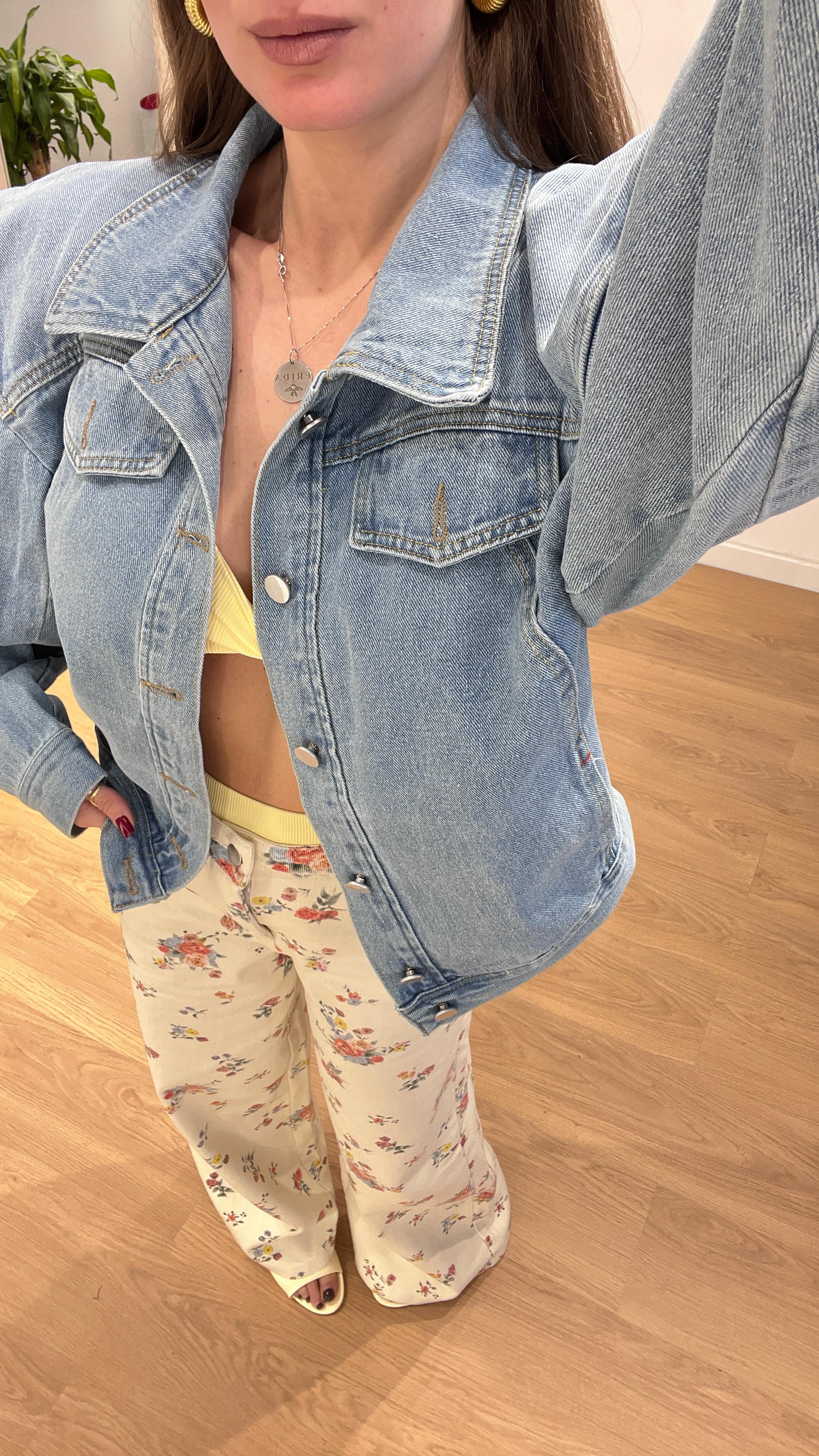 Giubbino da donna in denim chiaro con spalline imbottite e manica a farfalla, veste regolarmente la propria taglia e giusy indossa S/M