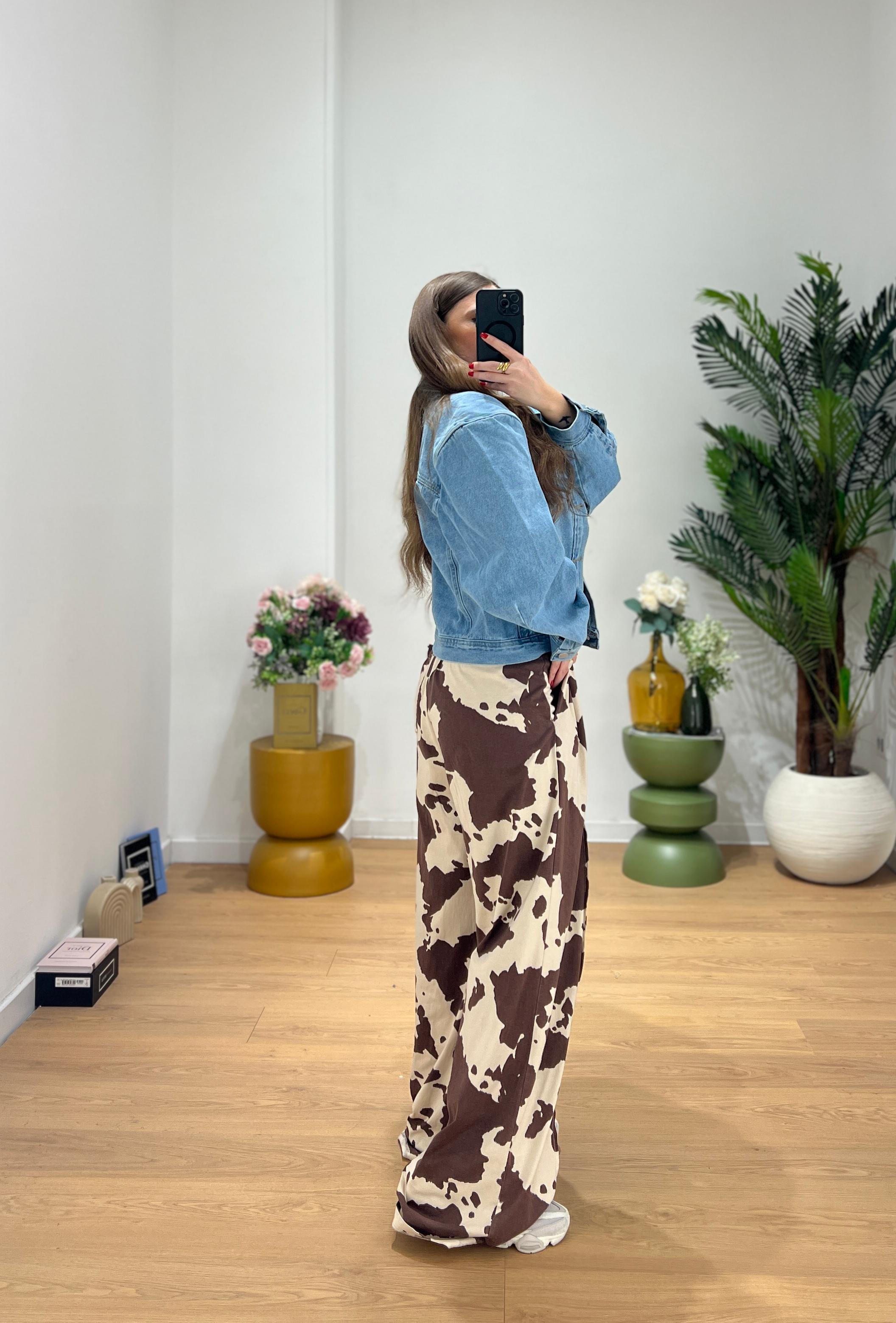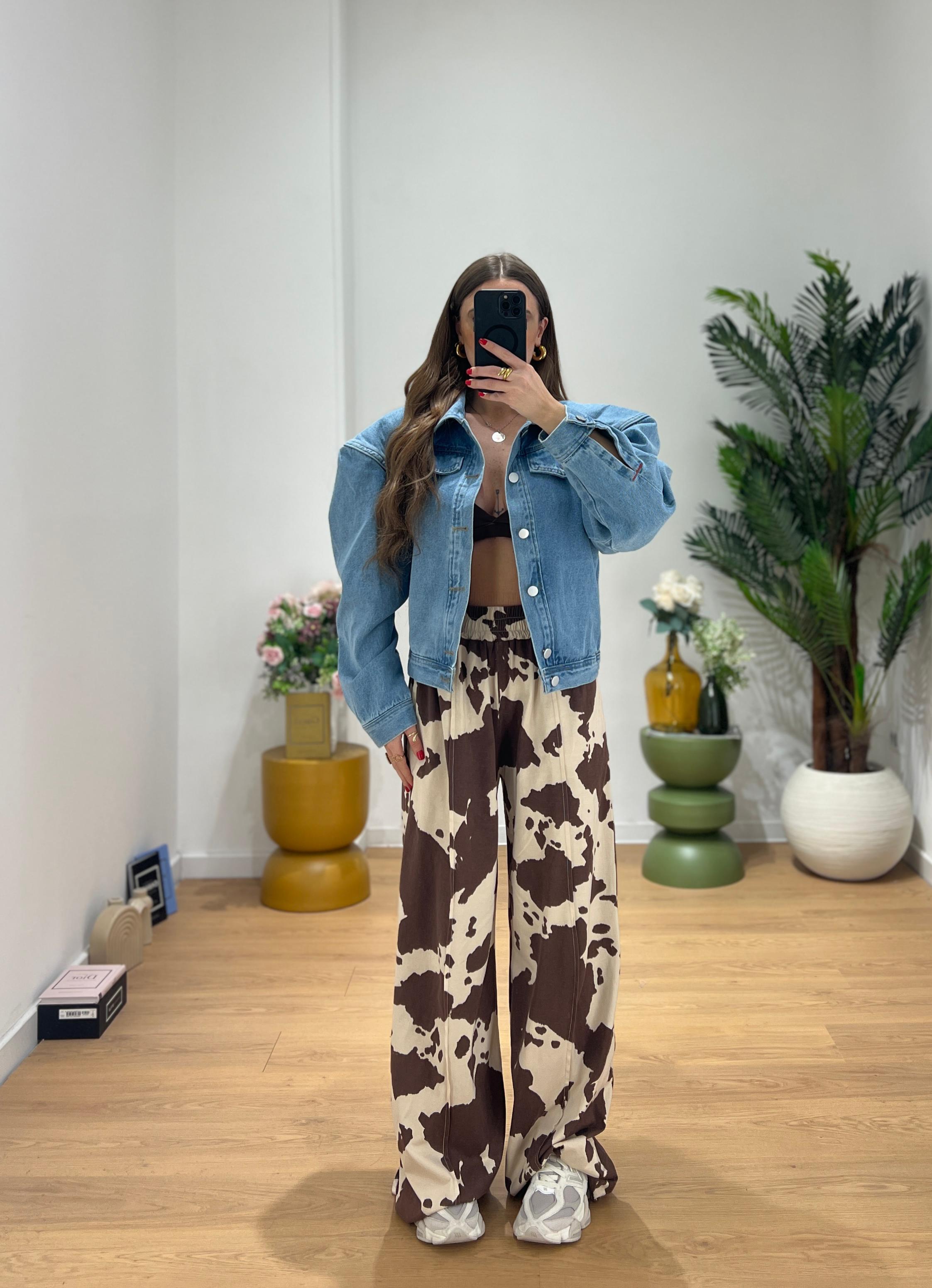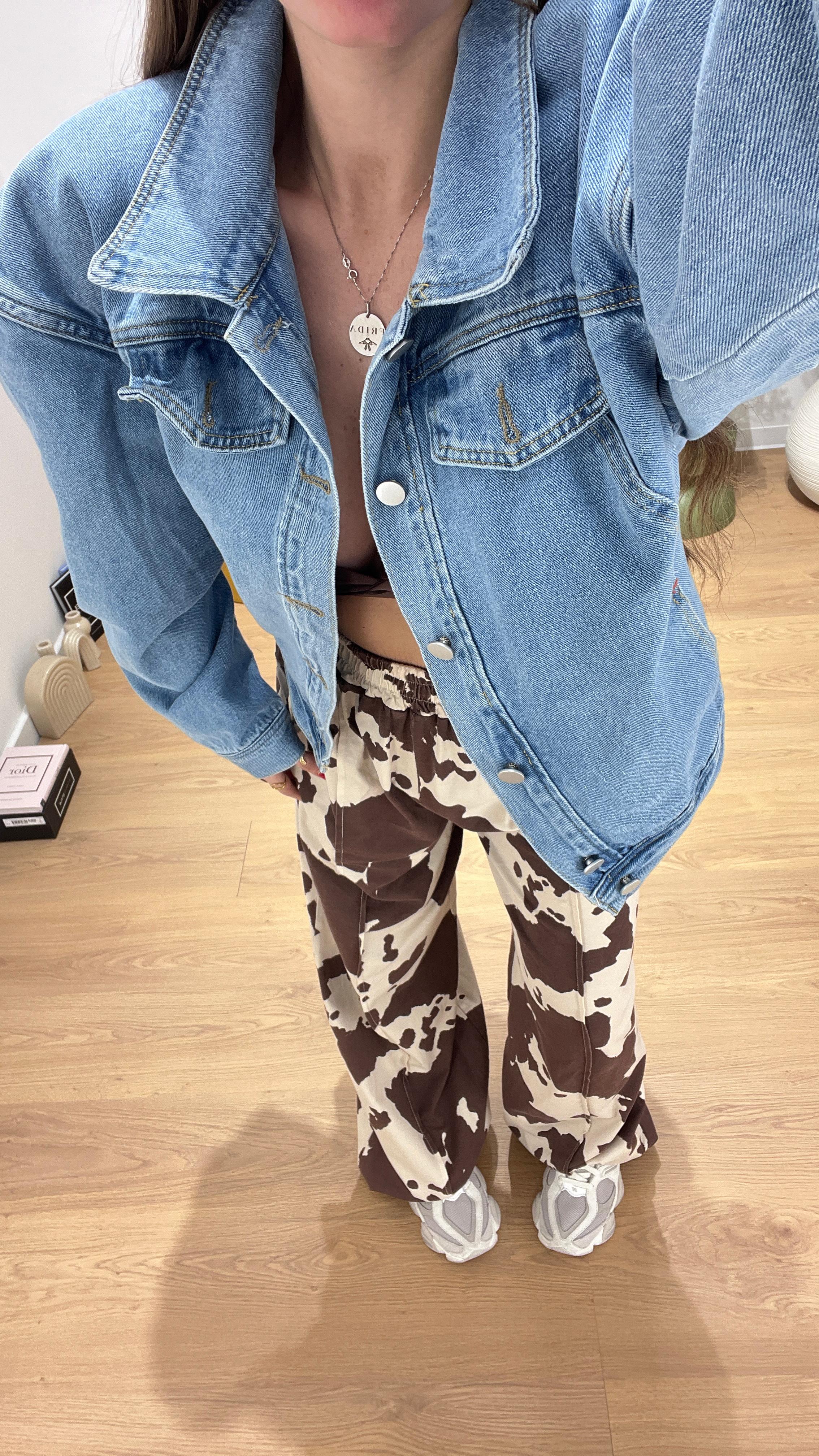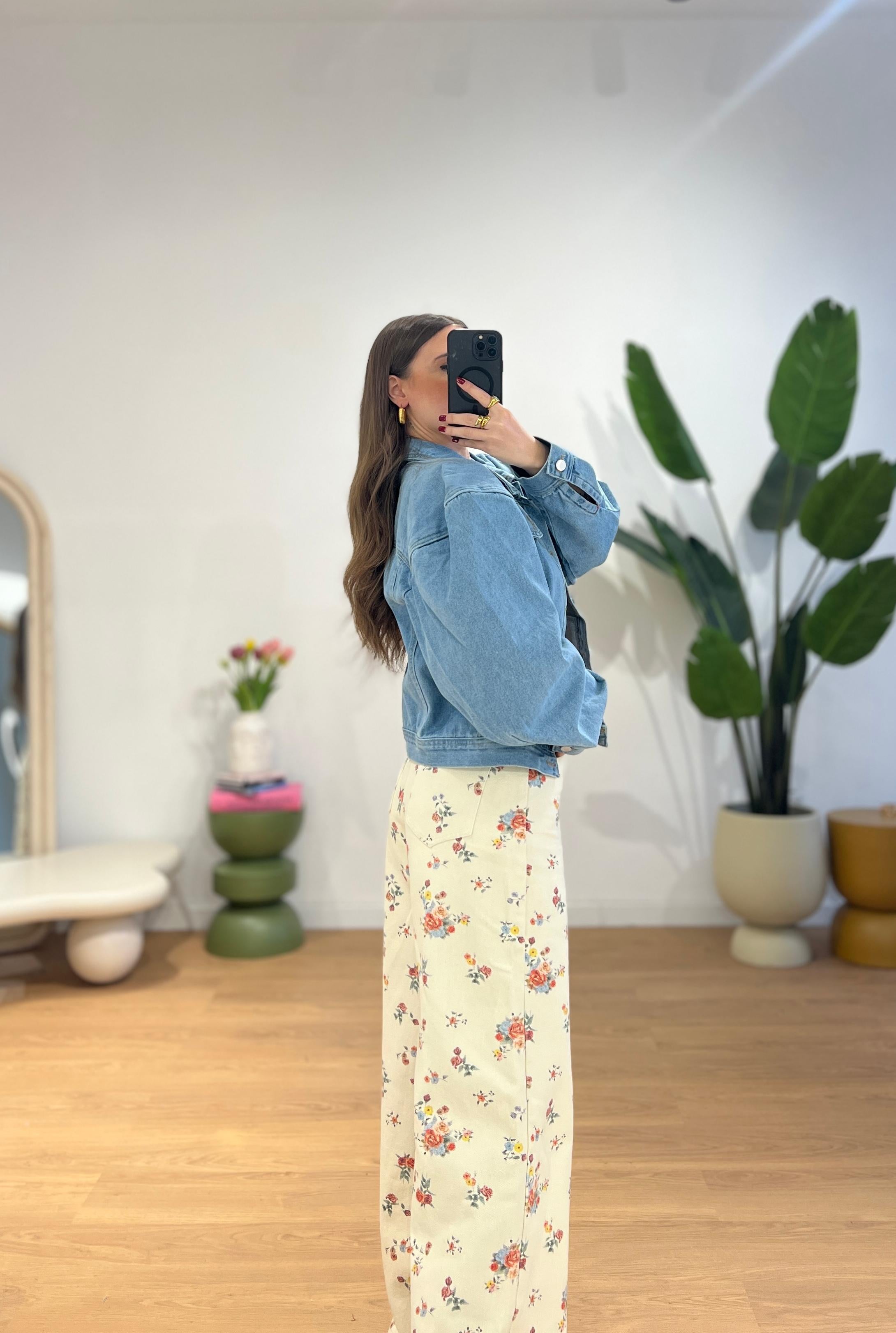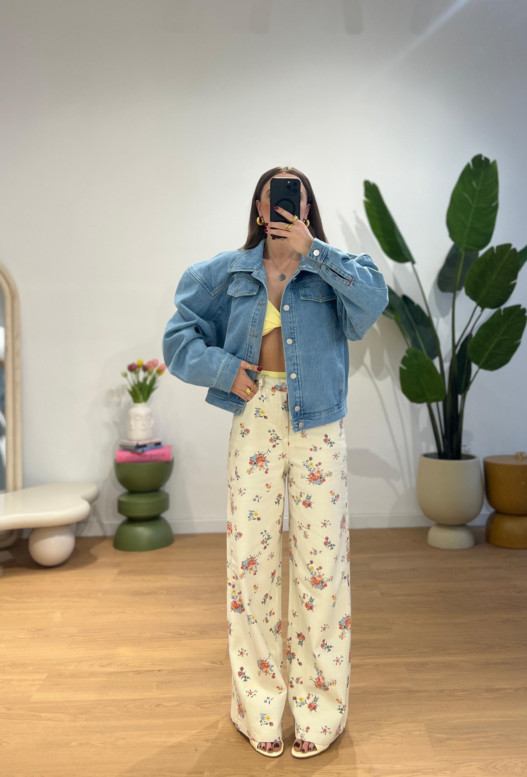 Giubbino da donna in denim chiaro con spalline imbottite e manica a farfalla, veste regolarmente la propria taglia e giusy indossa S/M