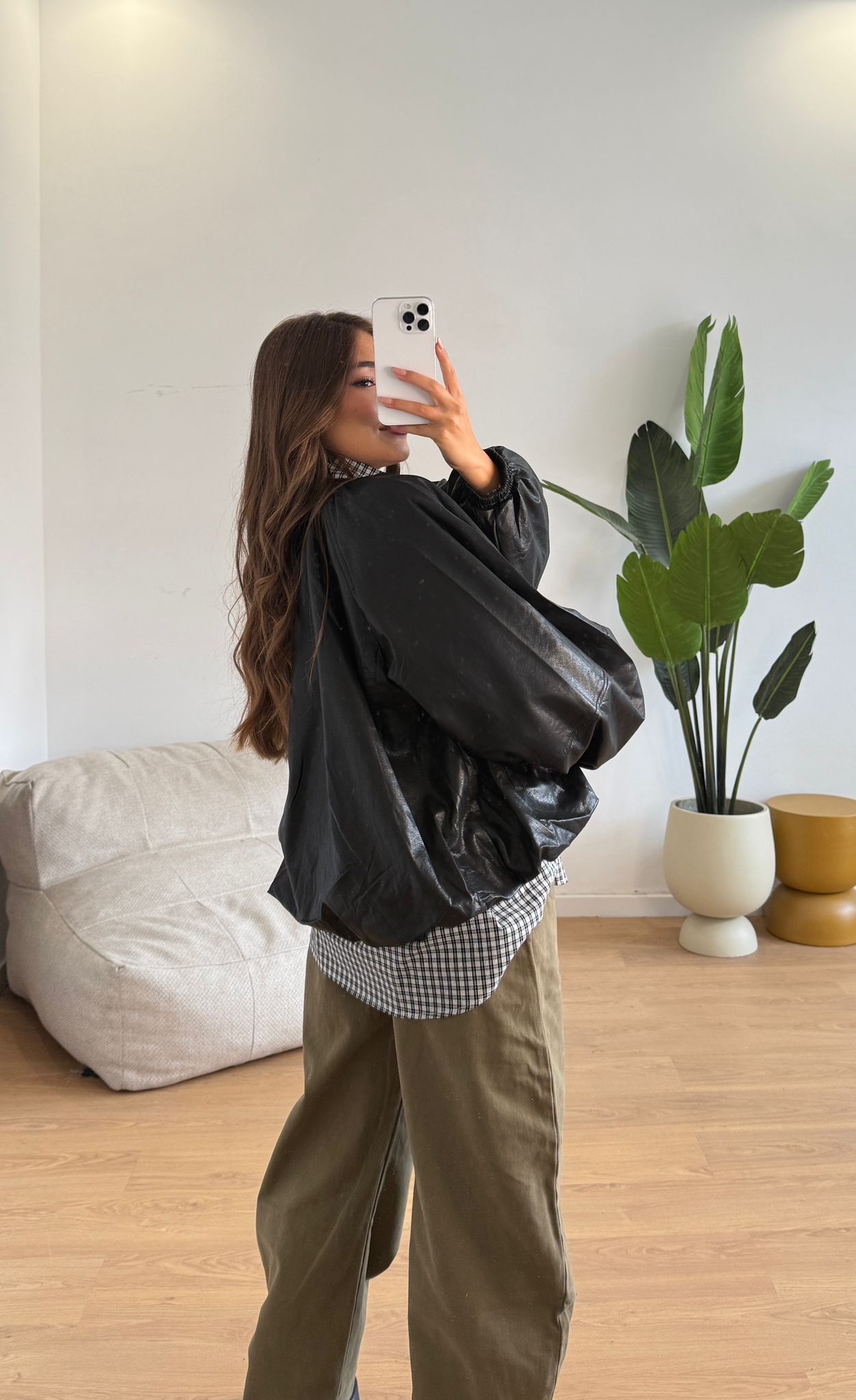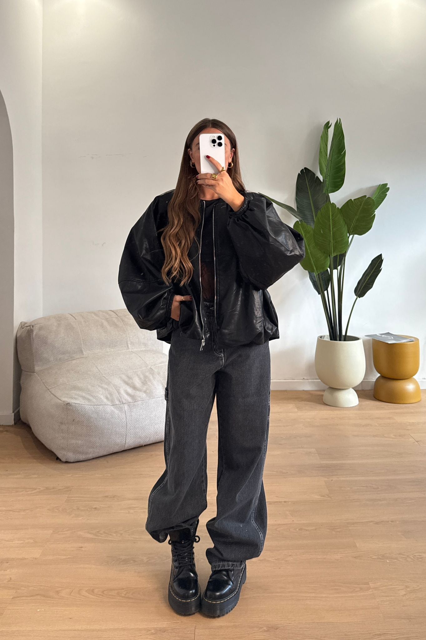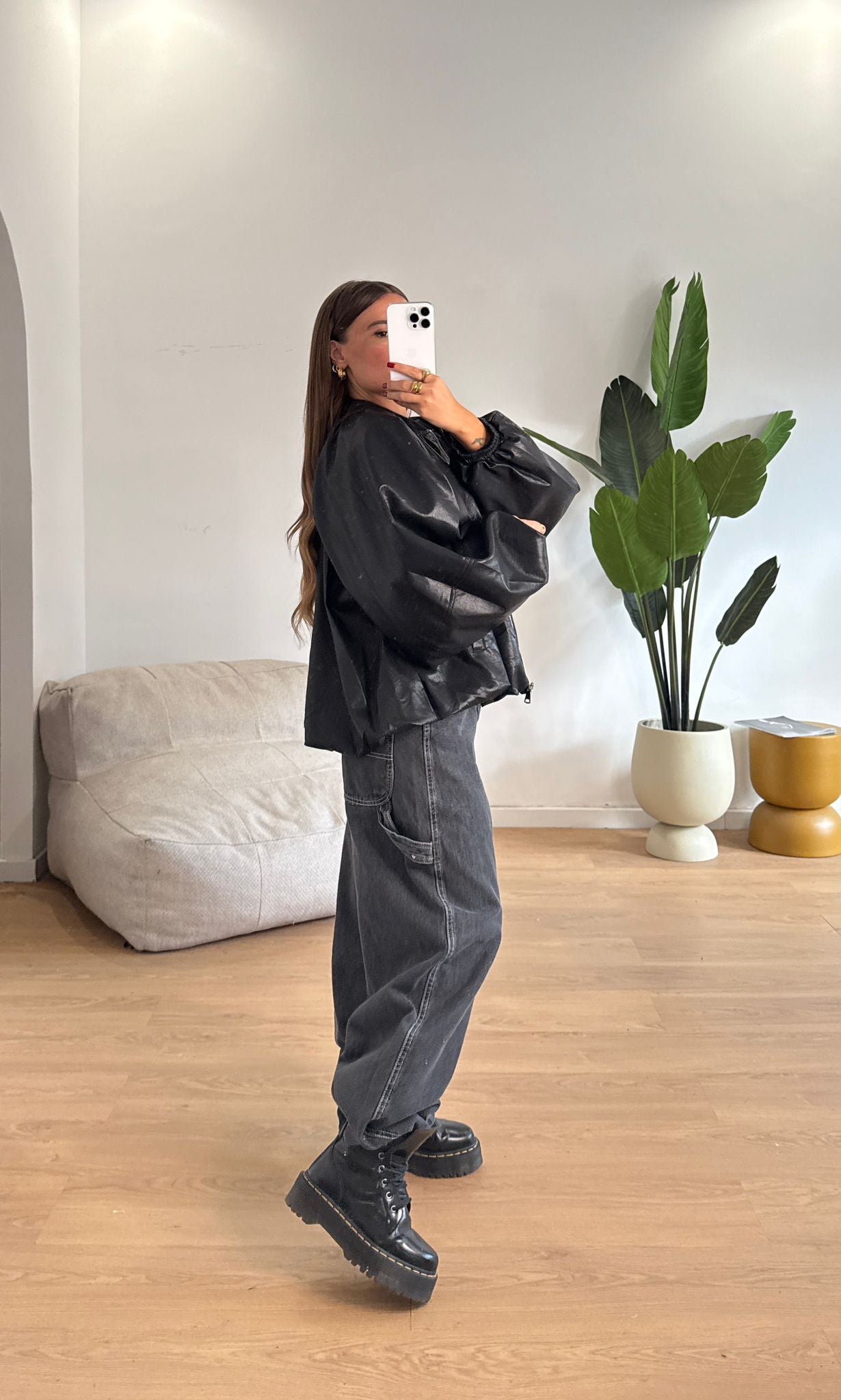 Giubbino da donna in ecopelle con chiusura zip sul davanti. Taglia unica, veste bene fino ad una 46.
