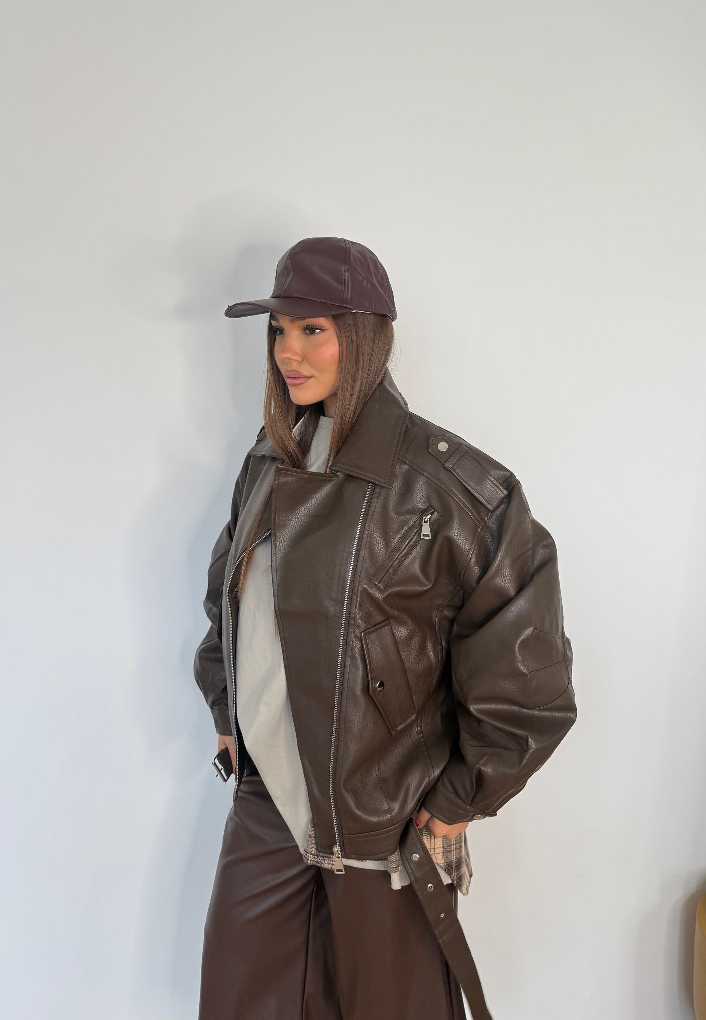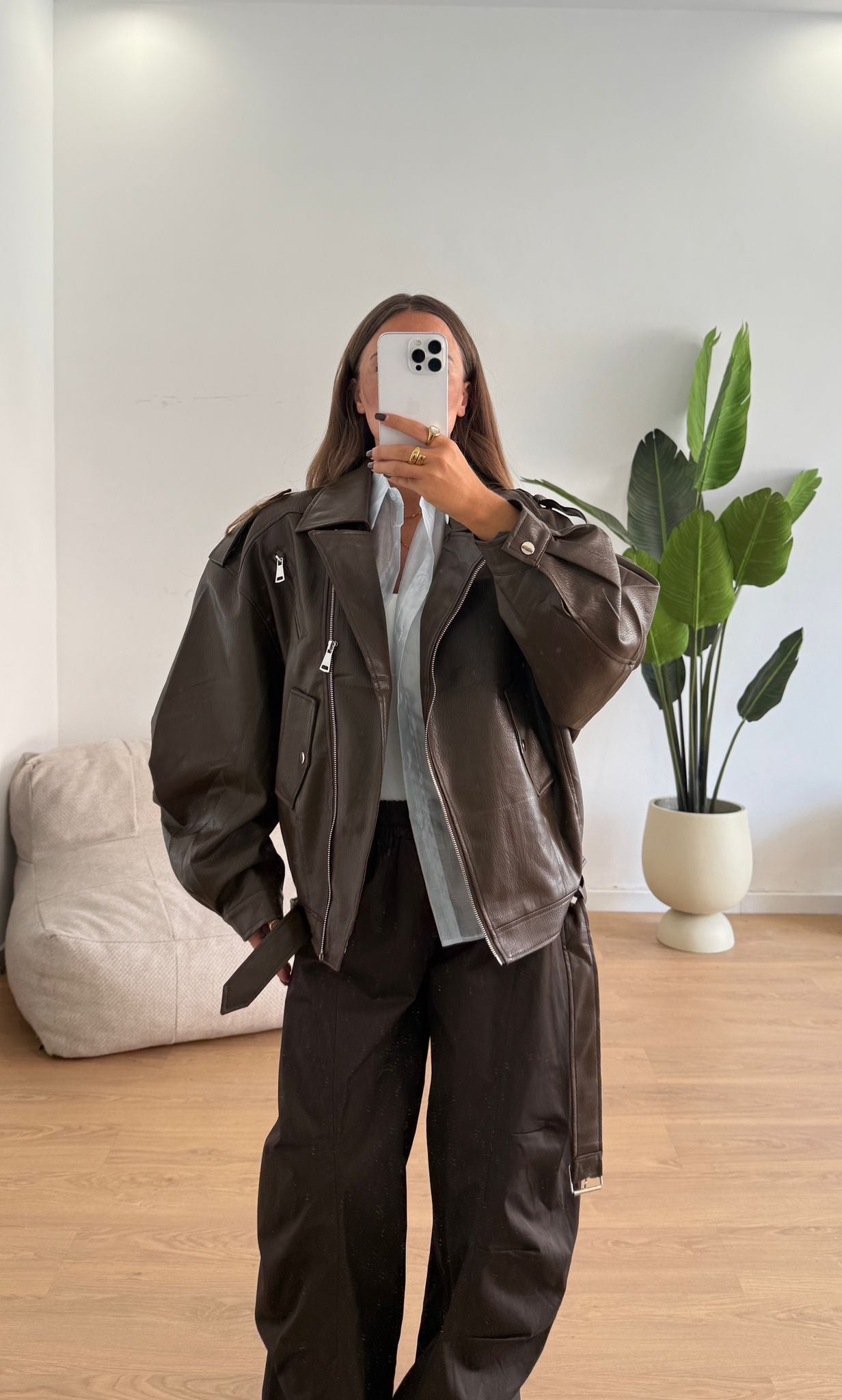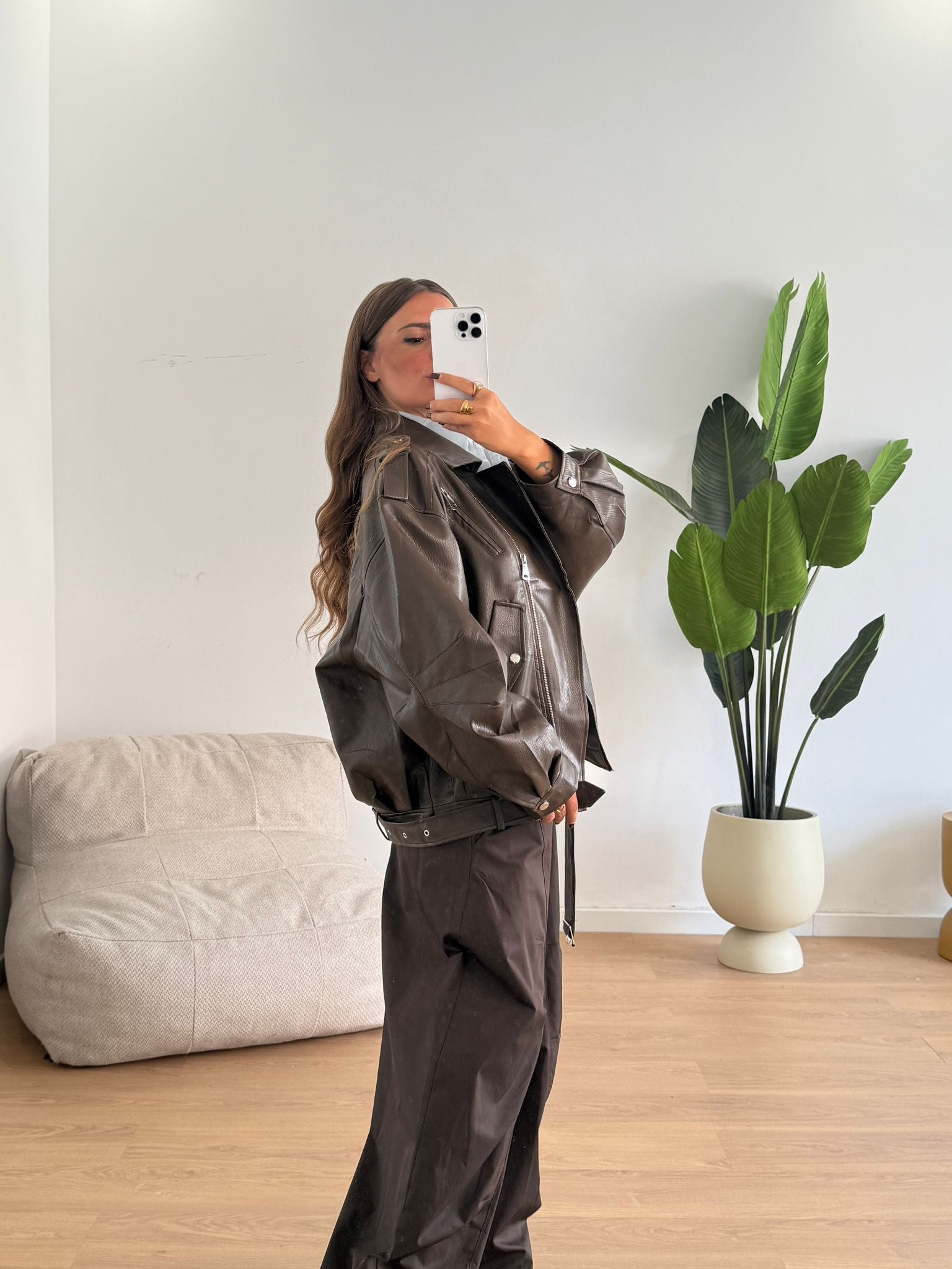 Chiodo in ecopelle, vestibilità oversize, manica a sbuffo con chiusura zip e vestirà bene fino ad una L/XL