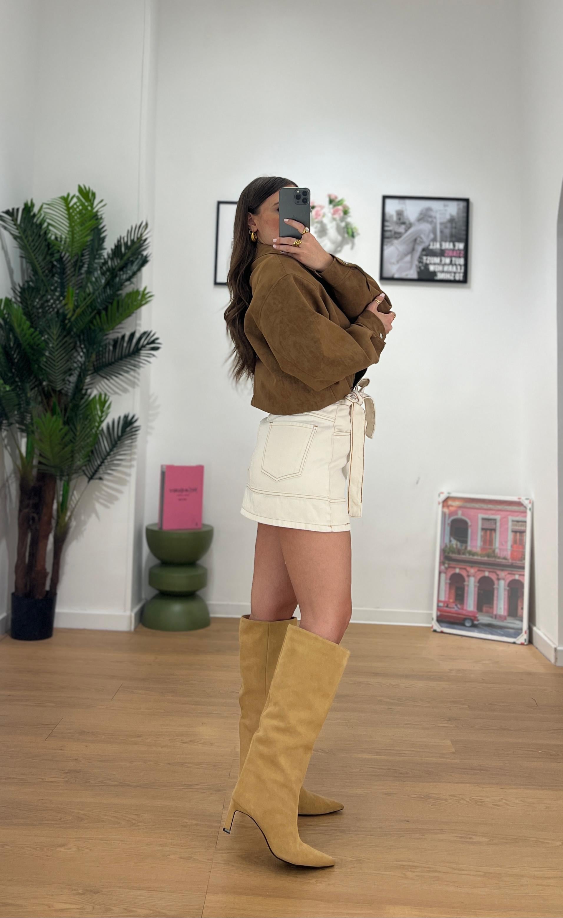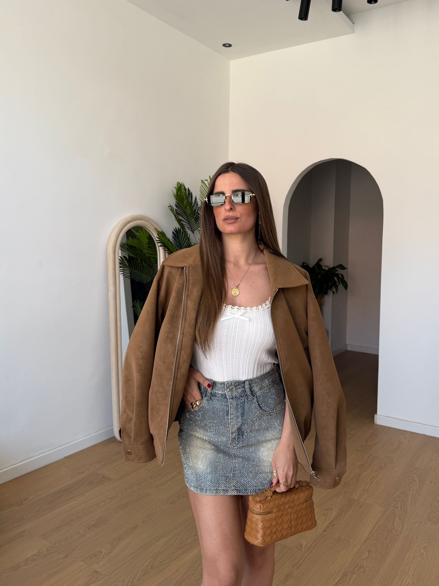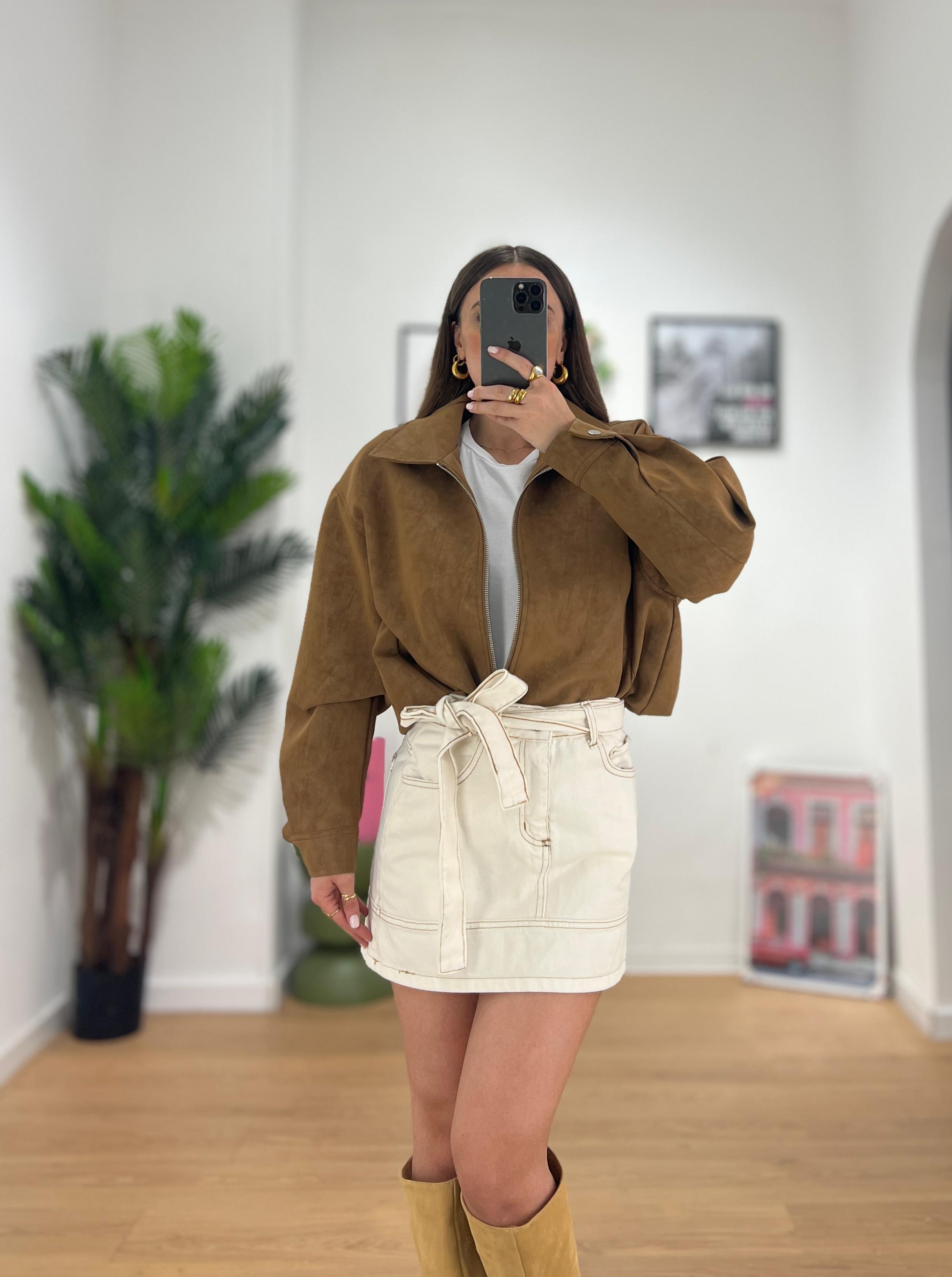 Giubbino da donna top quality, tessuto effetto camoscio e veste regolarmente la propria taglia e Giusy indossa taglia S