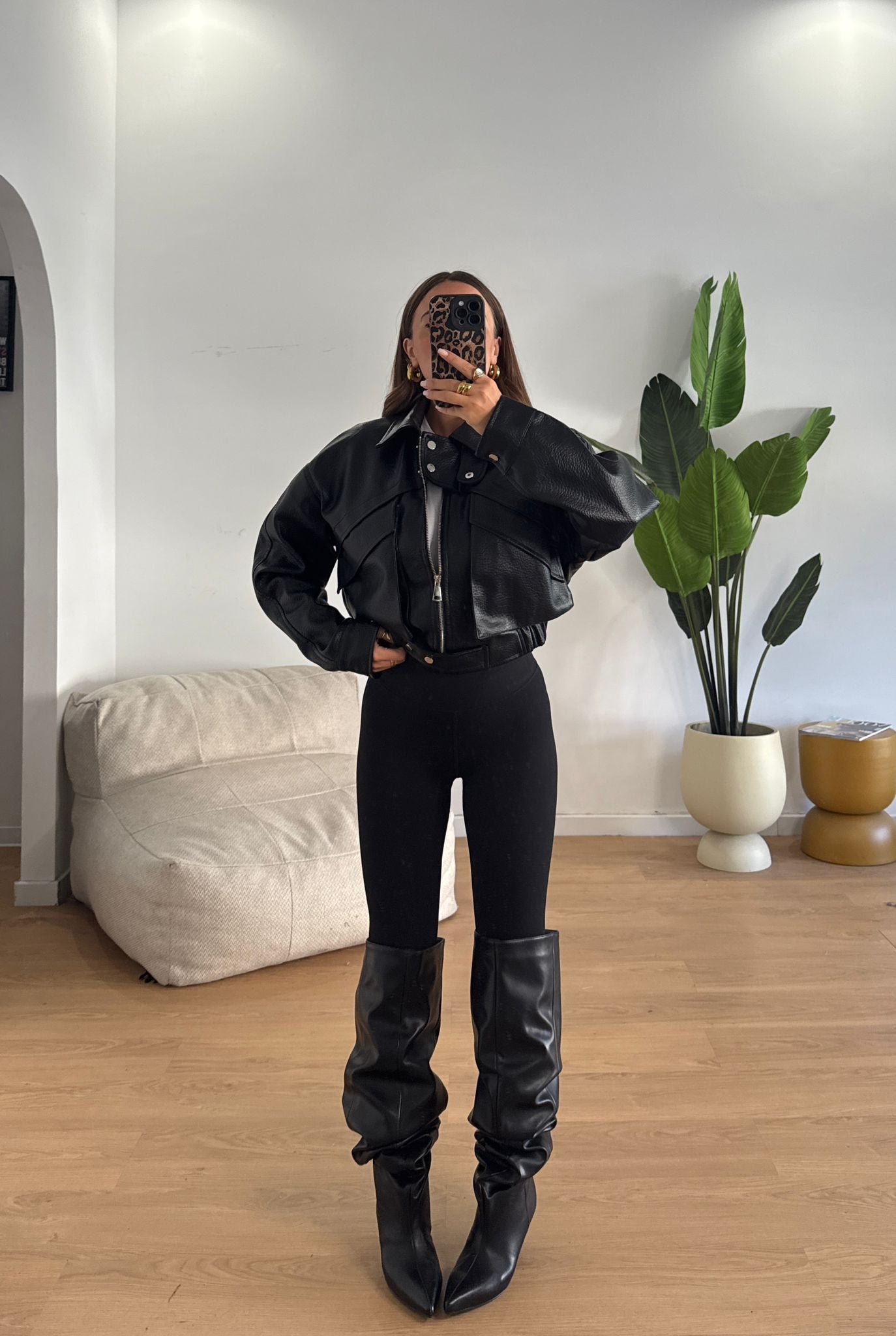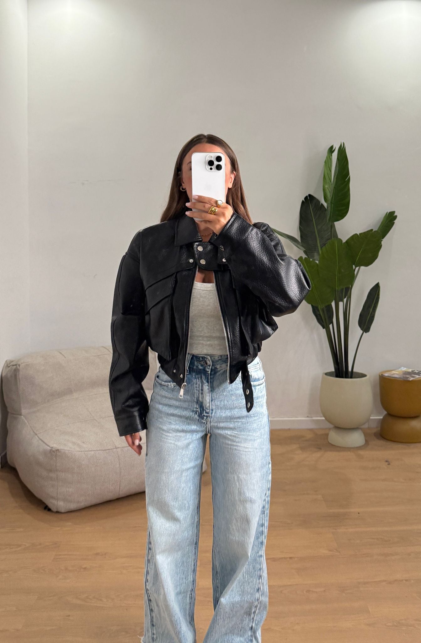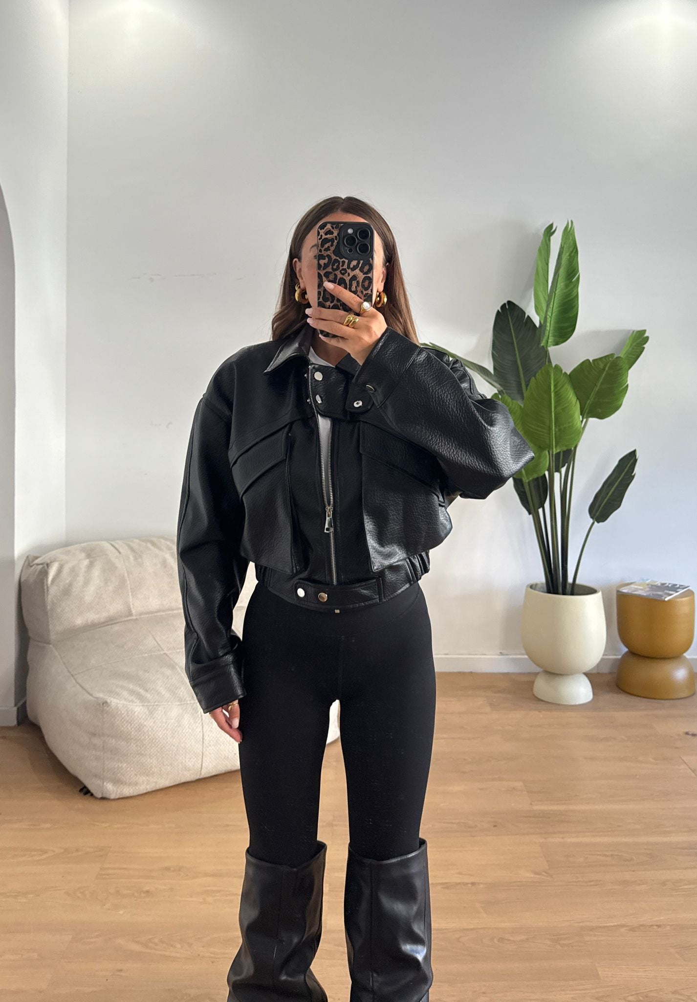 Giubbino da donna in ecopelle foderato internamente e veste regolarmente la propria taglia e la modella indossa taglia S/M