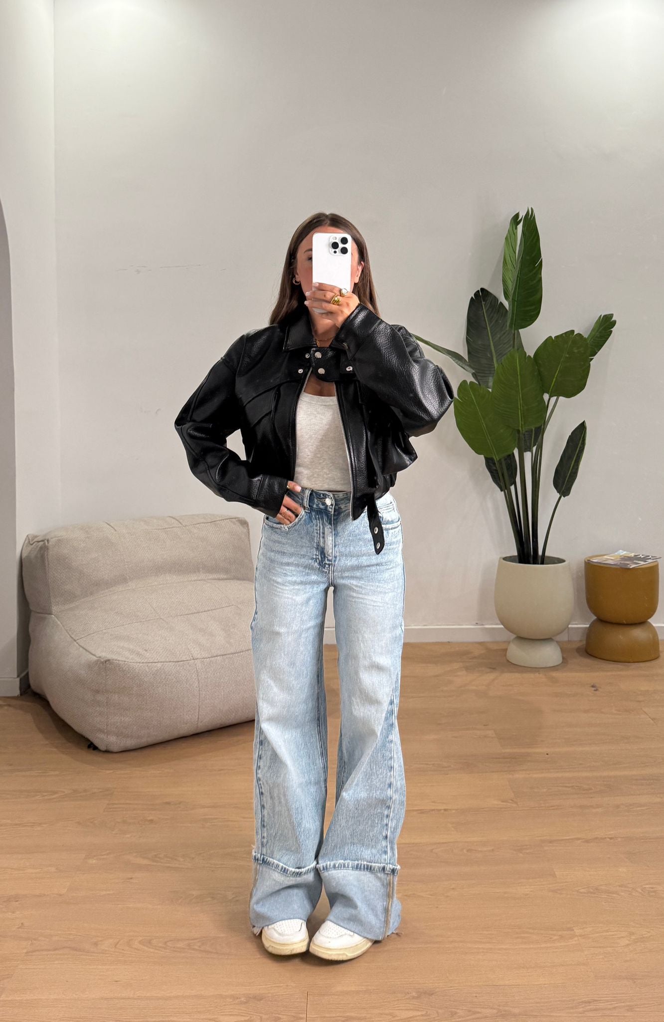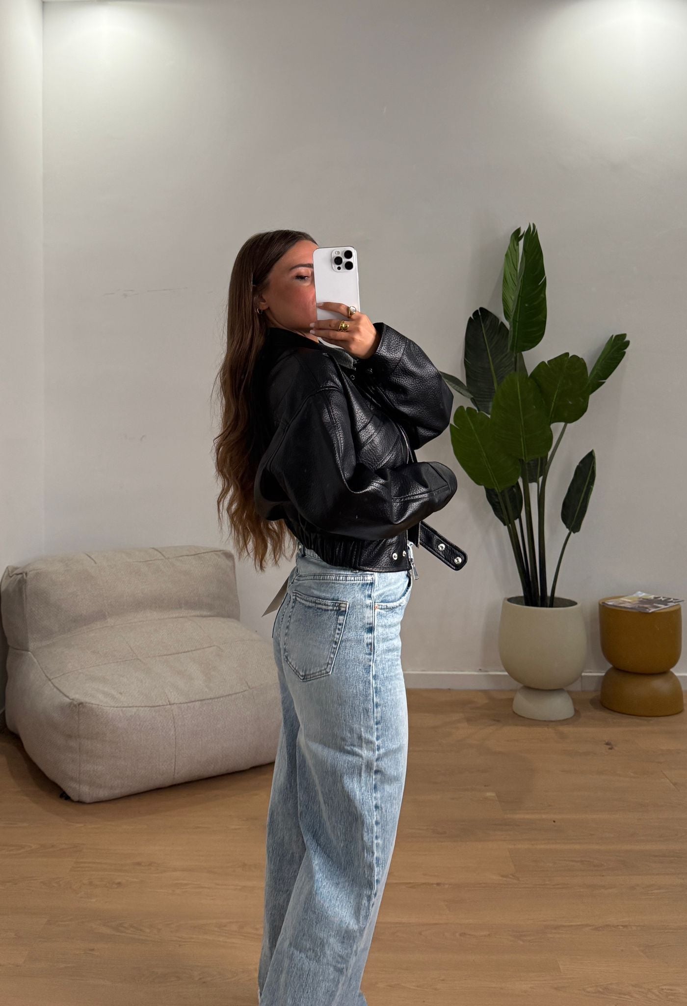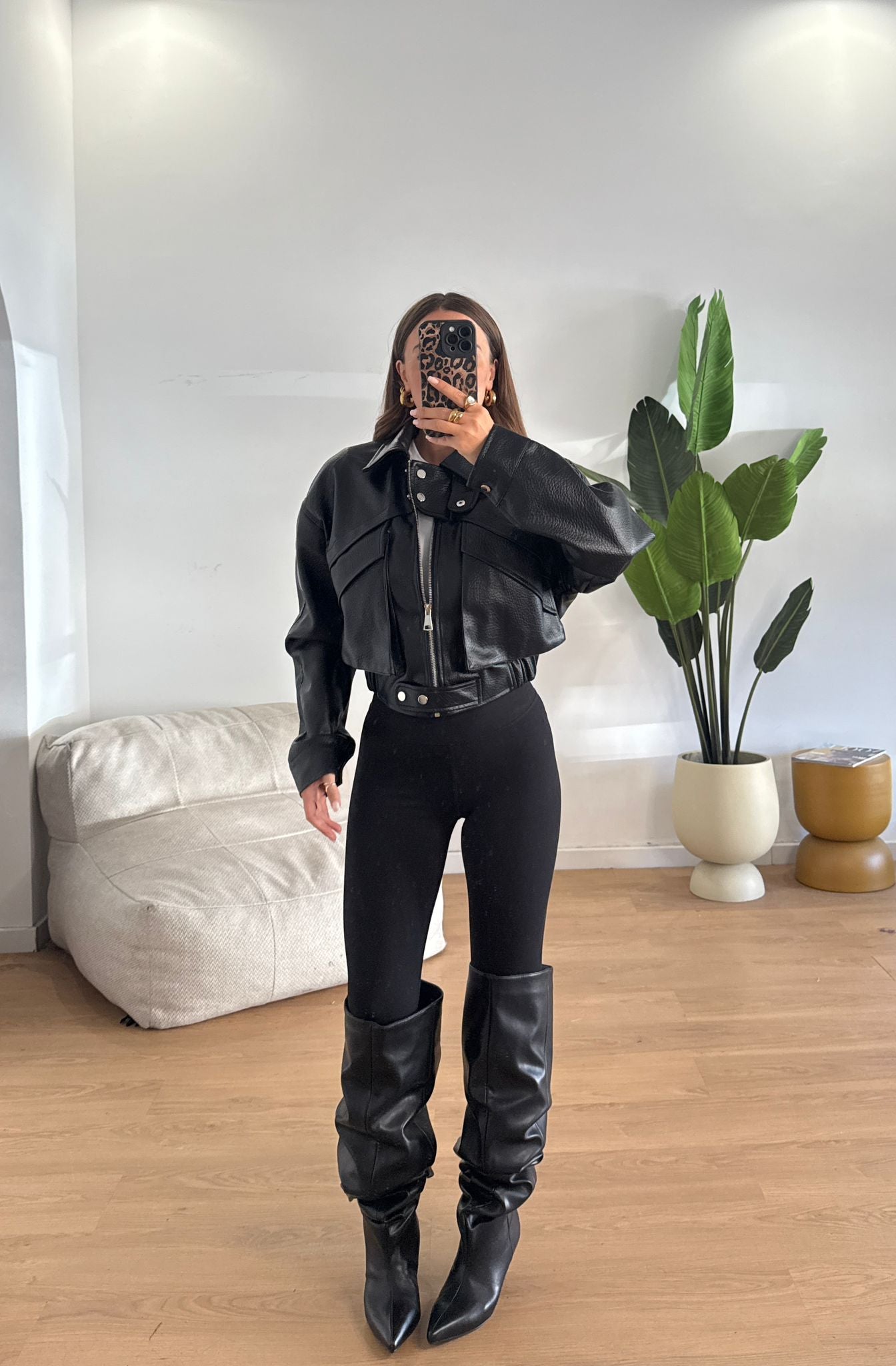 Giubbino da donna in ecopelle foderato internamente e veste regolarmente la propria taglia e la modella indossa taglia S/M