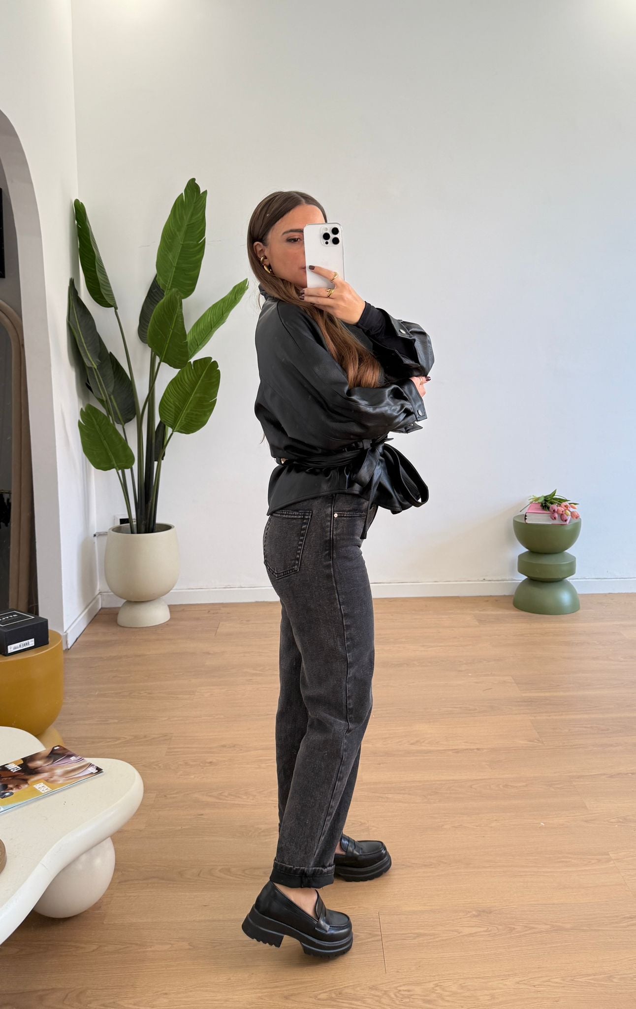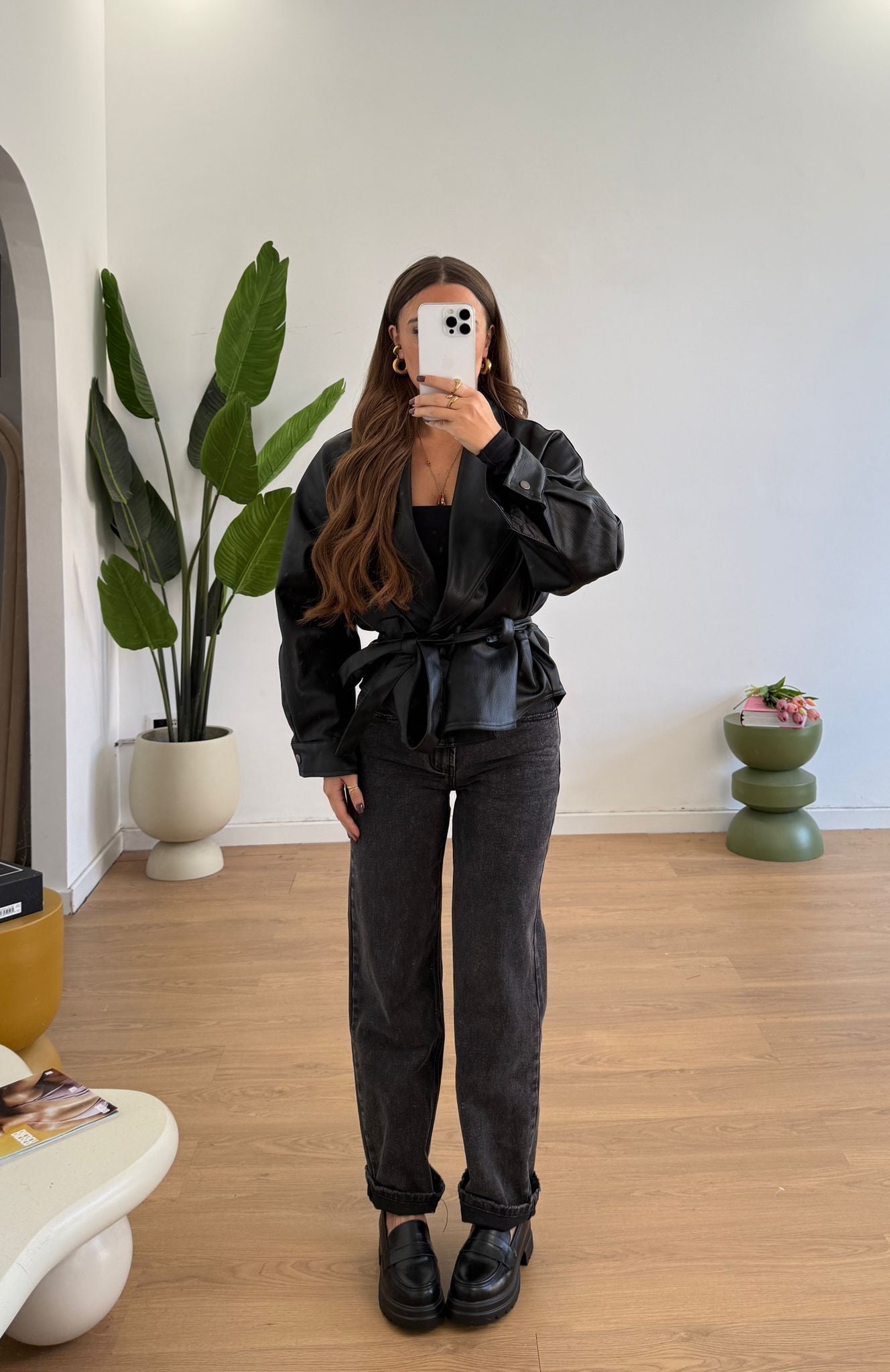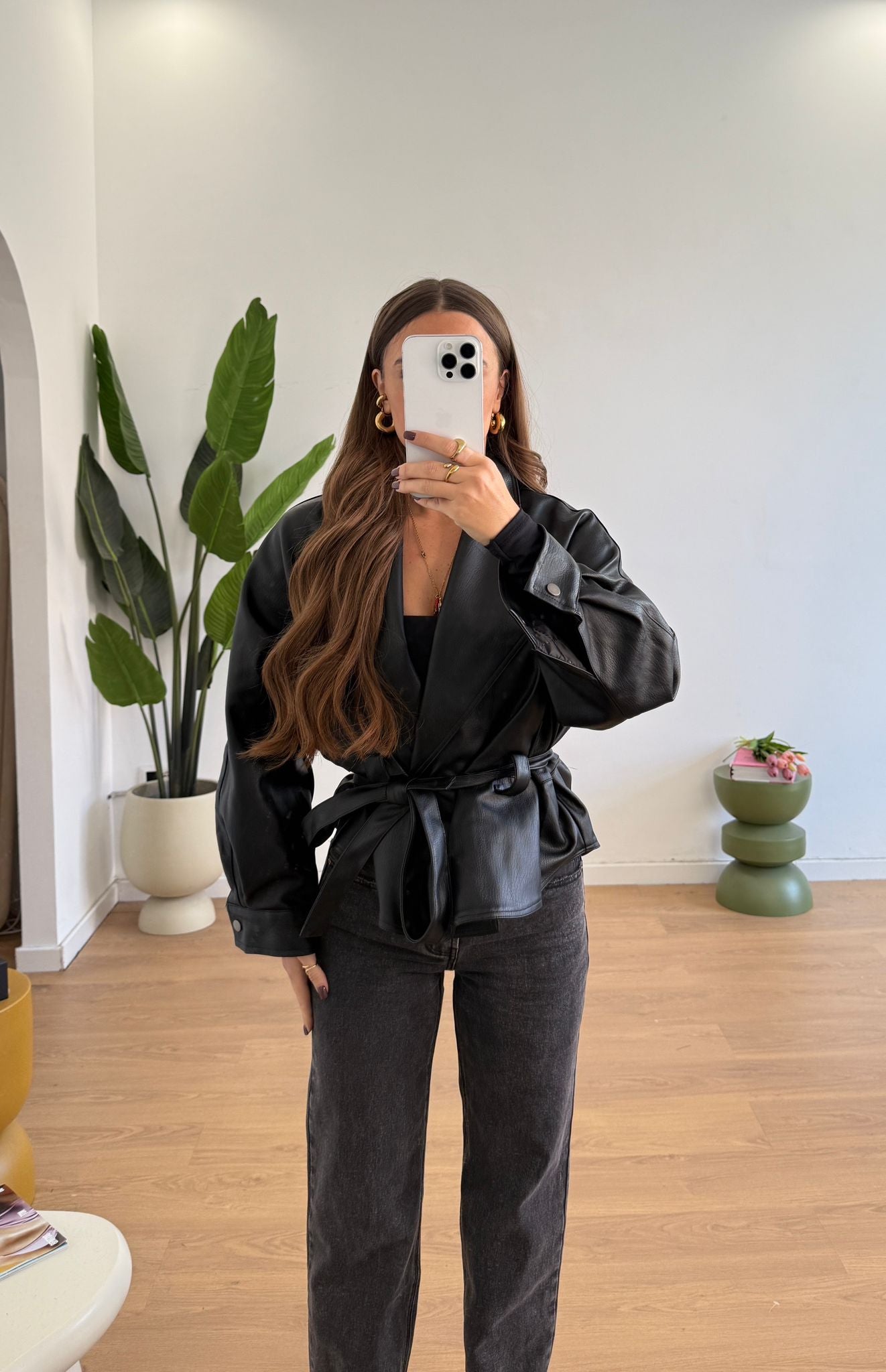 Giubbino da donna in ecopelle con cintura foderato internamente, vestibilità oversize e vestirà bene fino ad una M/L