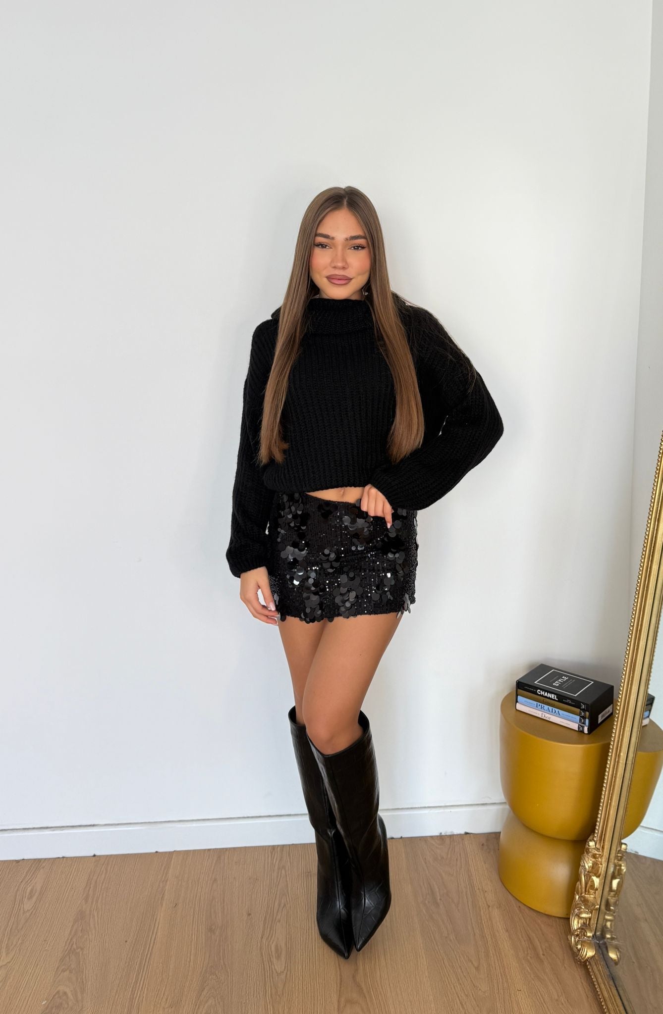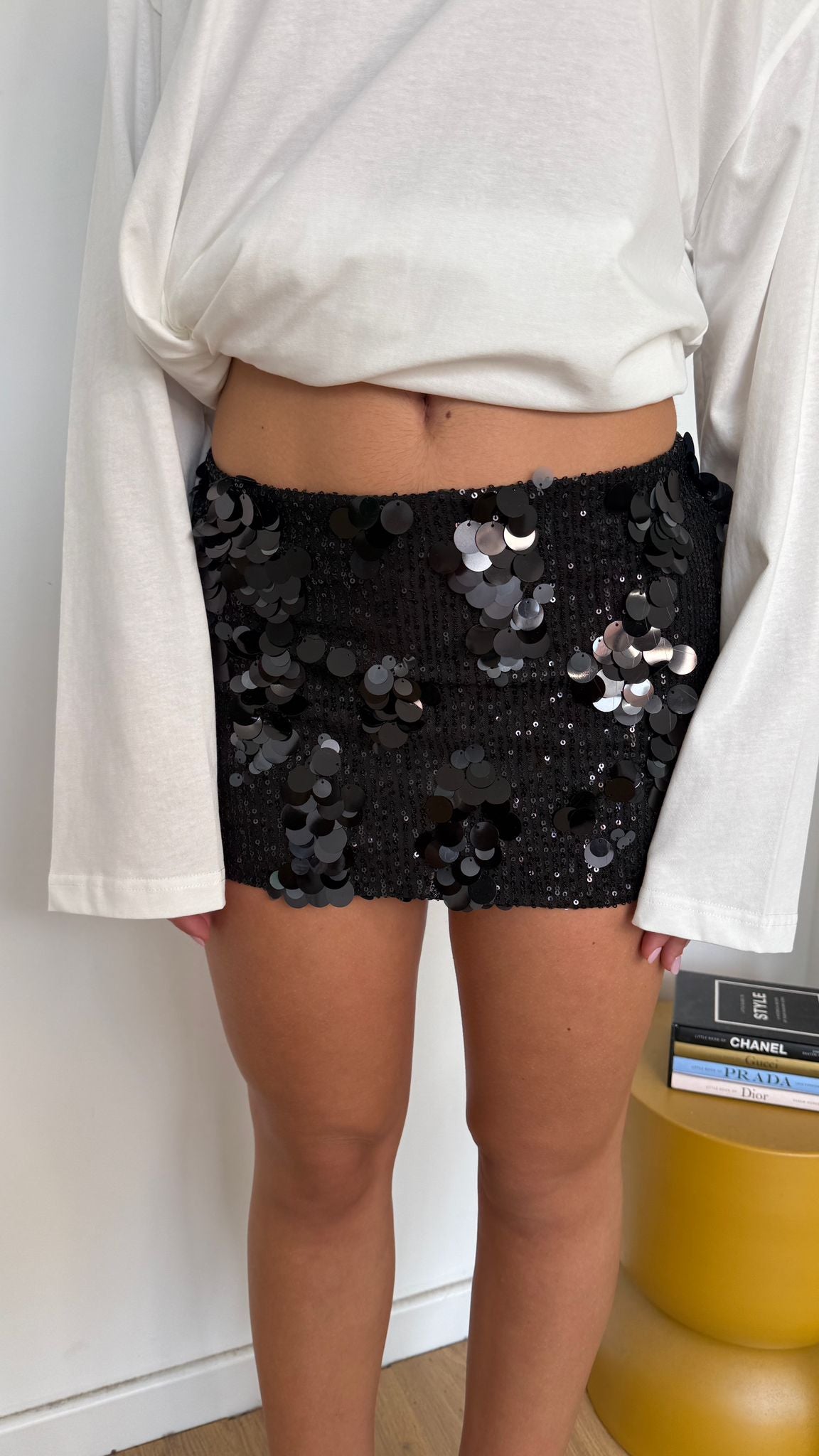 Gonna da donna con paillettes foderata internamente, tessuto elasticizzato e veste bene la propria taglia, la modella indossa taglia XS