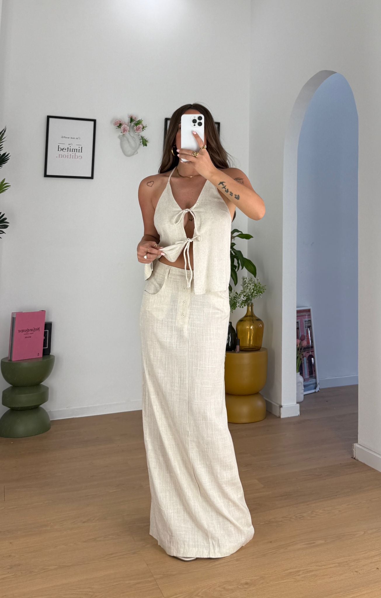 Gonna da donna in misto Lino a vita alta, veste regolarmente la propria taglia e Giusy indossa taglia e Giusy indossa taglia S