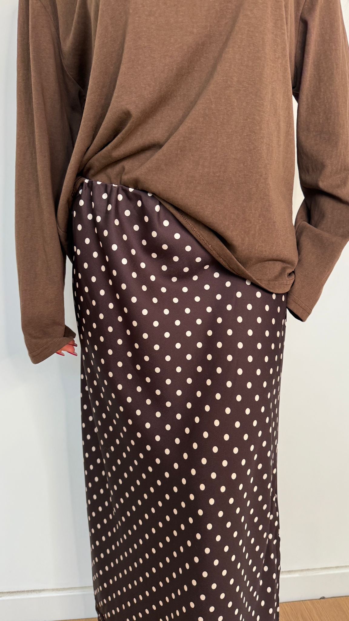 Gonna da donna in raso con pizzo sul finale e fantasia pois con elastico in vita interno e vestirà bene fino ad una 42 piena