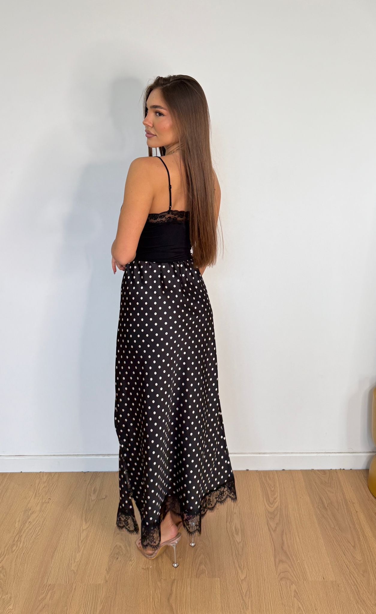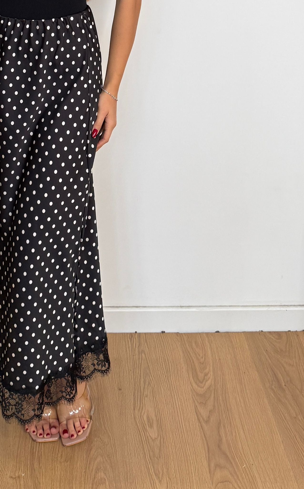 Gonna da donna in raso con pizzo sul finale e fantasia pois con elastico in vita interno e vestirà bene fino ad una 42 piena