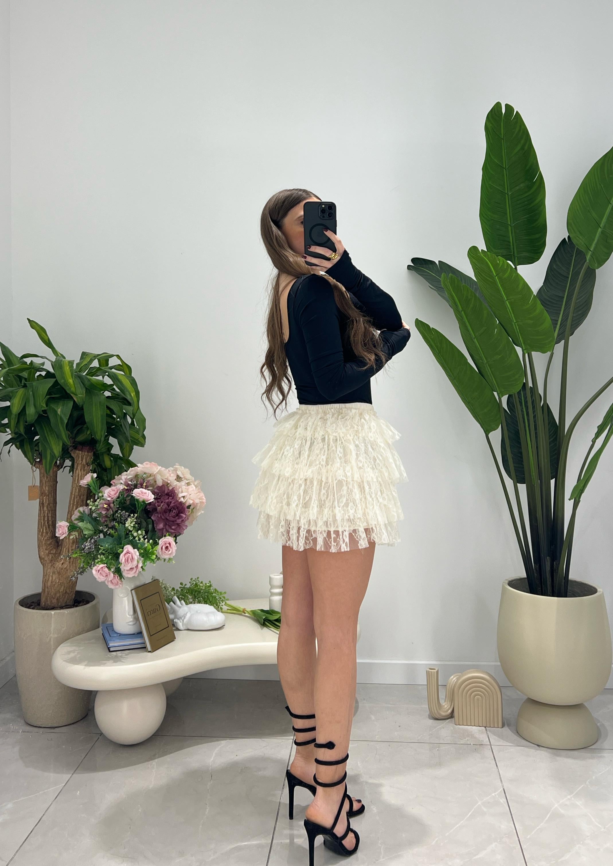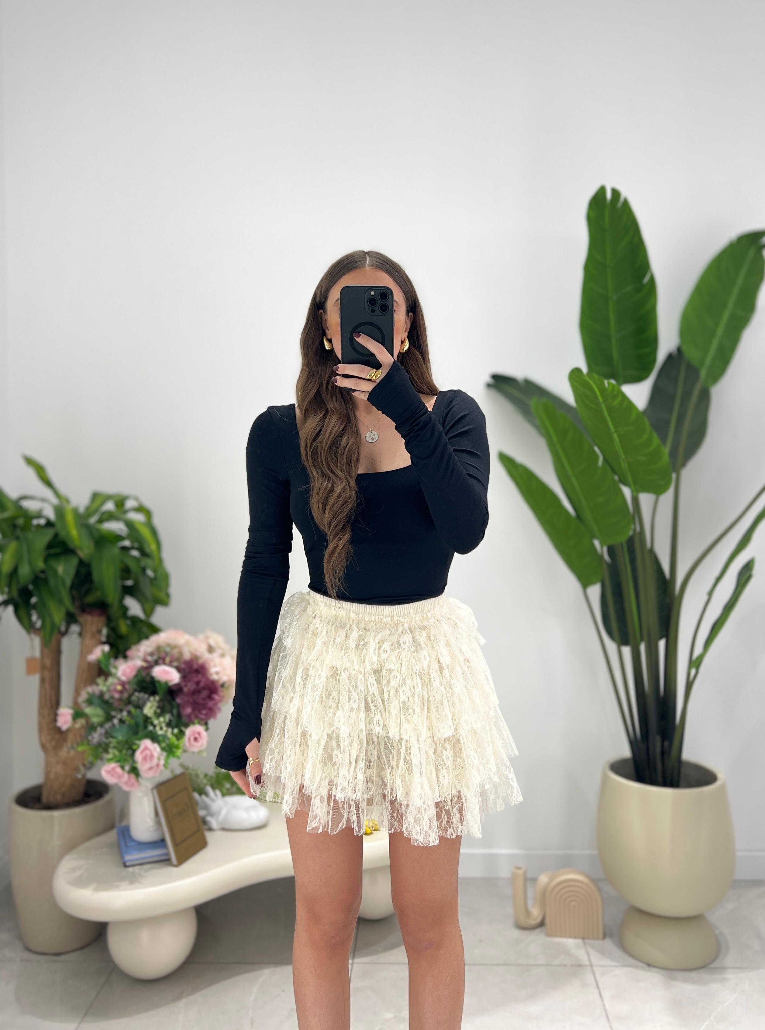 Gonna da donna con elastico in vita completamente in macramè, veste regolarmente la propria taglia e giusy indossa taglia S/M