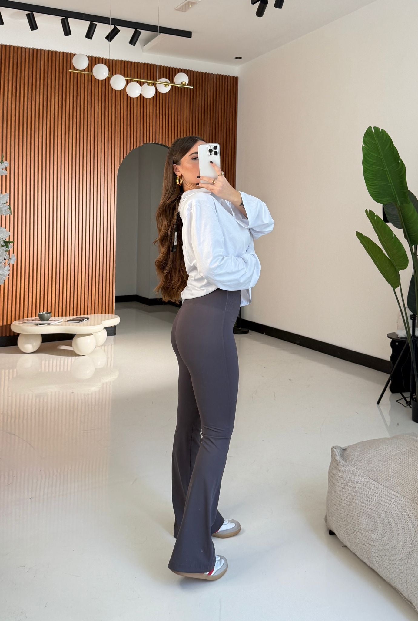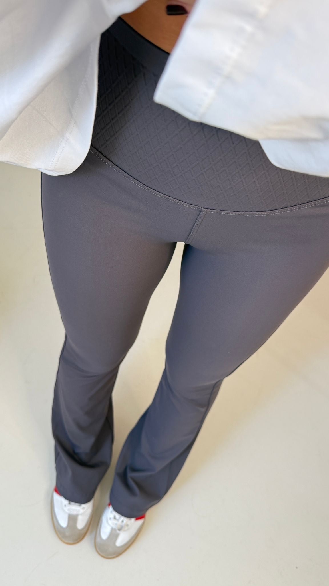 Leggings donna a zampa con elastico in vita, in lycra, tessuto elasticizzato. Veste regolarmente la propria taglia, la modella in foto indossa taglia XS/S ed è alta 1,65 e pesa 52/53 kg.