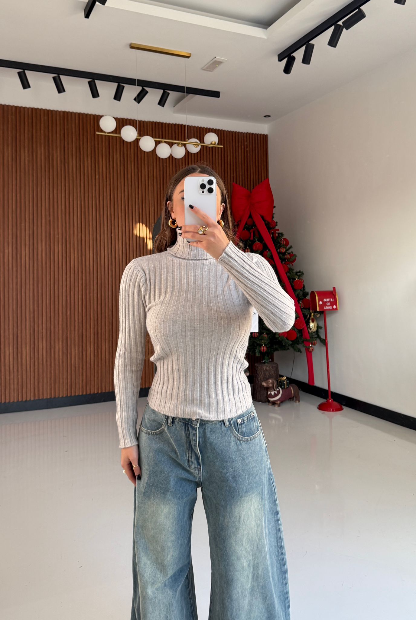 Maglioncino da donna in cotone, tessuto elasticizzato, collo alto, a costine. Taglia unica, veste bene fino ad una taglia 44/46.