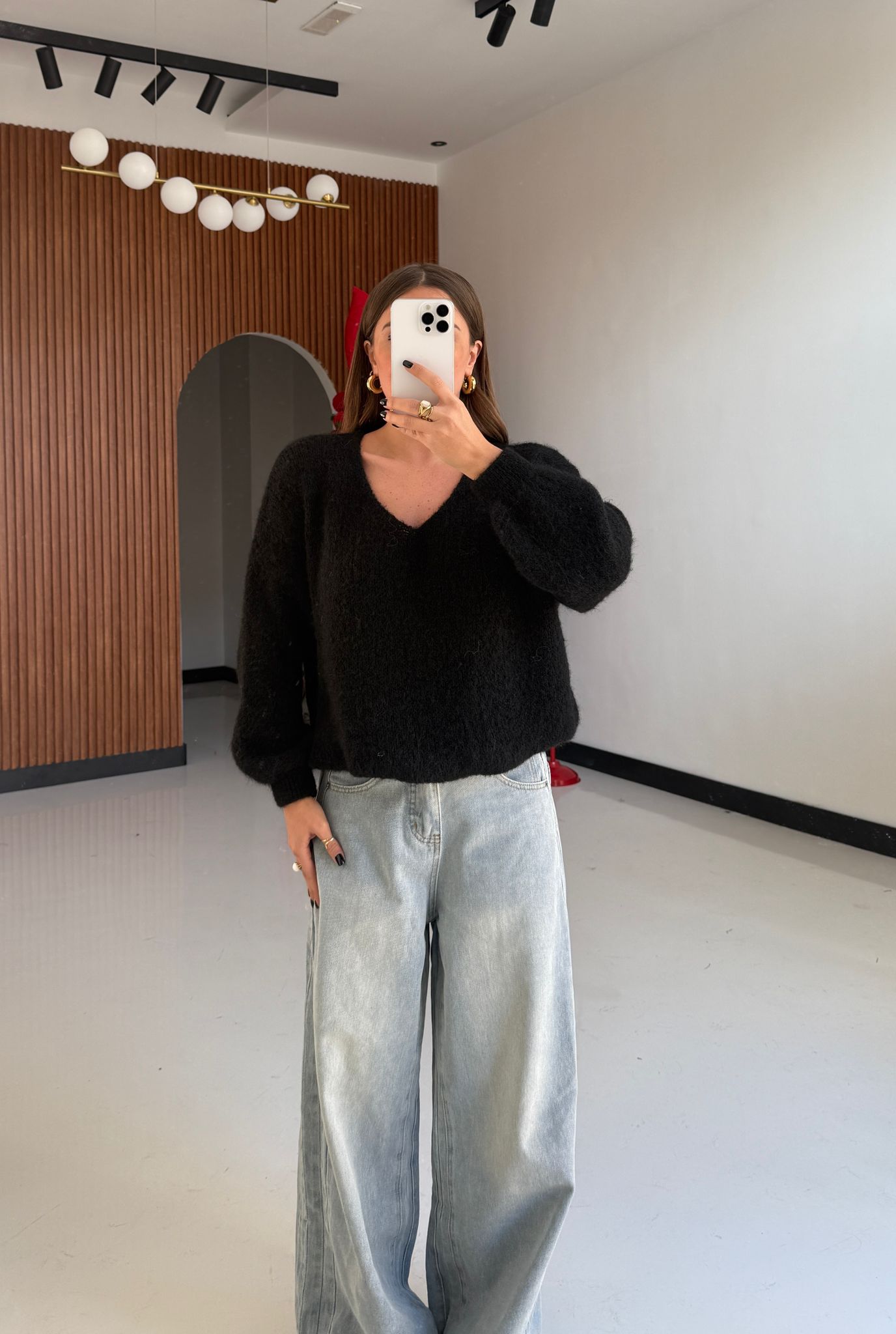 Maglione da donna in lana rasata con polsini e manica leggermente a sbuffo, vestibilità oversize e tessuto elasticizzato, vestirà bene fino ad una M/L piena