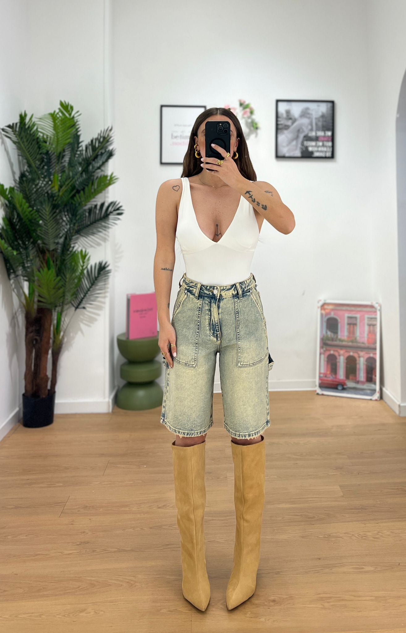 Bermuda da donna in denim effetto slavato tessuto elasticizzato ma veste regolarmente la propria taglia e giusy indossa taglia XS
