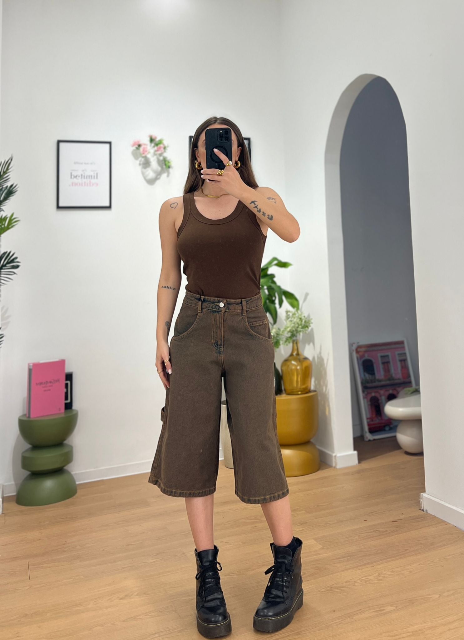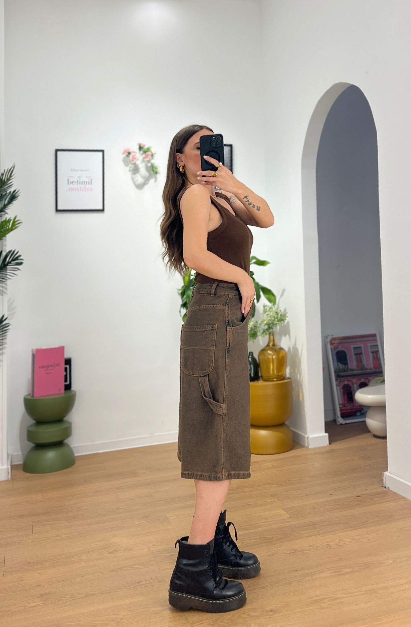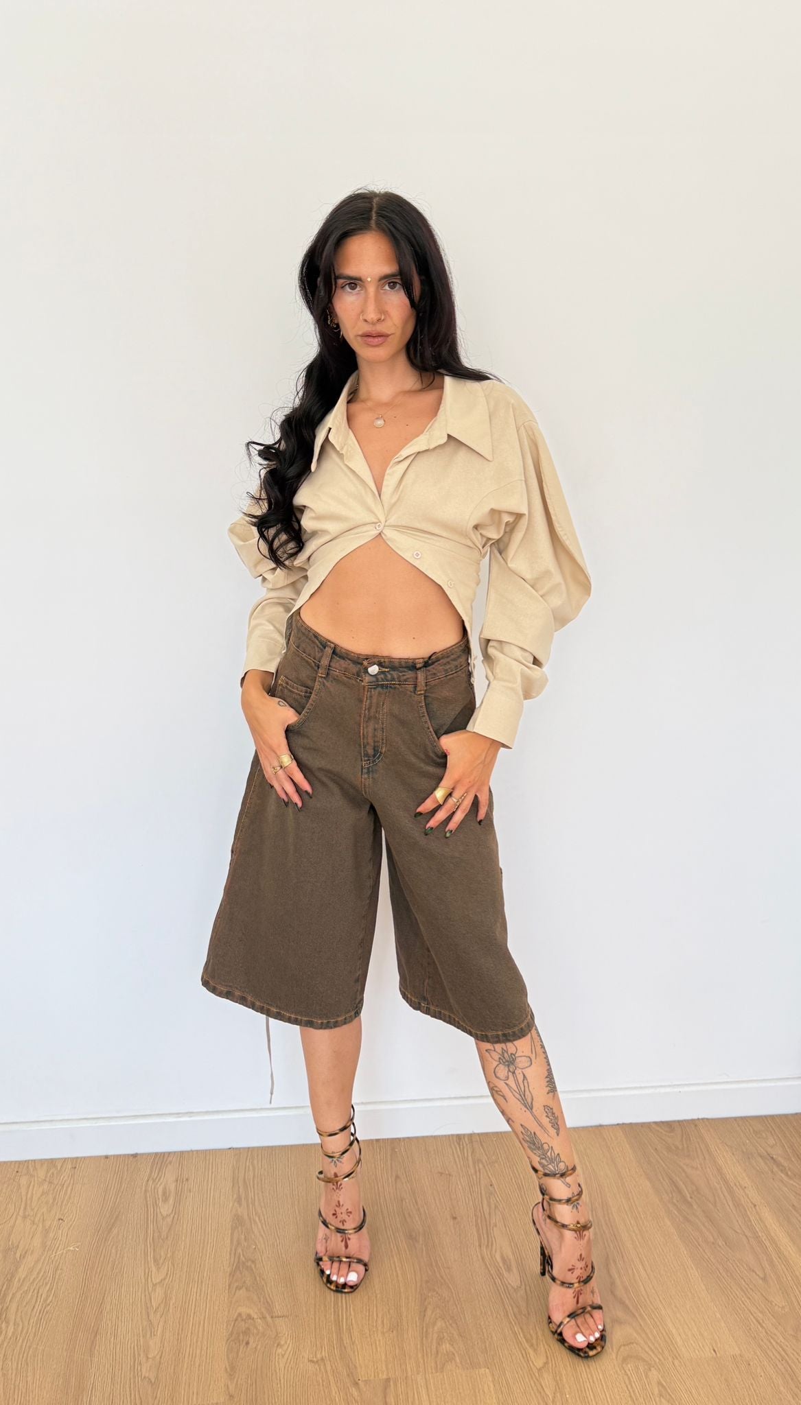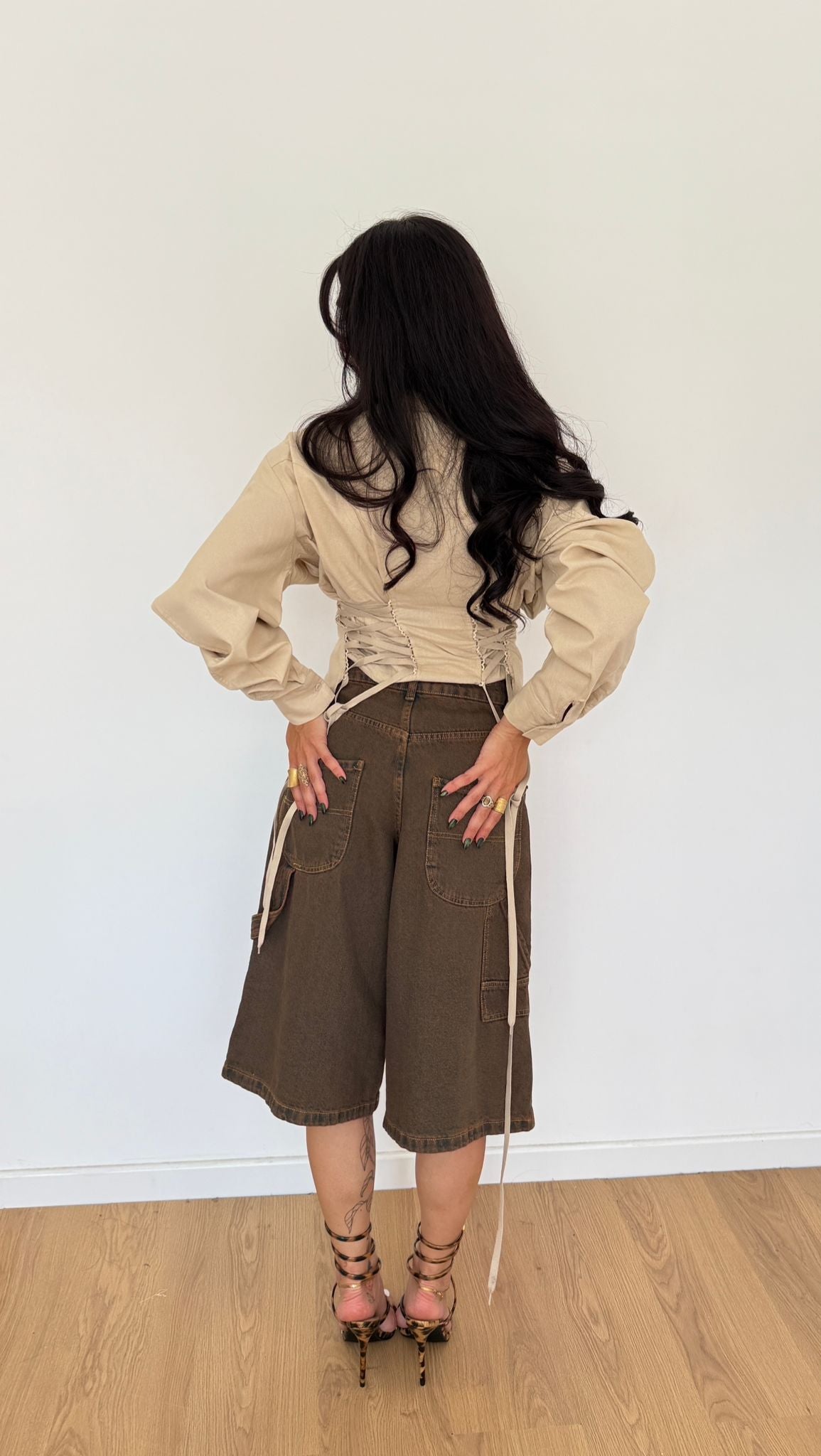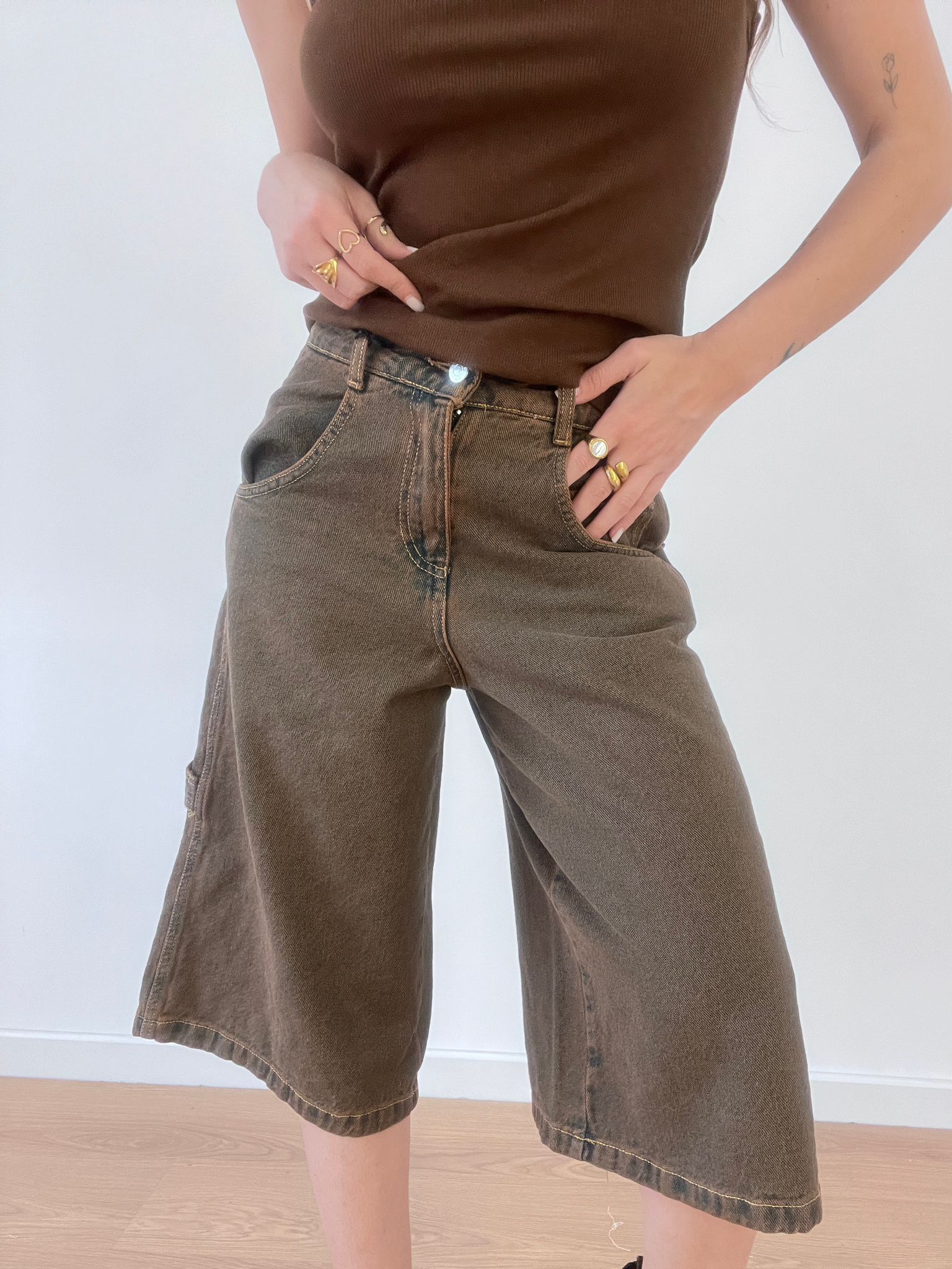 Bermuda in denim, modello carpenter. Vestibilità over, Giusy indossa la taglia XS.