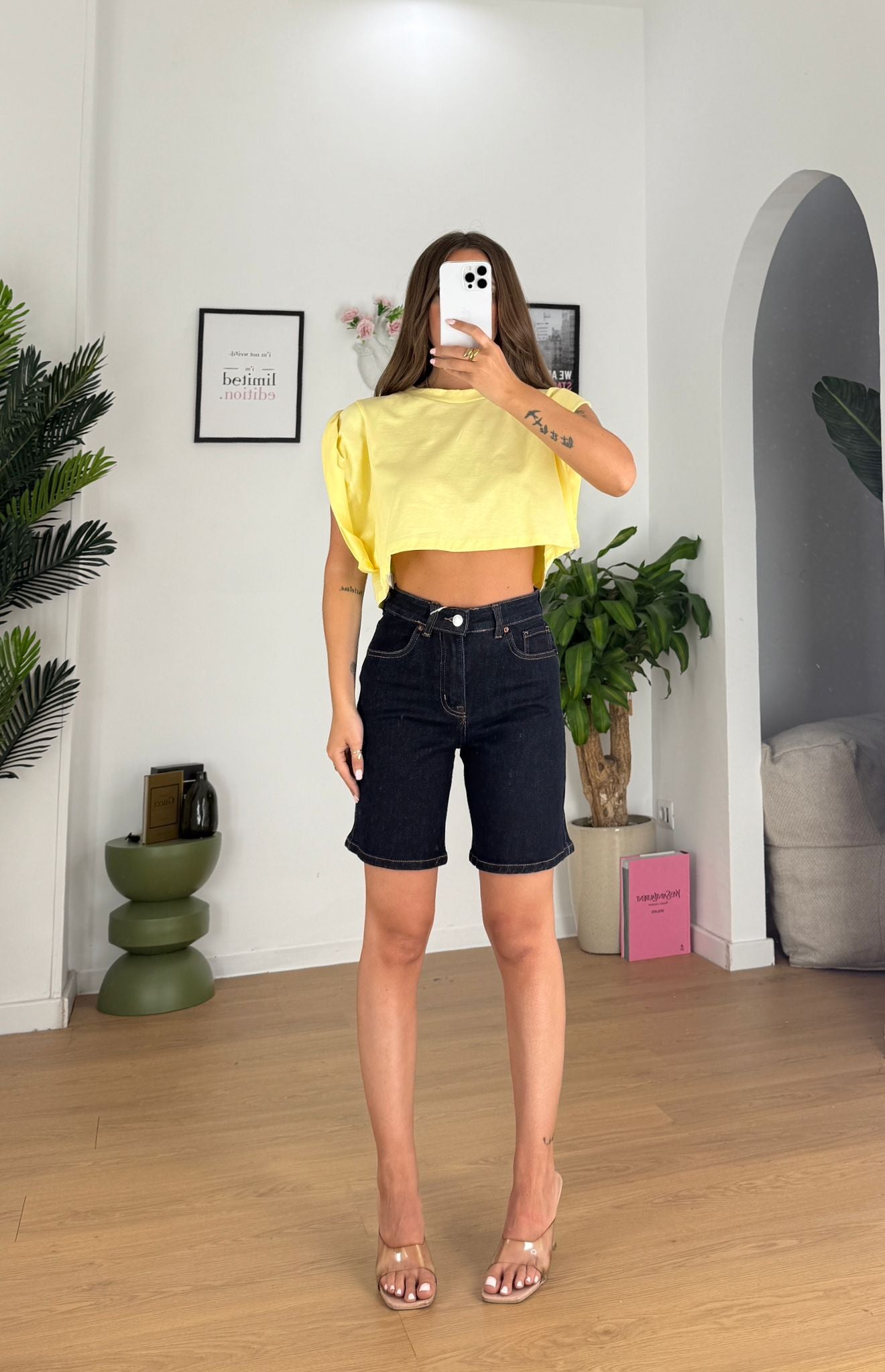 Bermuda da donna in denim scuro tessuto elasticizzato ma veste regolarmente la propria taglia e Giusy indossa XS