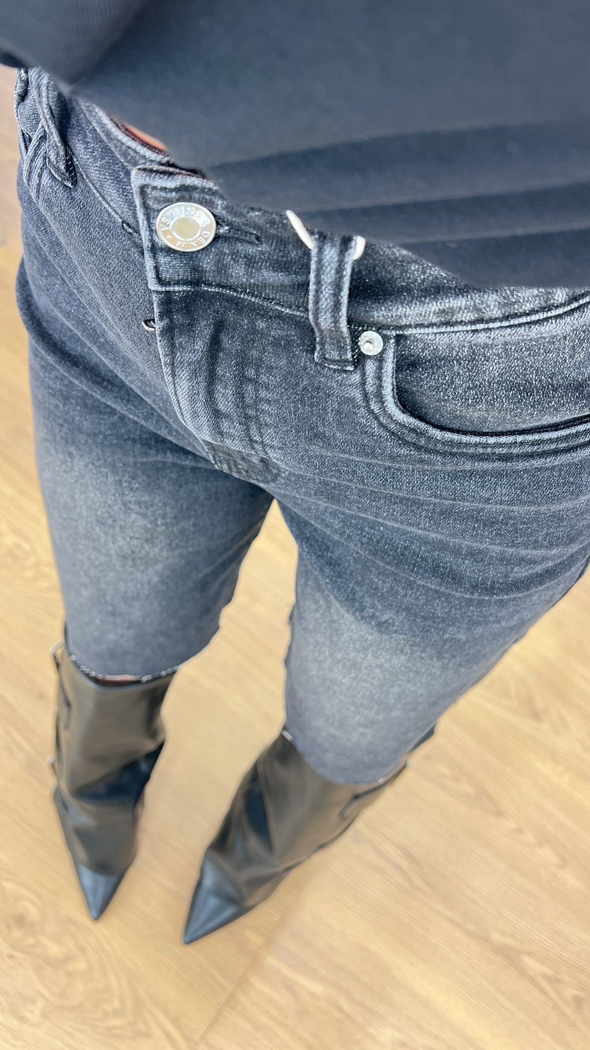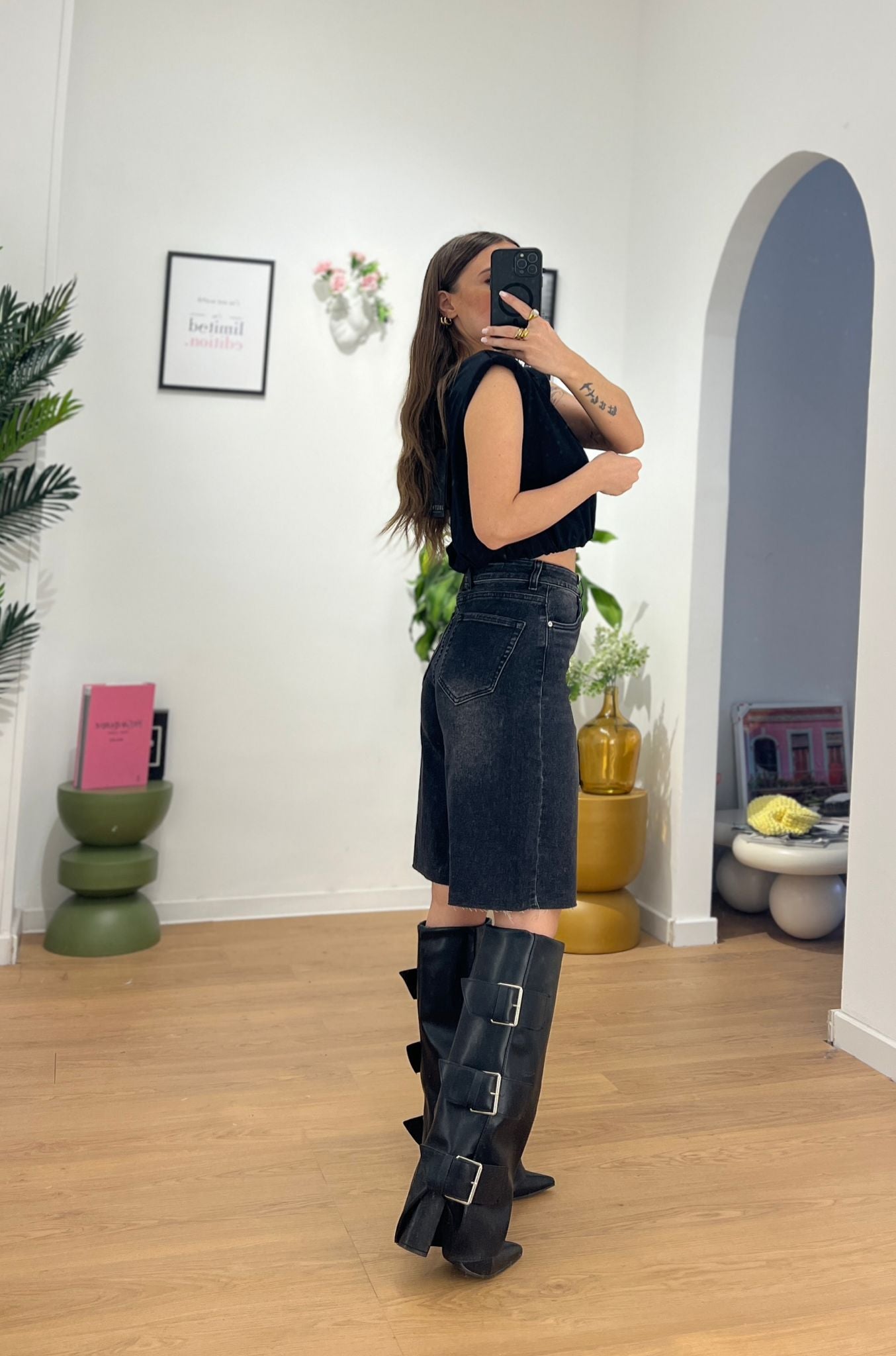 Bermuda in denim elasticizzato, con taglio vivo sul fondo. Giusy indossa la taglia XS.