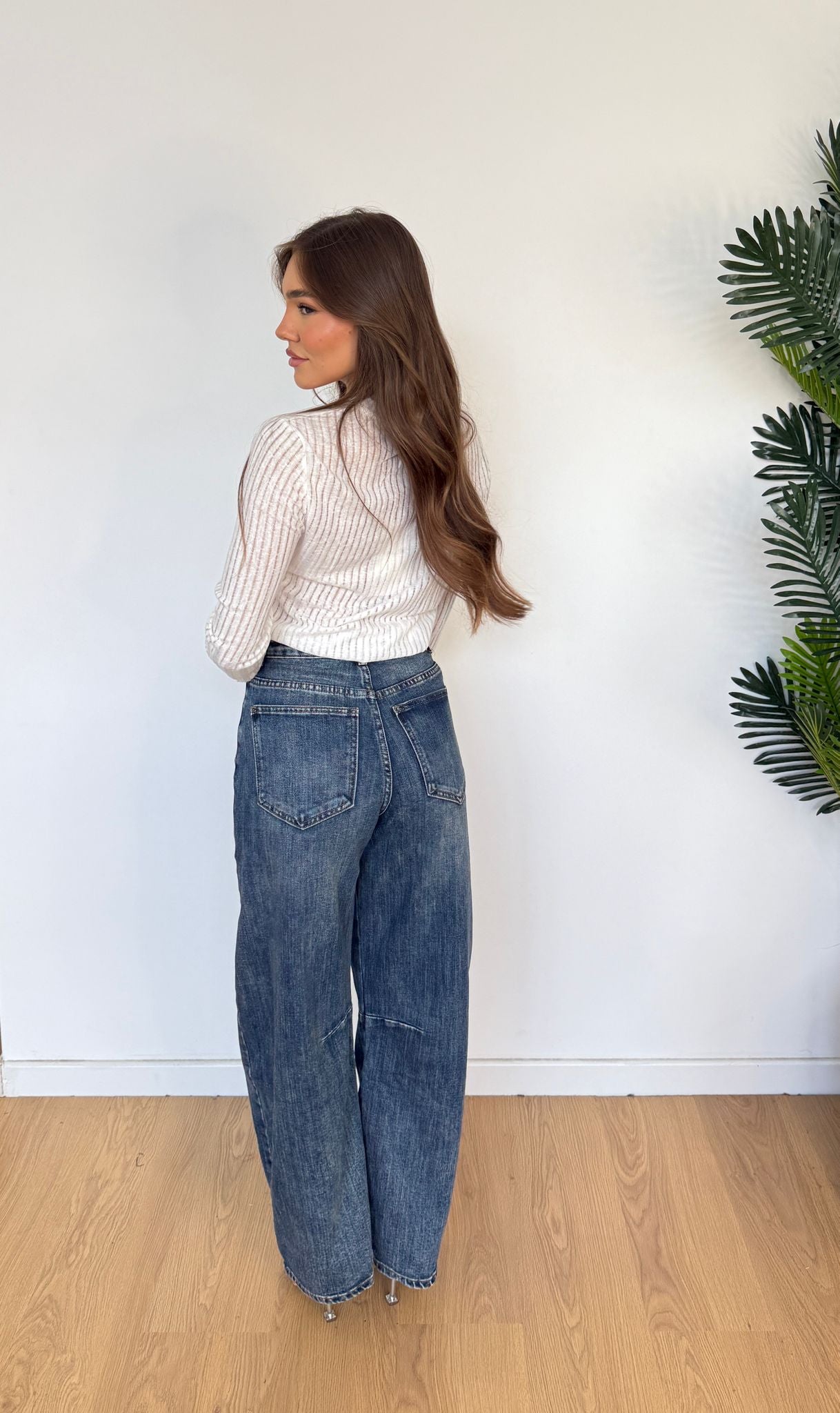 Jeans da donna in denim simi elasticizzato modello ballon e veste regolarmente la propria taglia e la modella indossa taglia XS