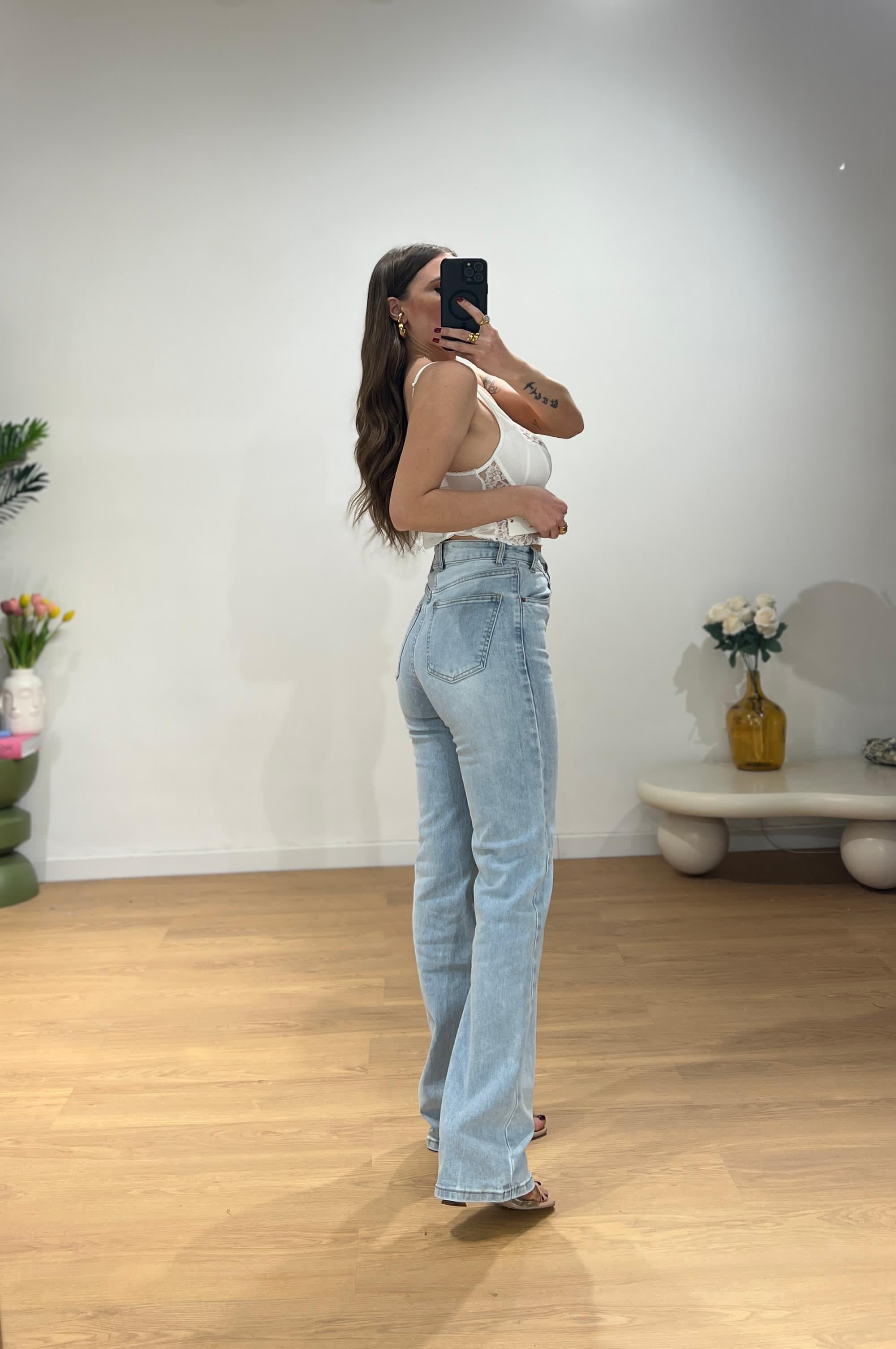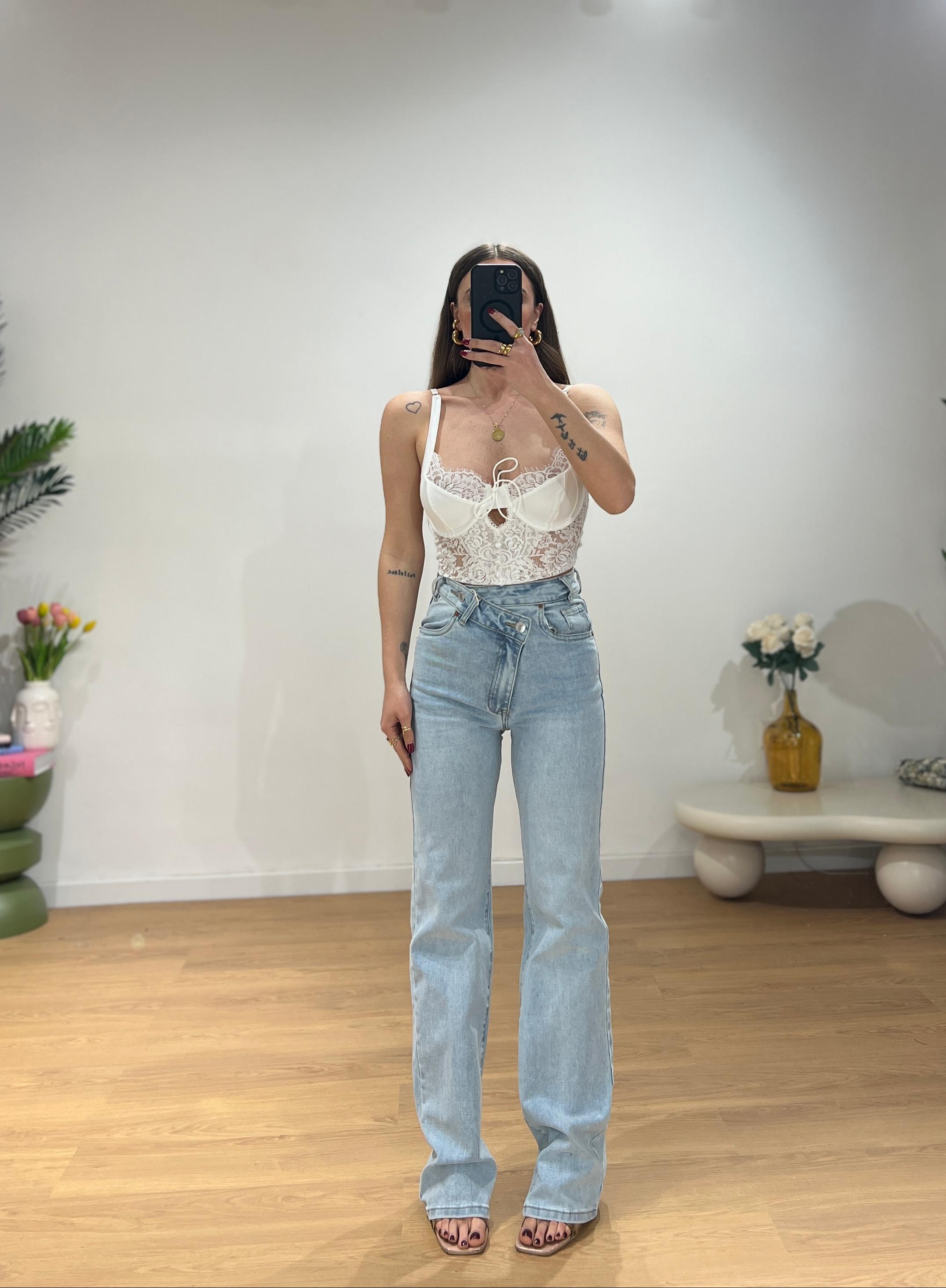 Jeans da donna in denim chiaro tessuto elasticizzato con chiusura a doppio bottone, veste regolarmente la propria taglia e Giusy indossa taglia XS