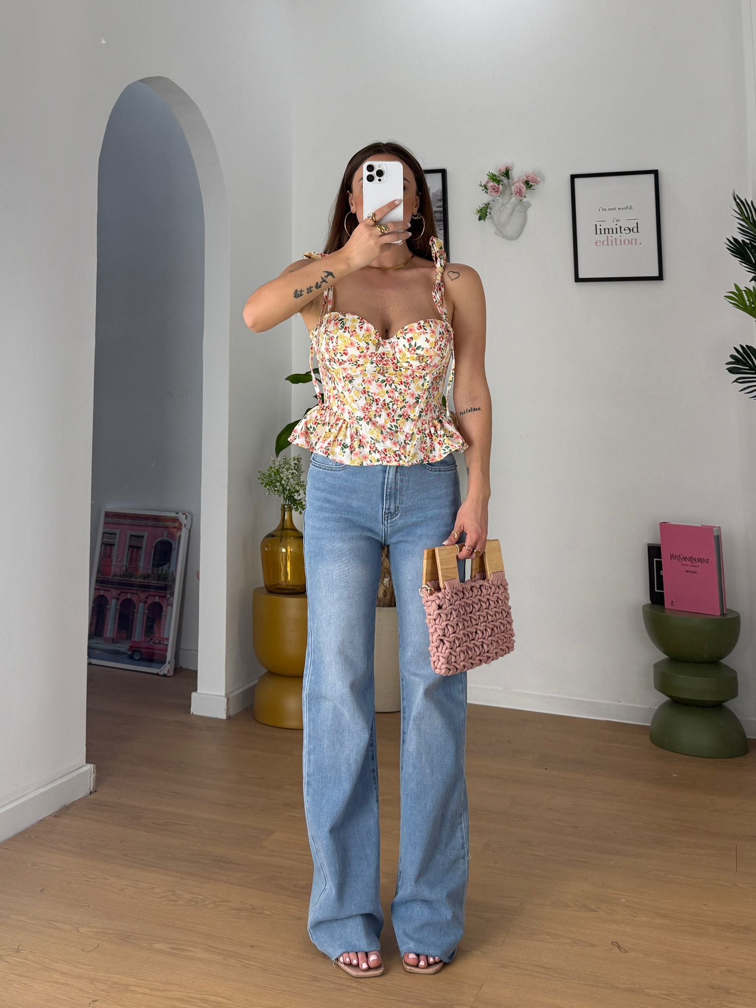 Jeans da donna in denim chiaro modello wide leg tessuto elasticizzato ma veste regolarmente la propria taglia e Giusy indossa taglia XS
