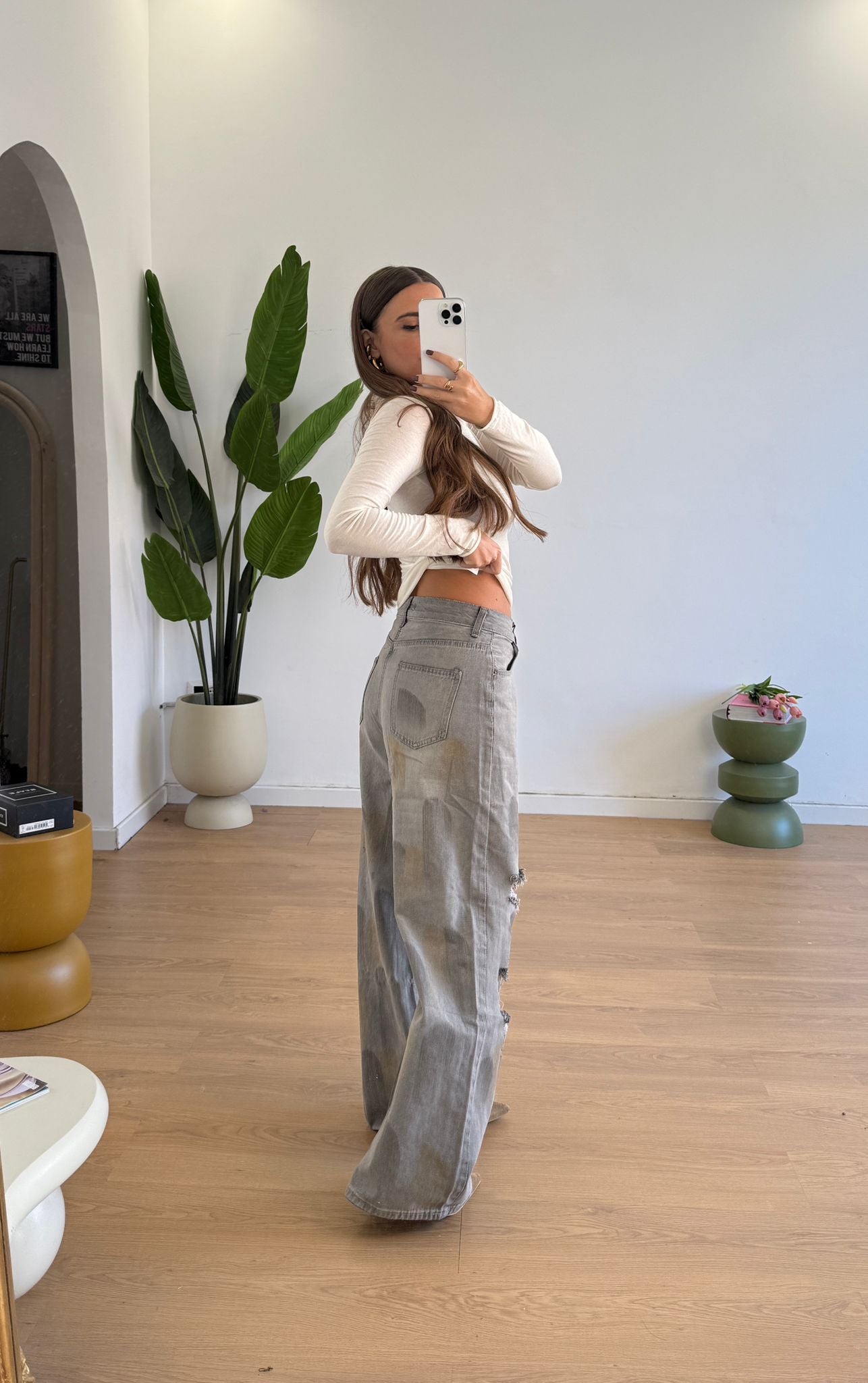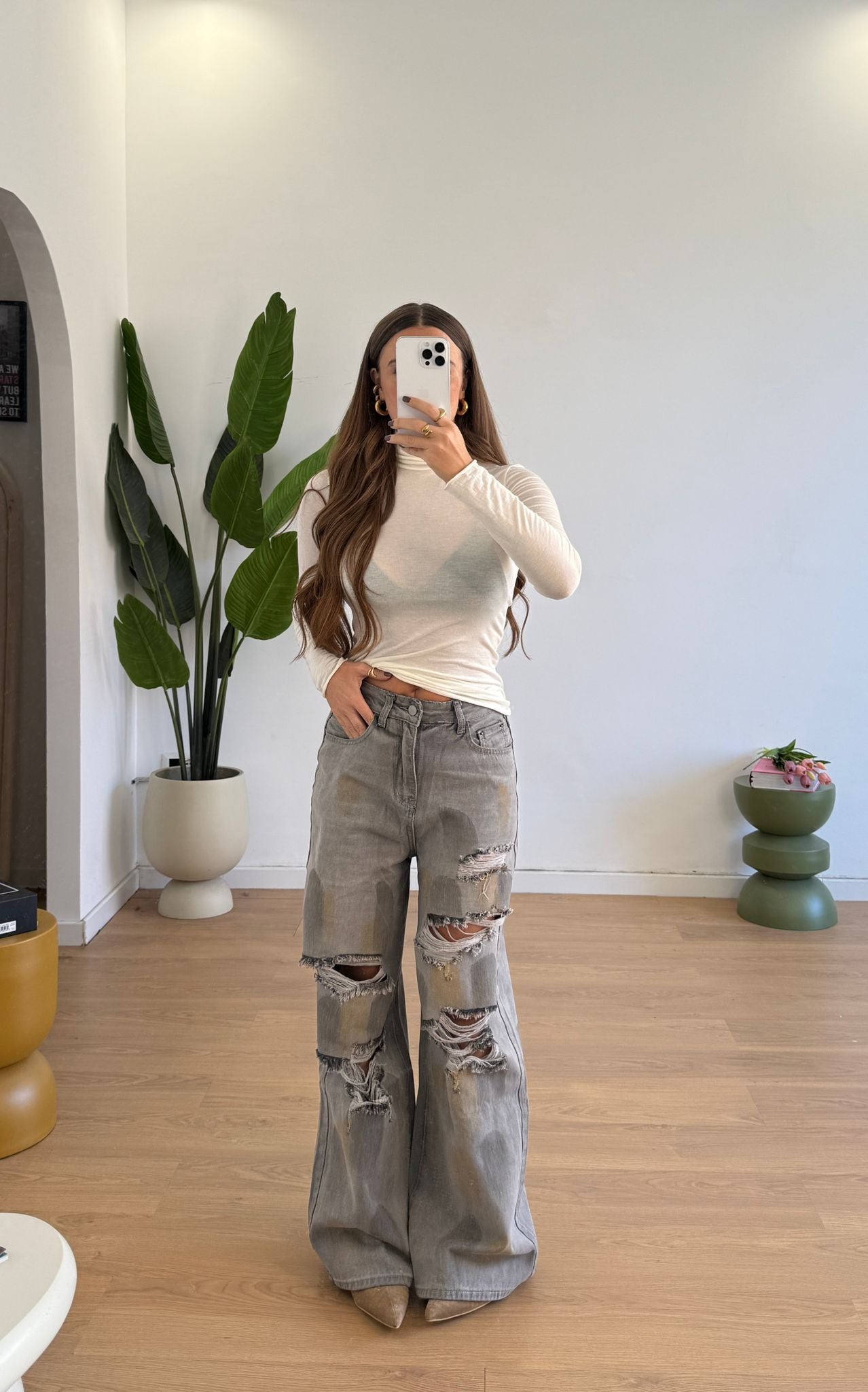 Jeans da donna in denim grigio in tela fissa non elasticizzato ma veste regolarmente la propria taglia e la modella indossa taglia S