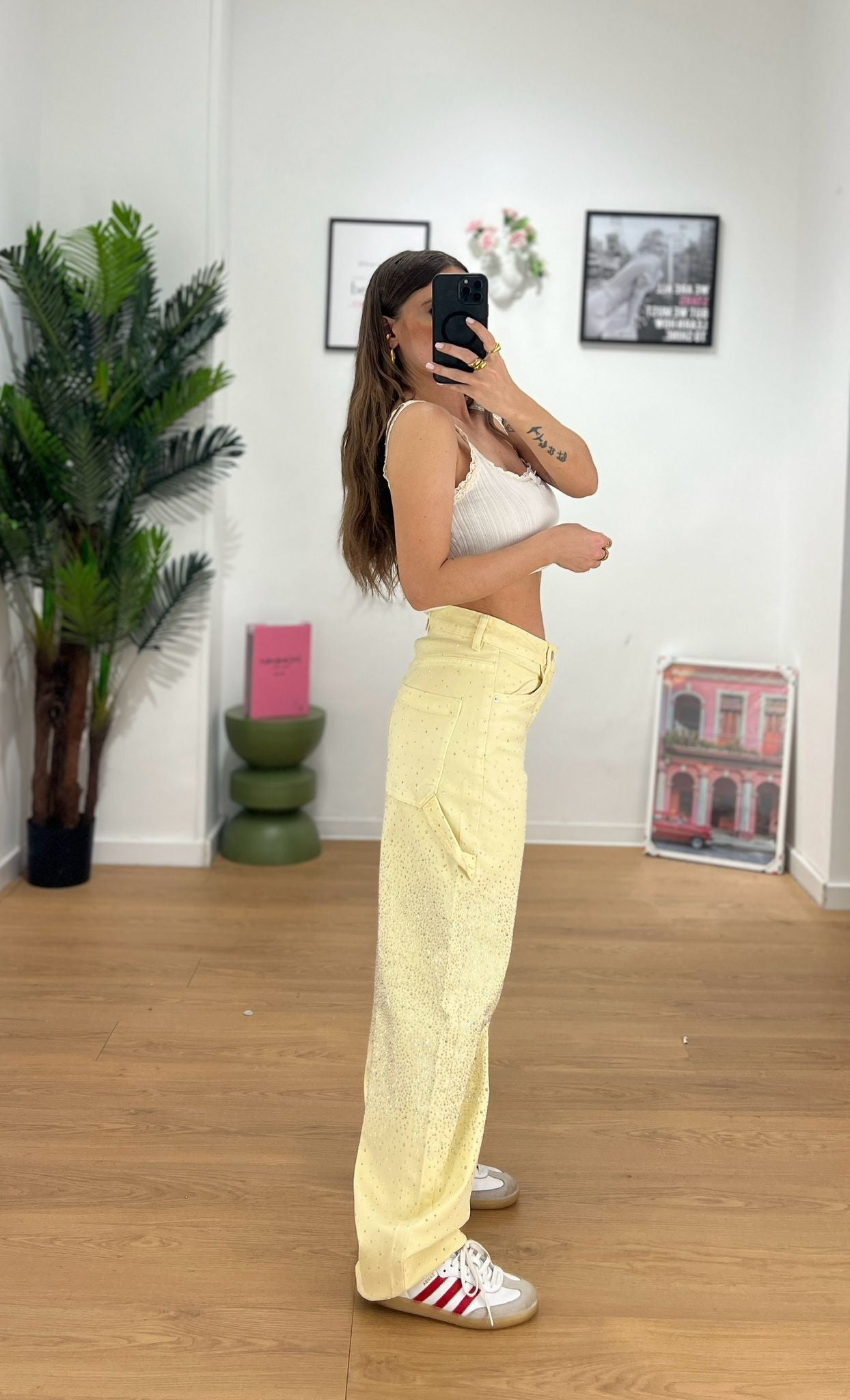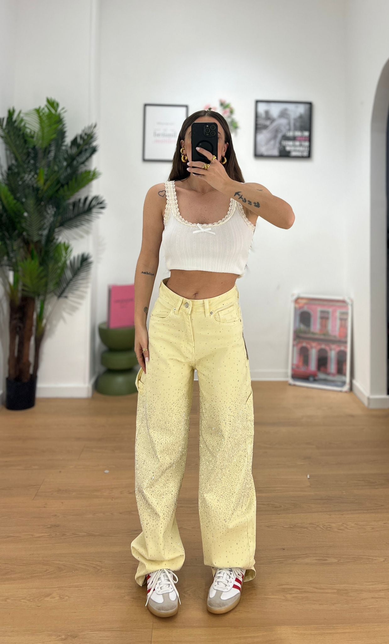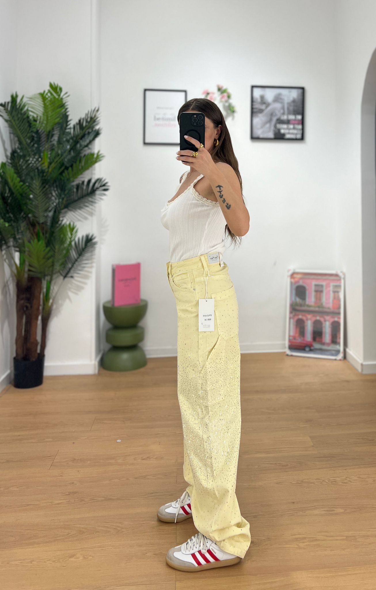 Jeans da donna modello ballon fit ricoperto completamente di strass e Giusy indossa taglia XS