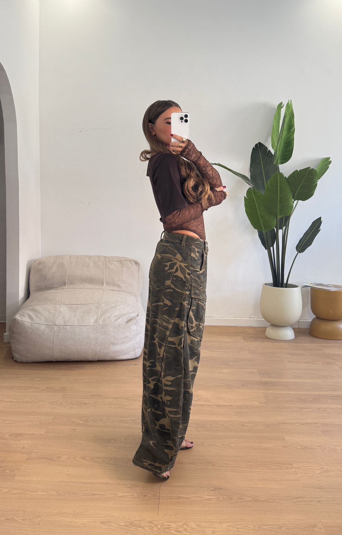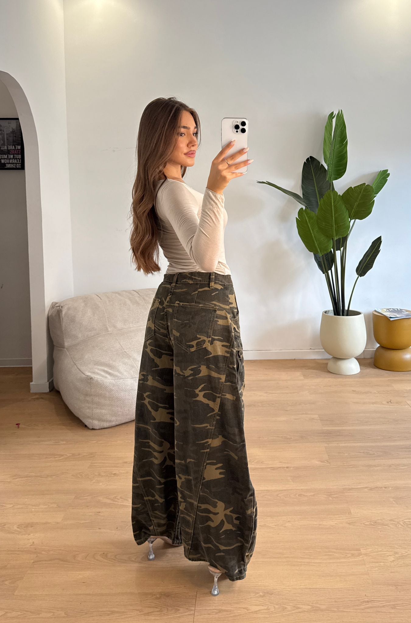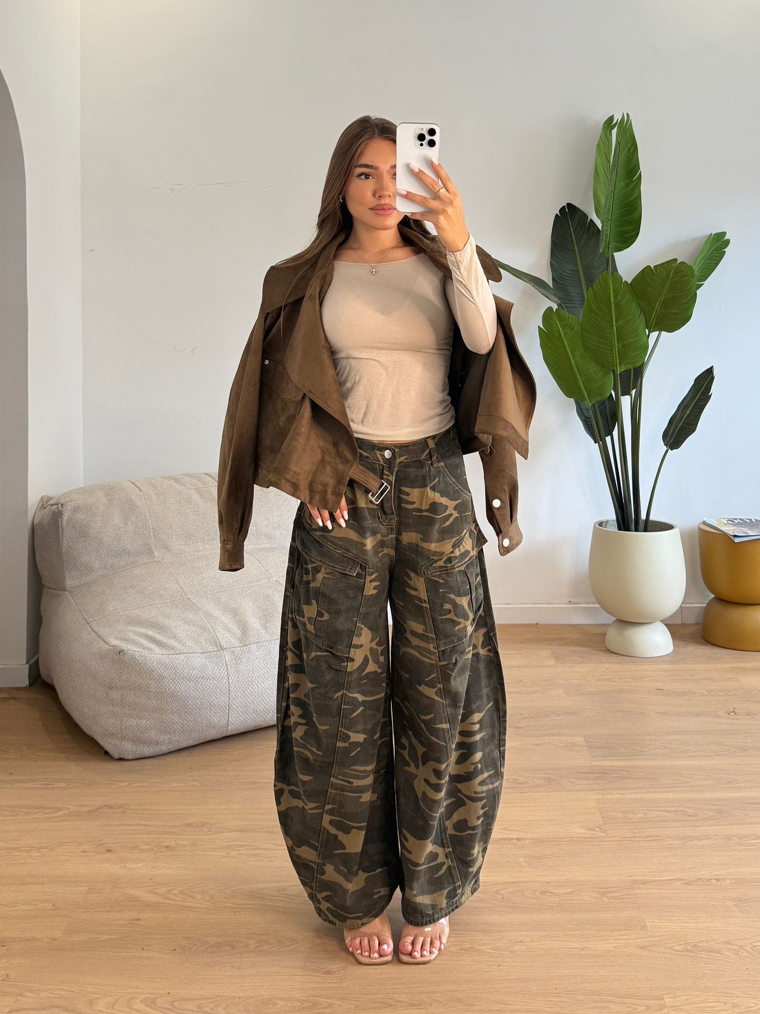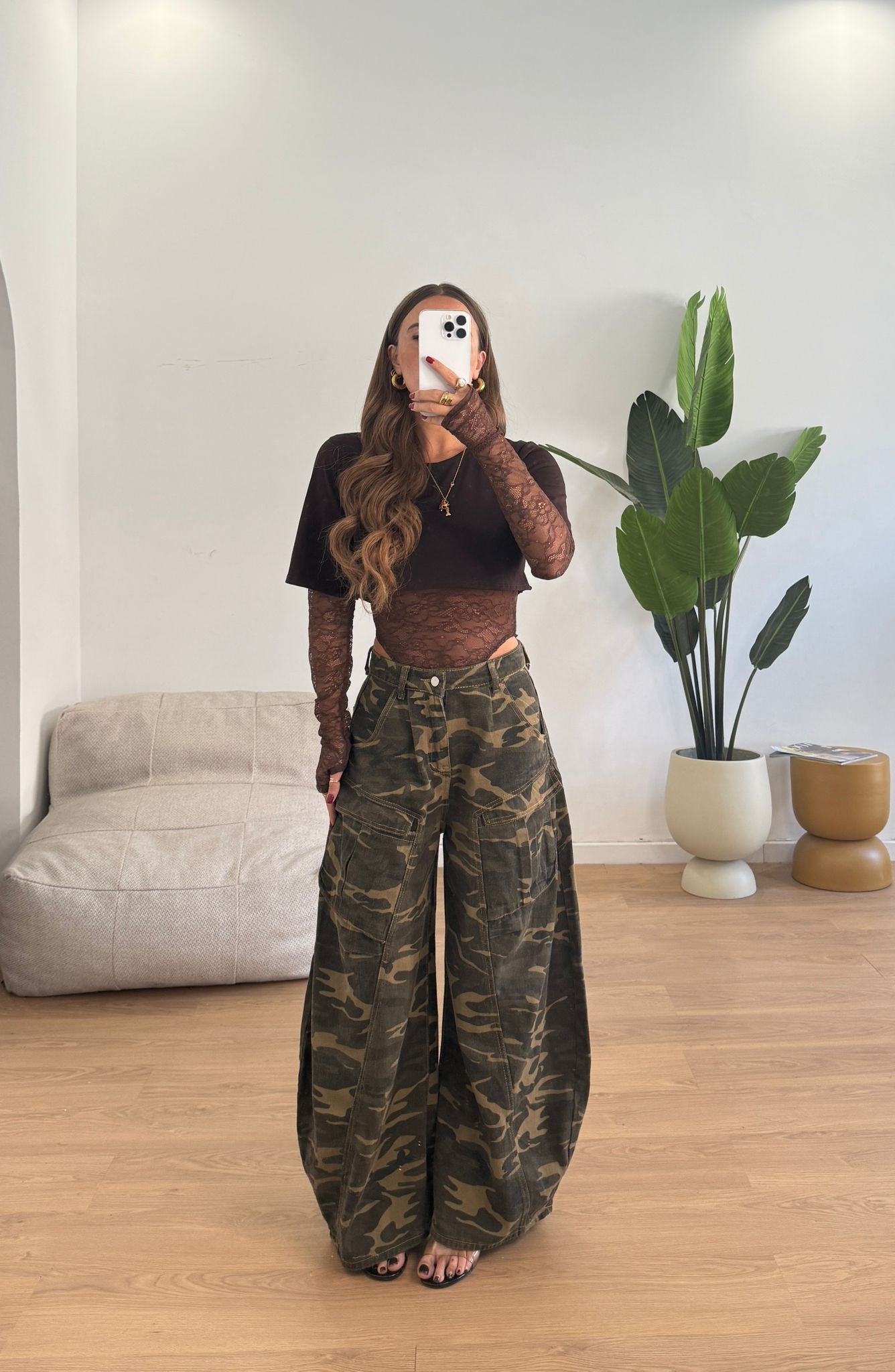 Jeans da donna modello ballon fantasia militare tela fissa e veste regolarmente la propria taglia e la modella indossa taglia S